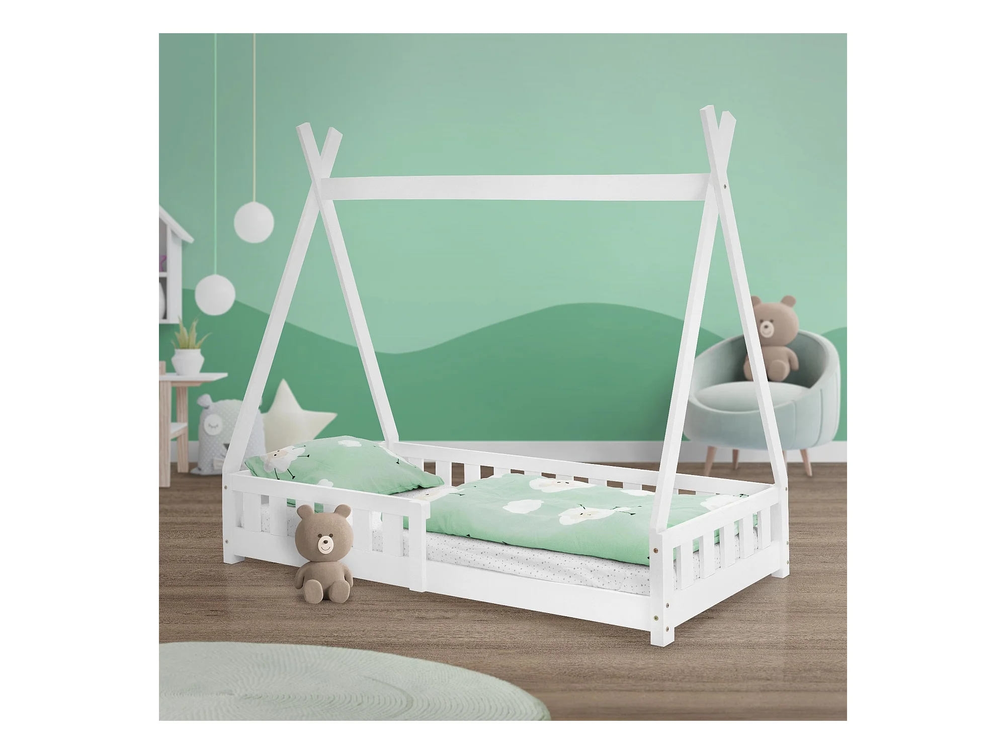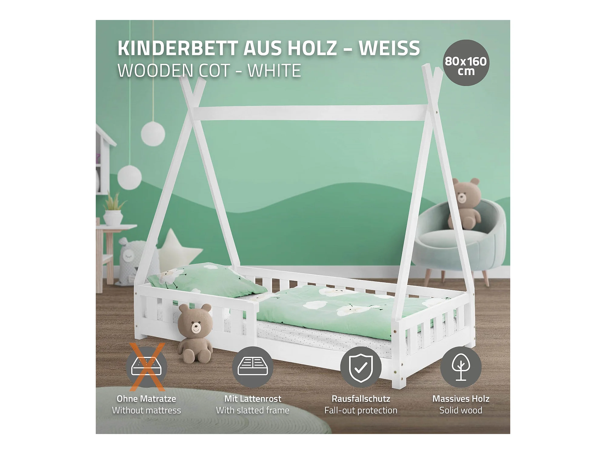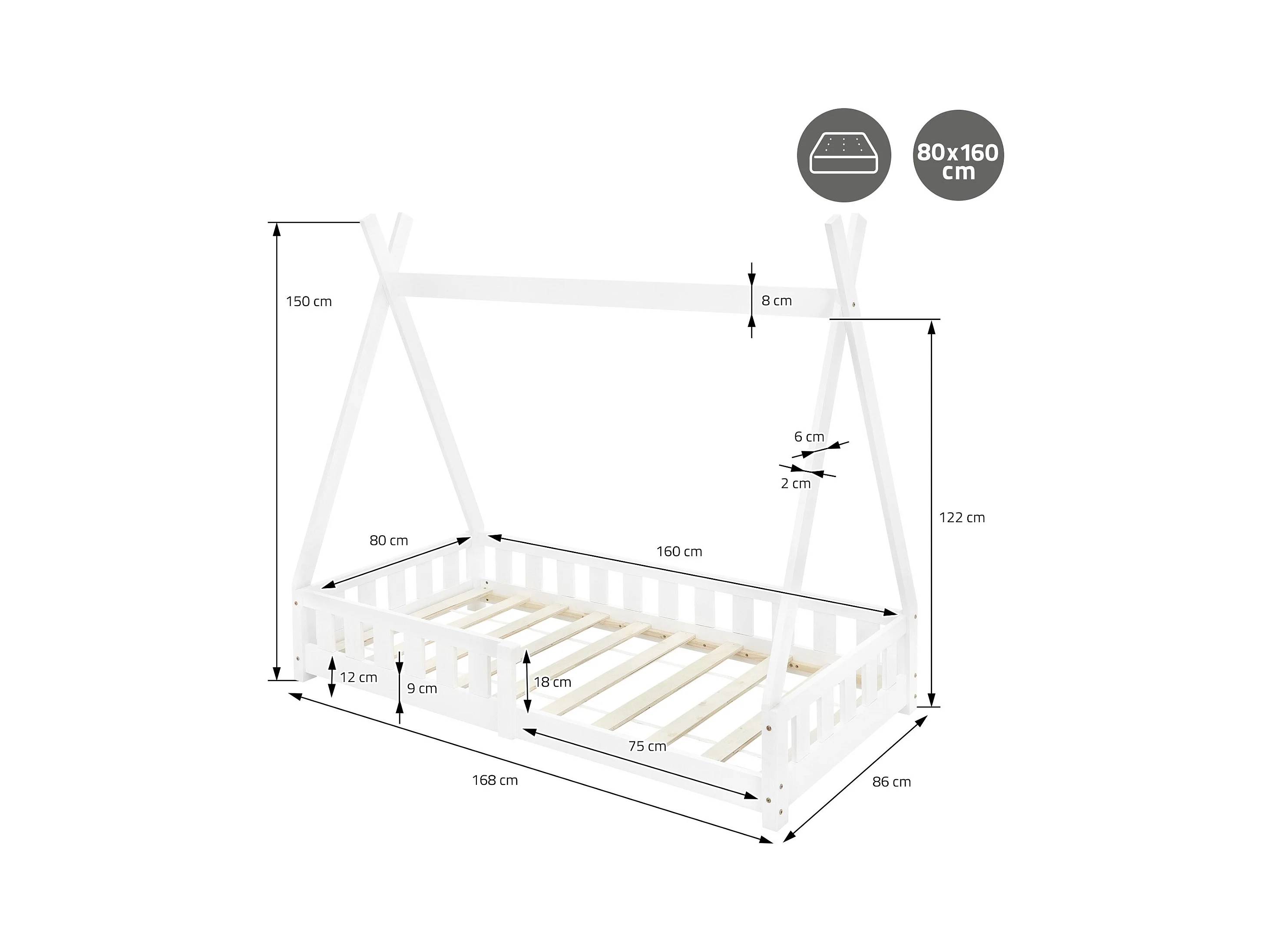 ML-Design Cama infantil tipi 80x160cm color blanco con protección anticaída y somier mobiliario con estructura de listones madera de pino maciza
