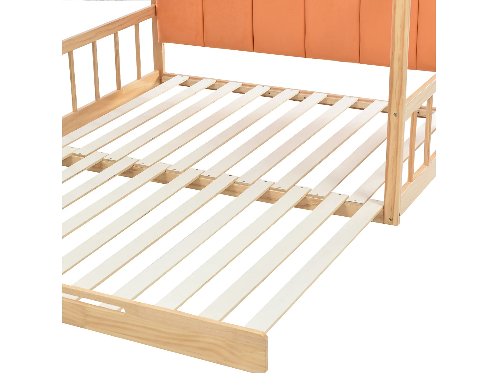 Cama infantil extensible tipo cabaña de 140x100-200 cm con cama nido, estructura de pino, cojines de terciopelo, madera natural y color naranja.