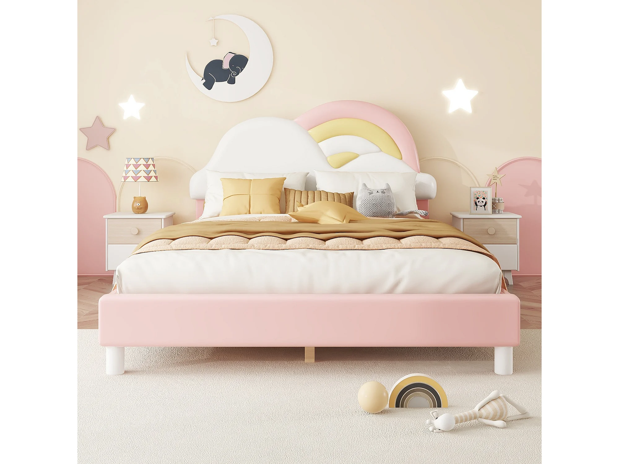 Cama infantil individual 140x200cm, cama acolchada con suave cabecero de nube arcoíris, somier de láminas de madera, PU, rosa