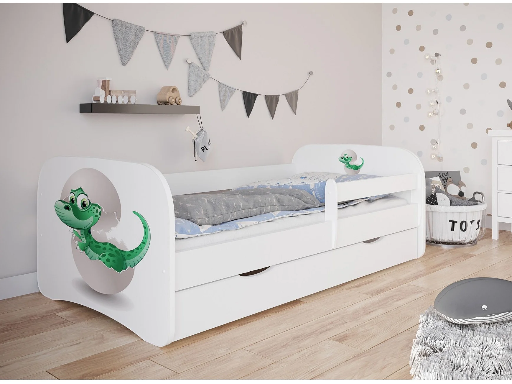 Cama infantil pequeña dinosaurio con somieres y barrera de seguridad extraíble Drimy-Ropa de cama 80x180 cm
