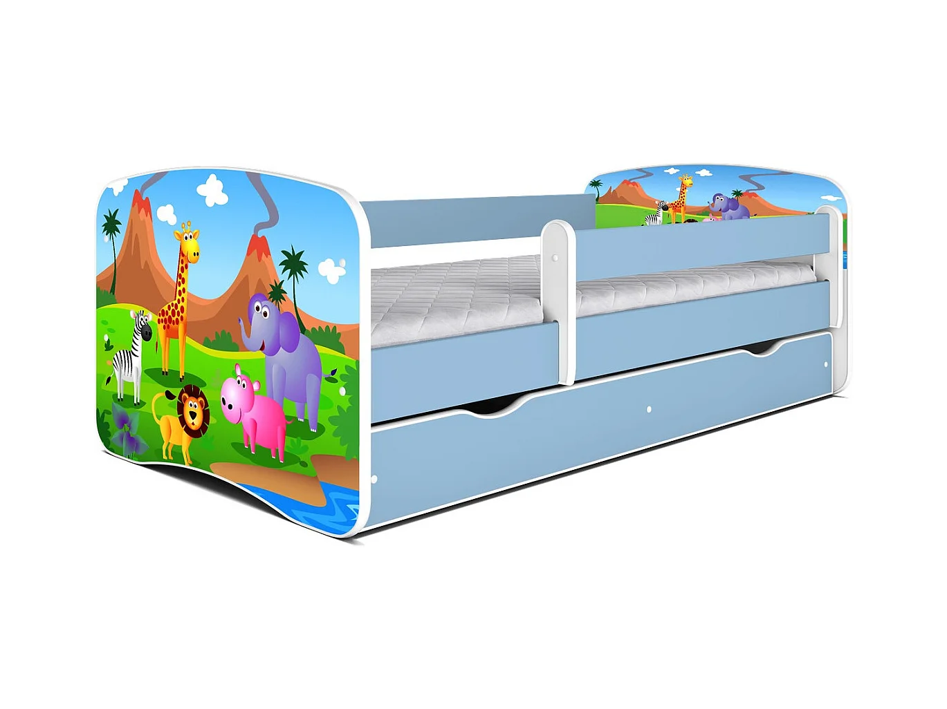Cama infantil Safari azul con somieres y barrera de seguridad extraíble Drimy-Ropa de cama 70x140 cm-Cajones Con cajón