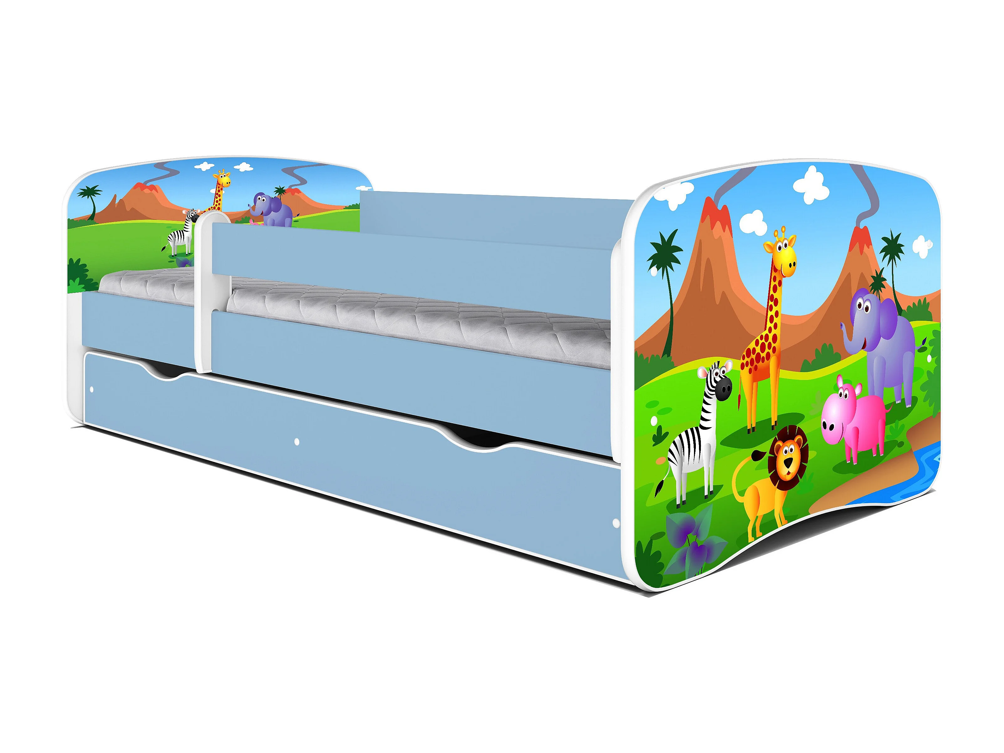 Cama infantil Safari azul con somieres y barrera de seguridad extraíble Drimy-Colchones de espuma-Ropa de cama 80x180 cm-Cajones Con cajón