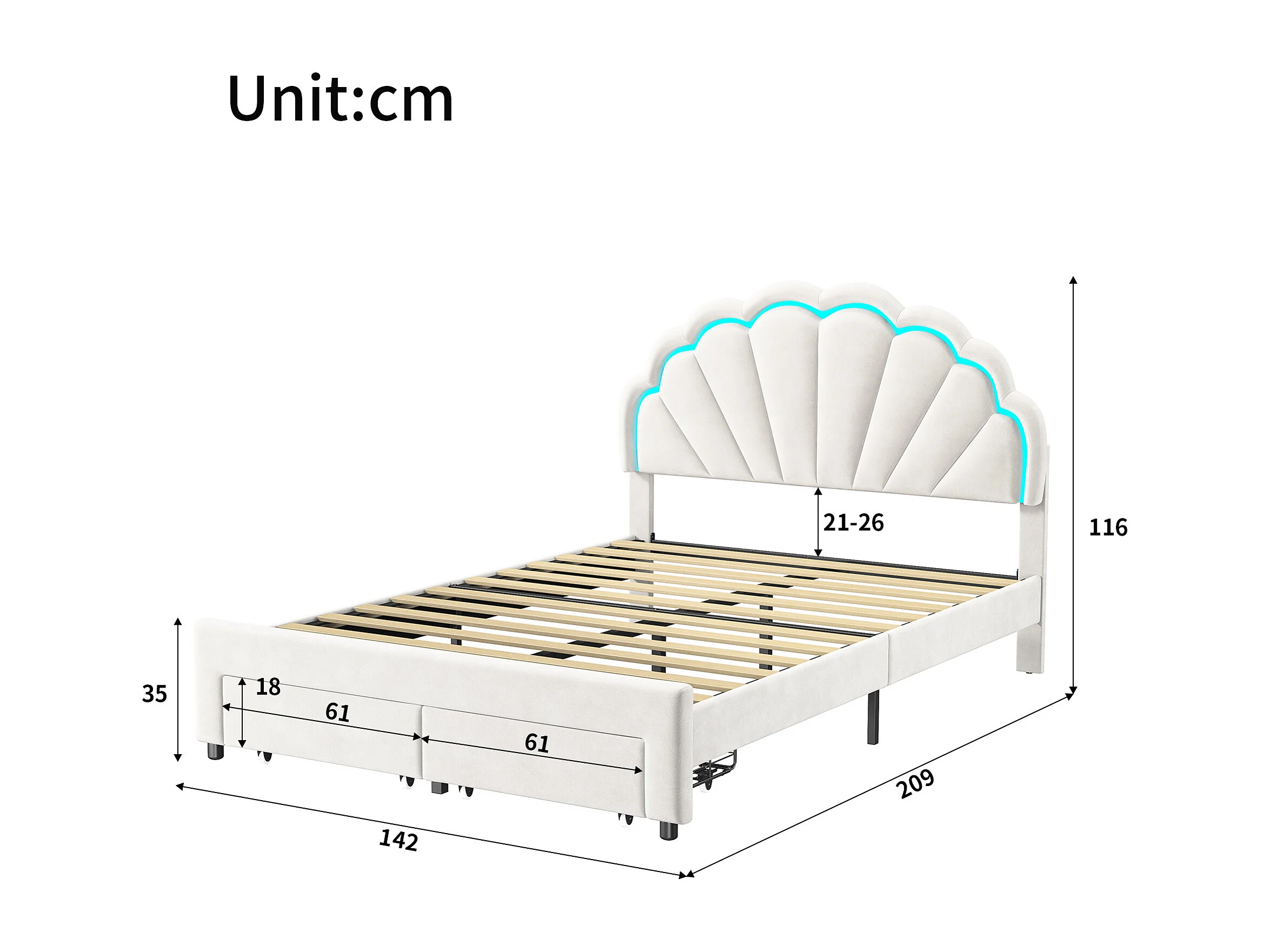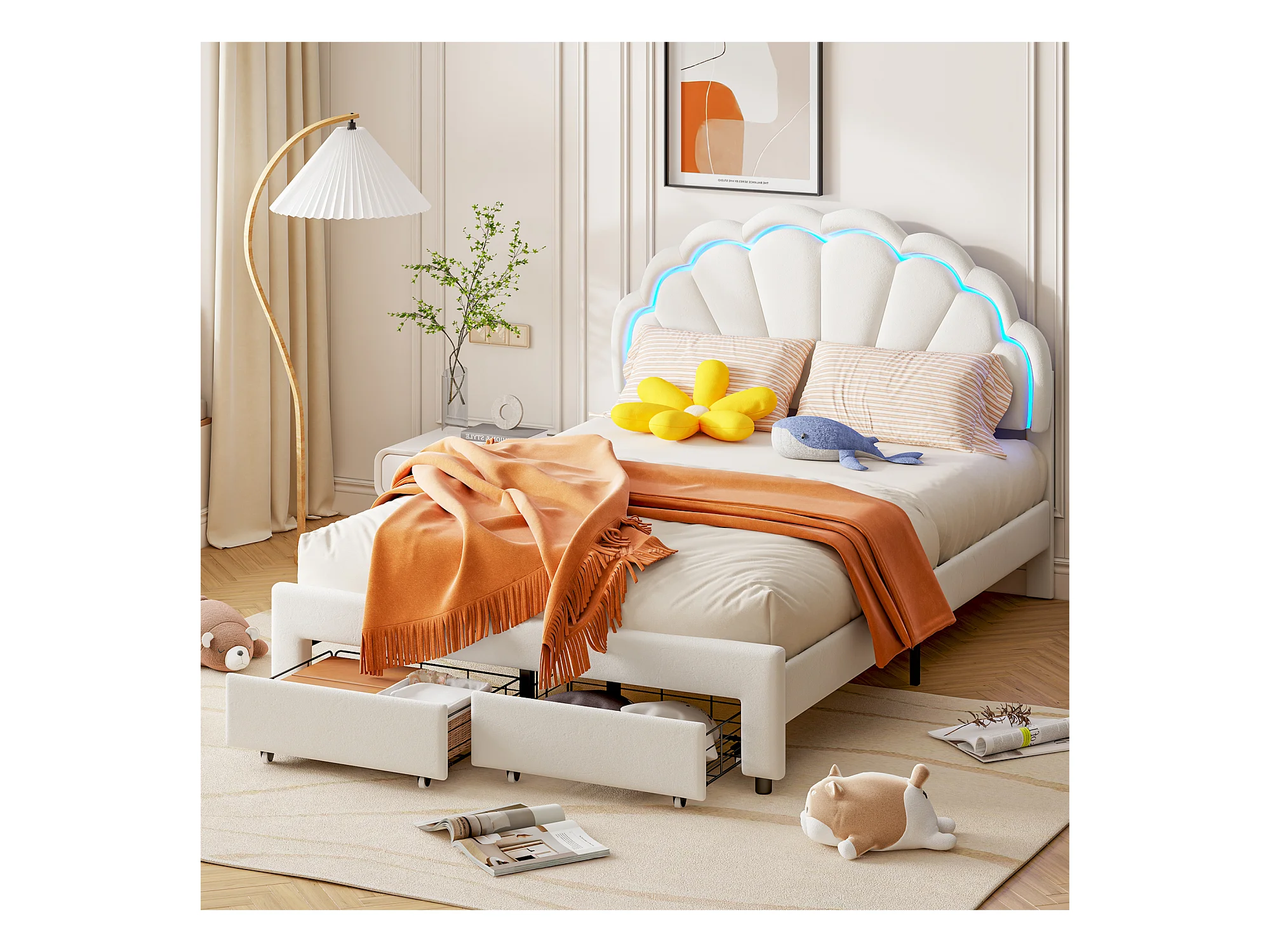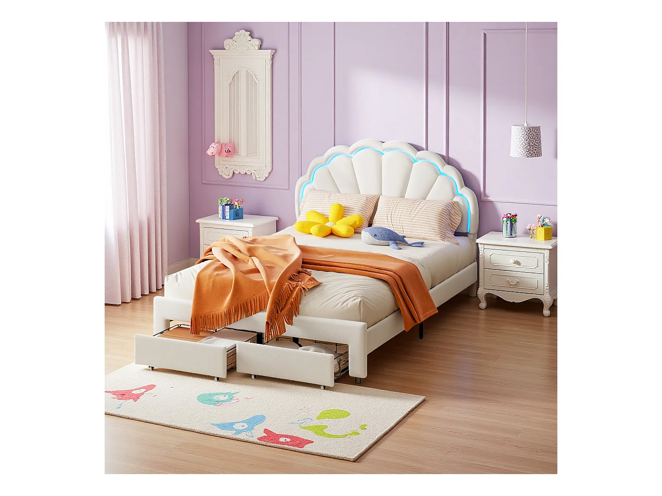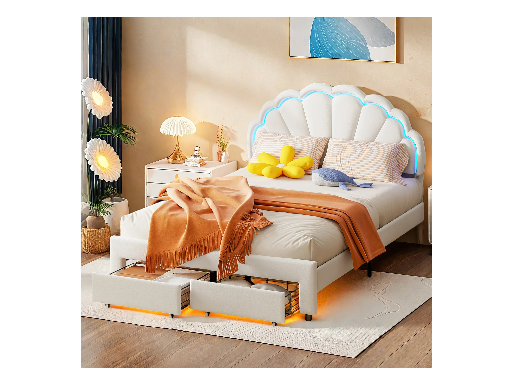 Cama infantil tapizada de 140 x 200 con iluminación LED y 2 cajones, cabecero con forma de flor y concha, base de láminas