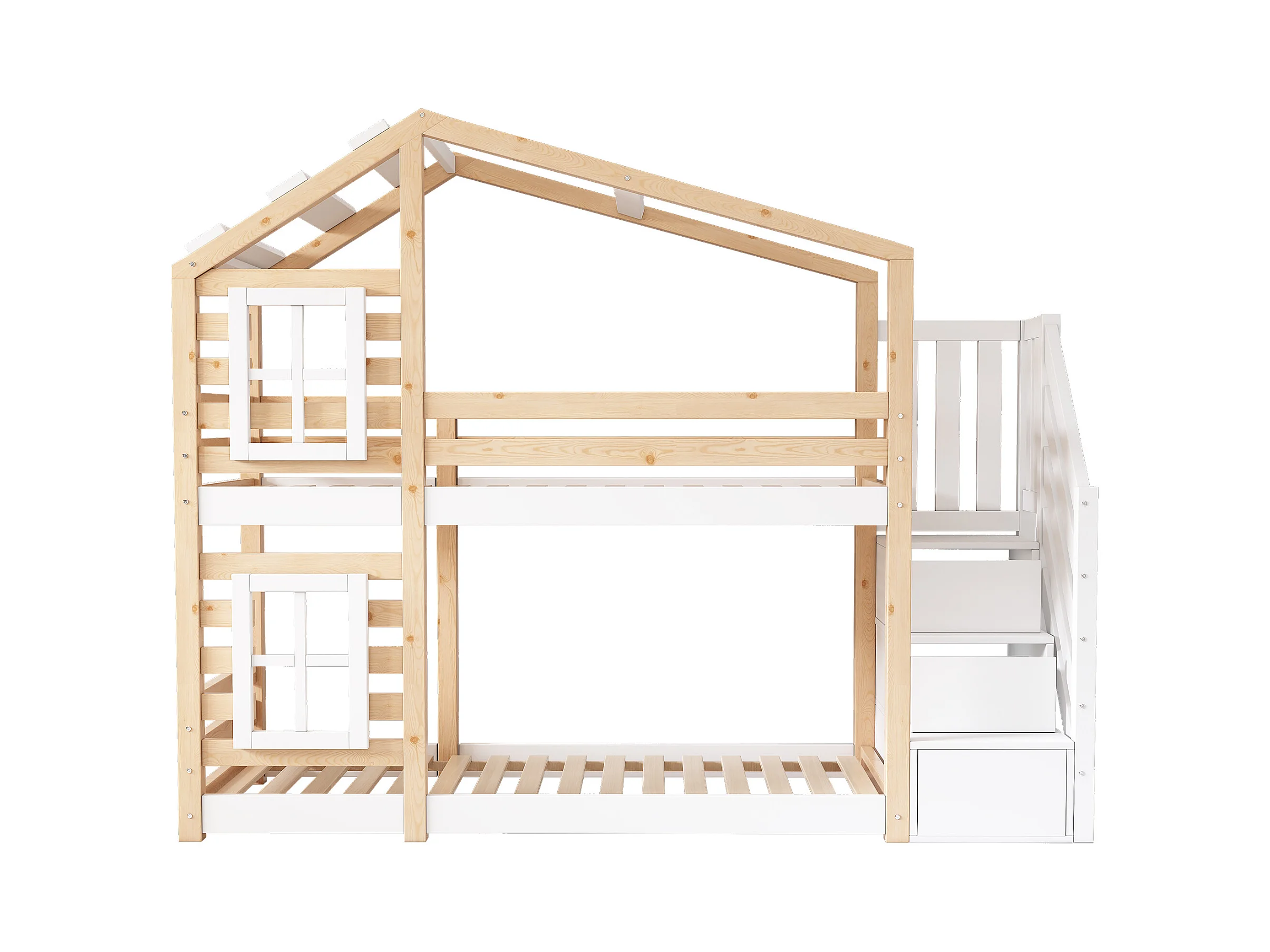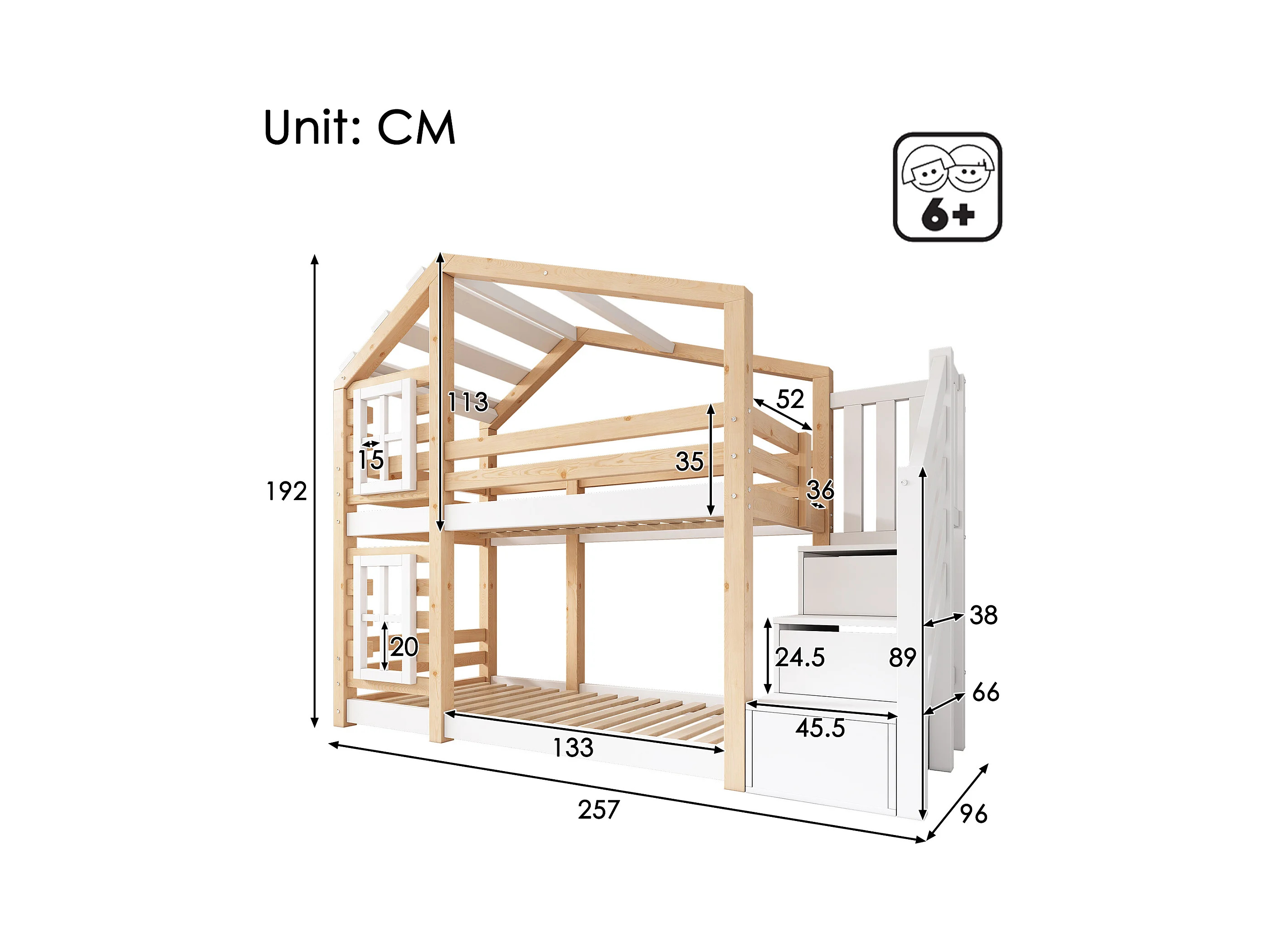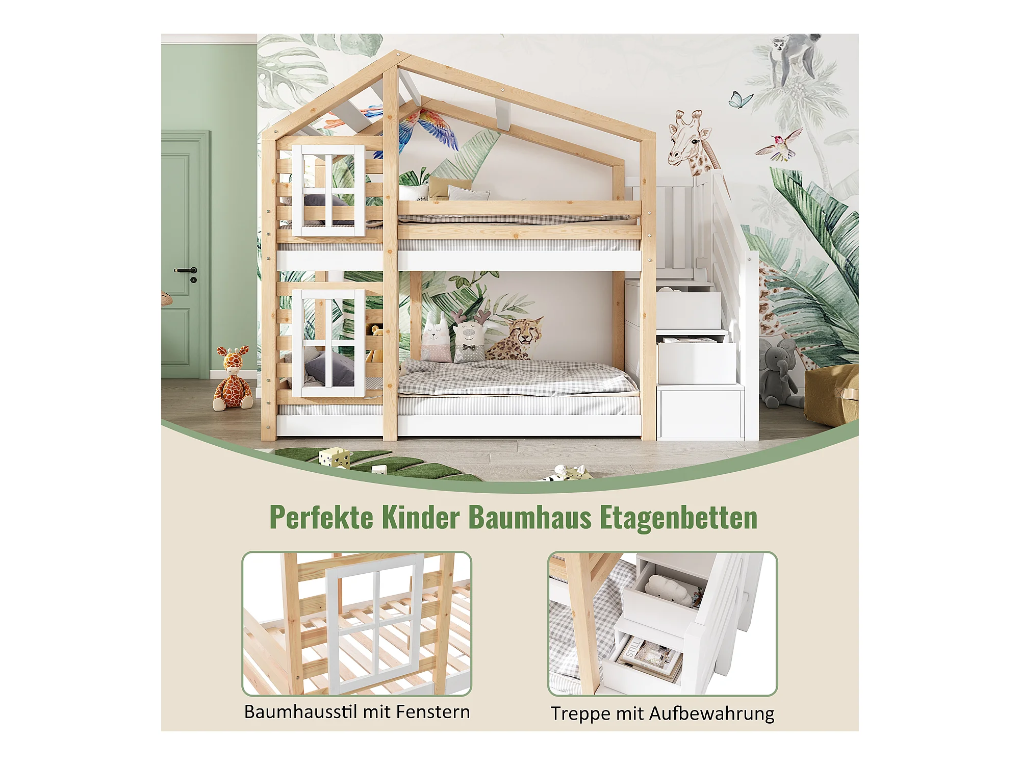 Cama infantil Treehouse de 90 x 200 cm, litera con ventana, almacenaje y protección anticaídas