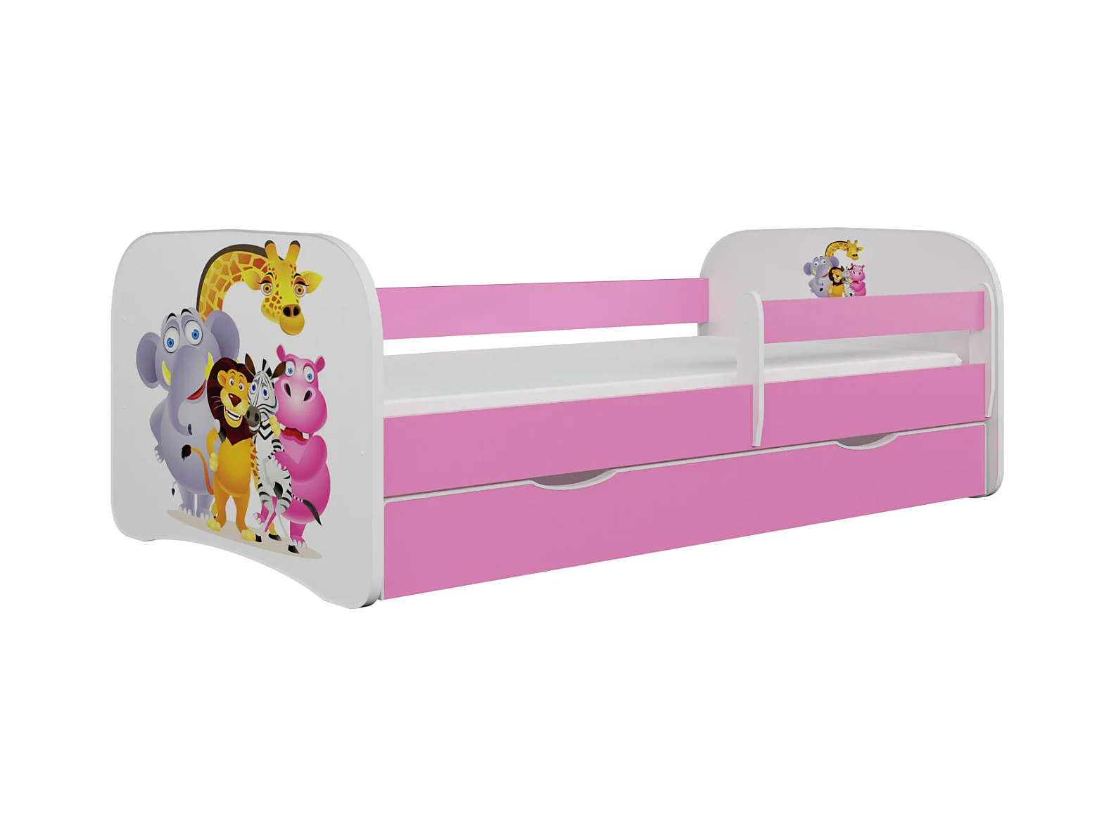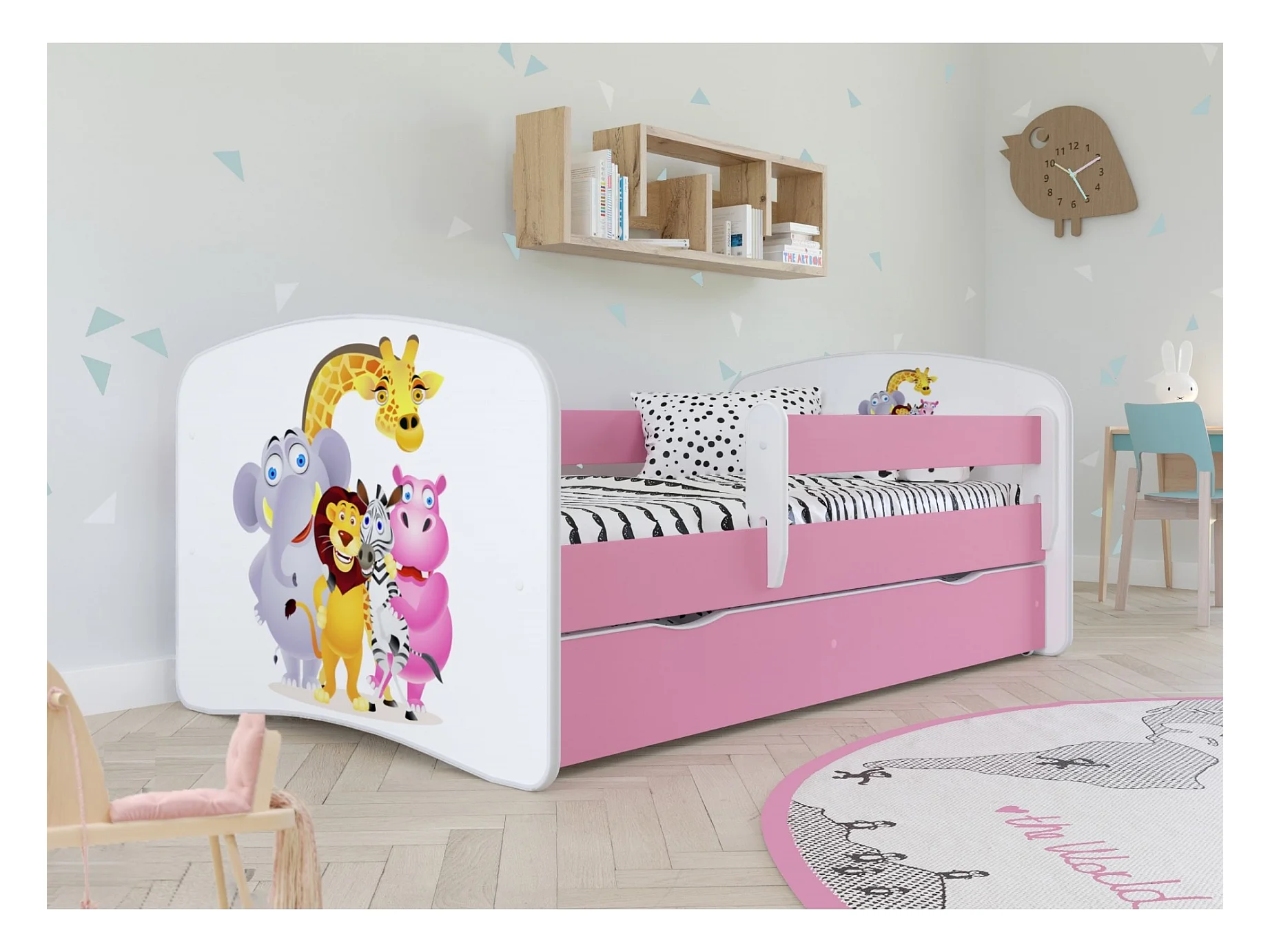 Cama infantil Zoo rosa con somieres y barrera de seguridad extraíble Drimy-Ropa de cama 80x160 cm-Cajones Con cajón