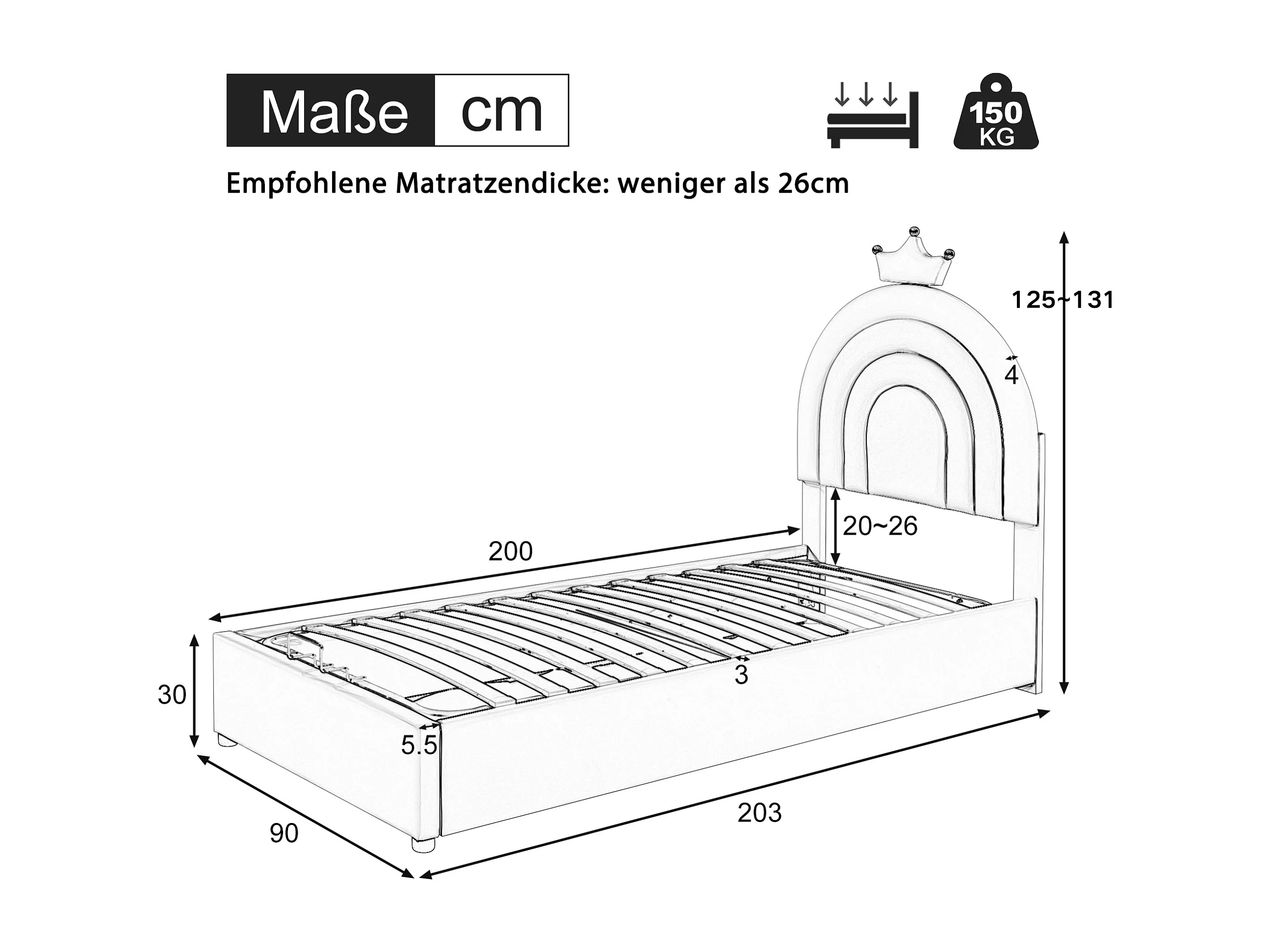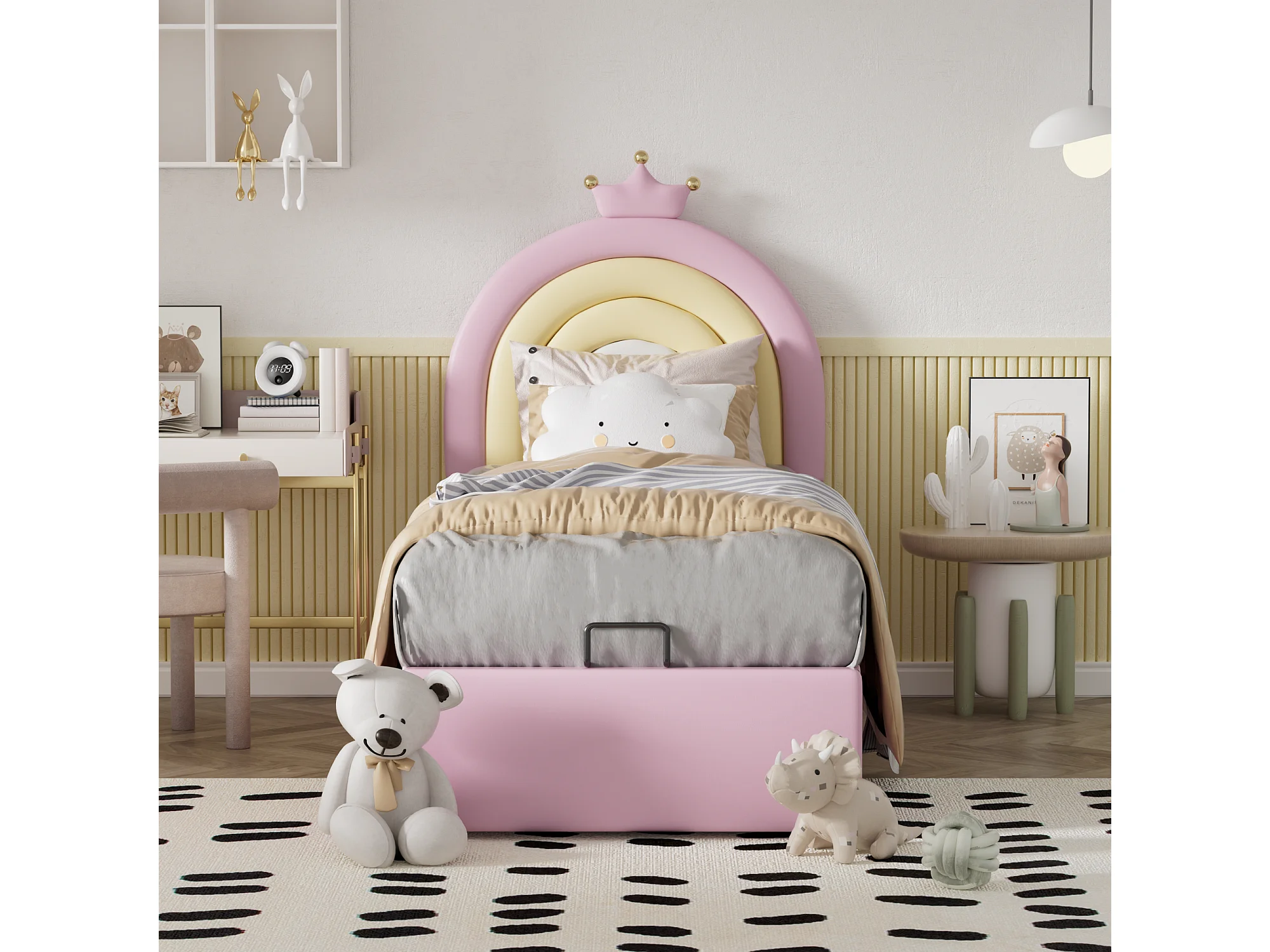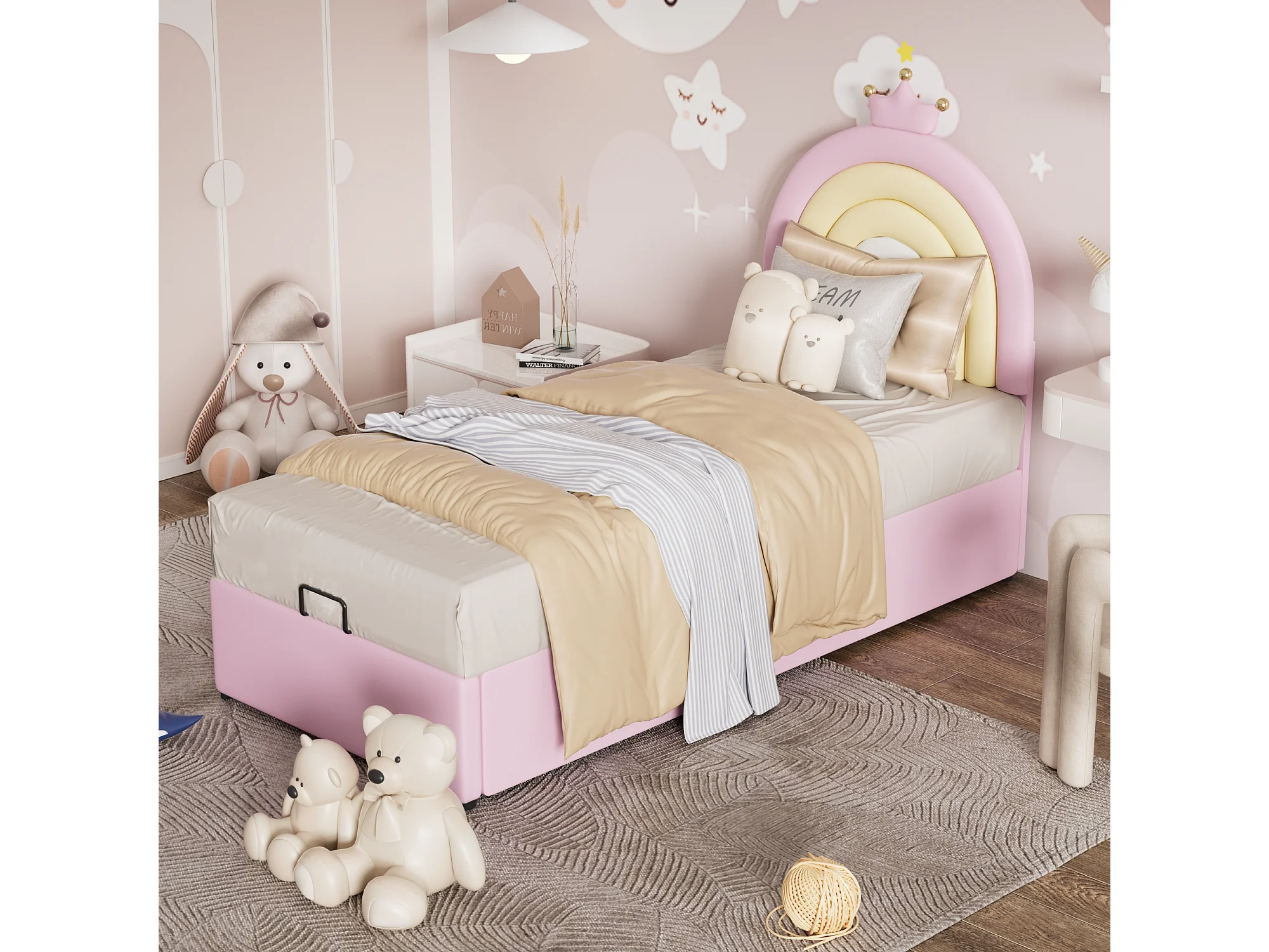 Cama tapizada Rose 90*200, cama Junior, somier y cabecero de láminas, soporte de láminas de madera, cabecero regulable en altura