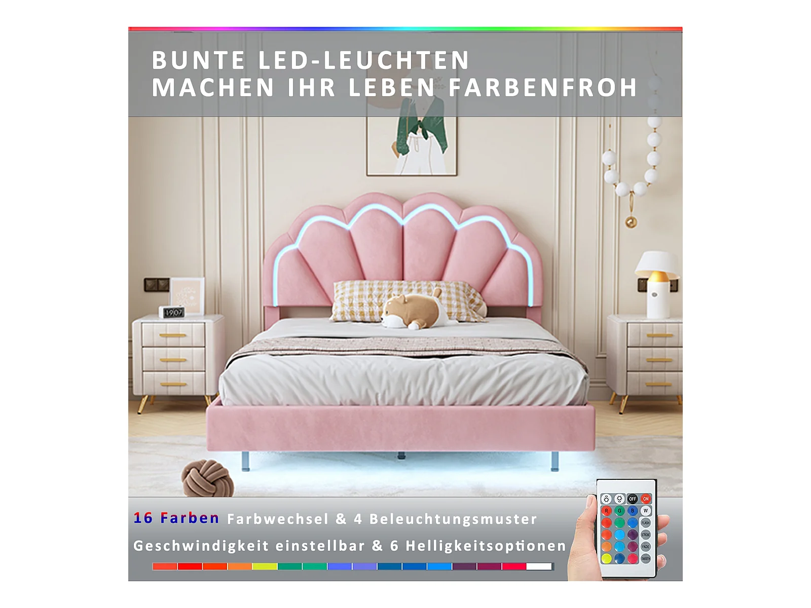 Cama juvenil de 140 x 200 cm, tapizada con luces LED y estructura flotante, cabecero, para niña, con forma de nube, tela de terciopelo (rosa)
