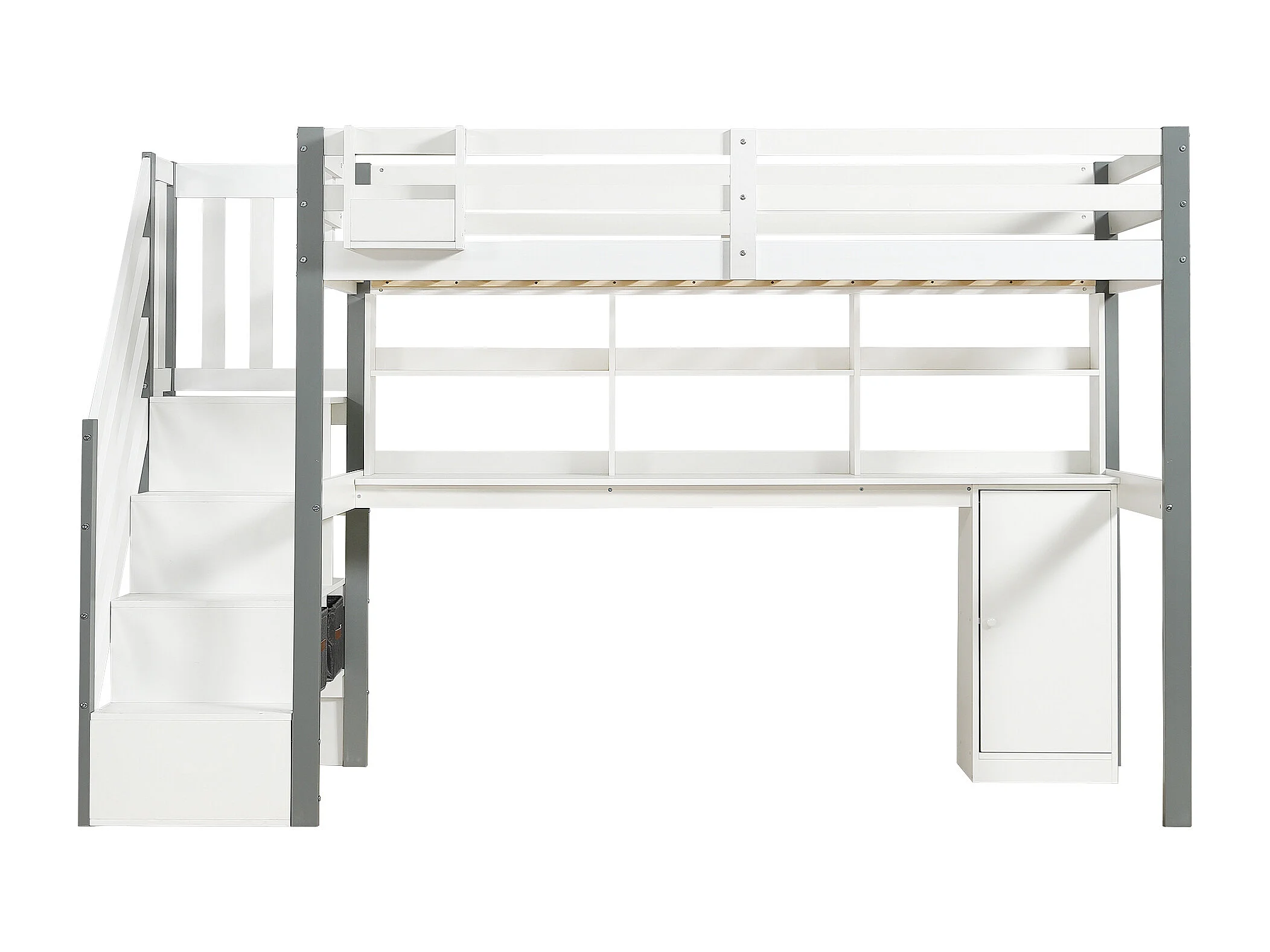 Cama media altura, cajón tela, almacenaje, escalera lateral, estante, escritorio, taquillas, pino+MDF, blanco+gris, 90x200cm