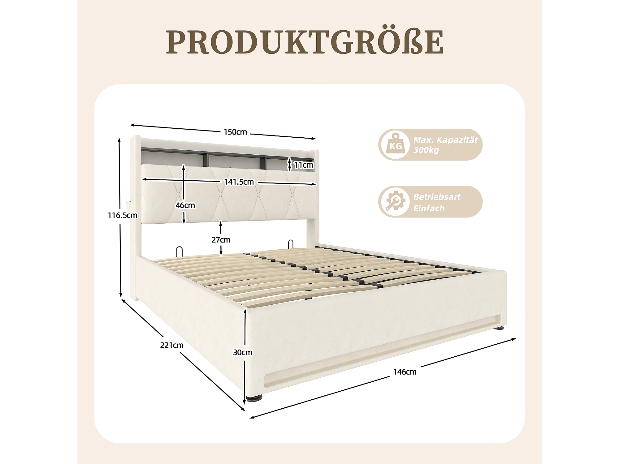 Cama de 140x200cm con LED - Somier de láminas - Gran espacio de almacenaje - Cabecero regulable - Beige