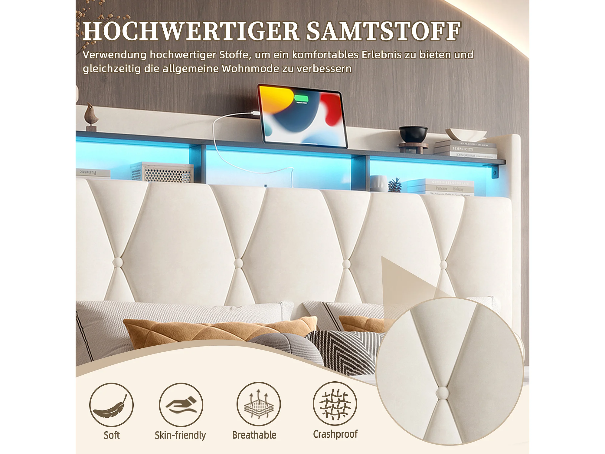 iluminado doble 140x200 iluminado capitoné, carga USB, LED regulable, terciopelo, beige