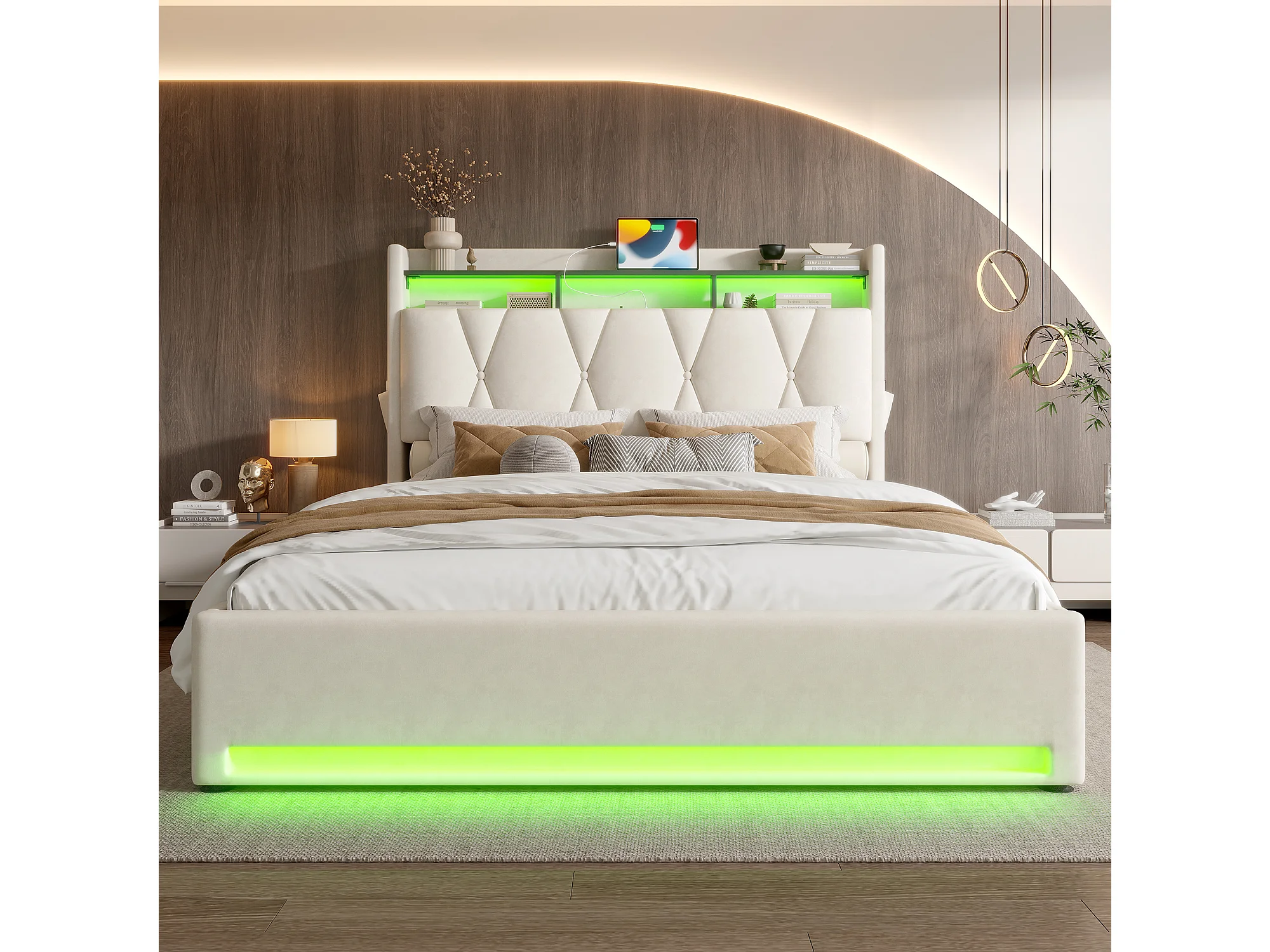 Cama doble 140x200 con espacio de almacenamiento hidráulico, iluminación LED y toma USB-C, en terciopelo beige (213x150x120 cm)