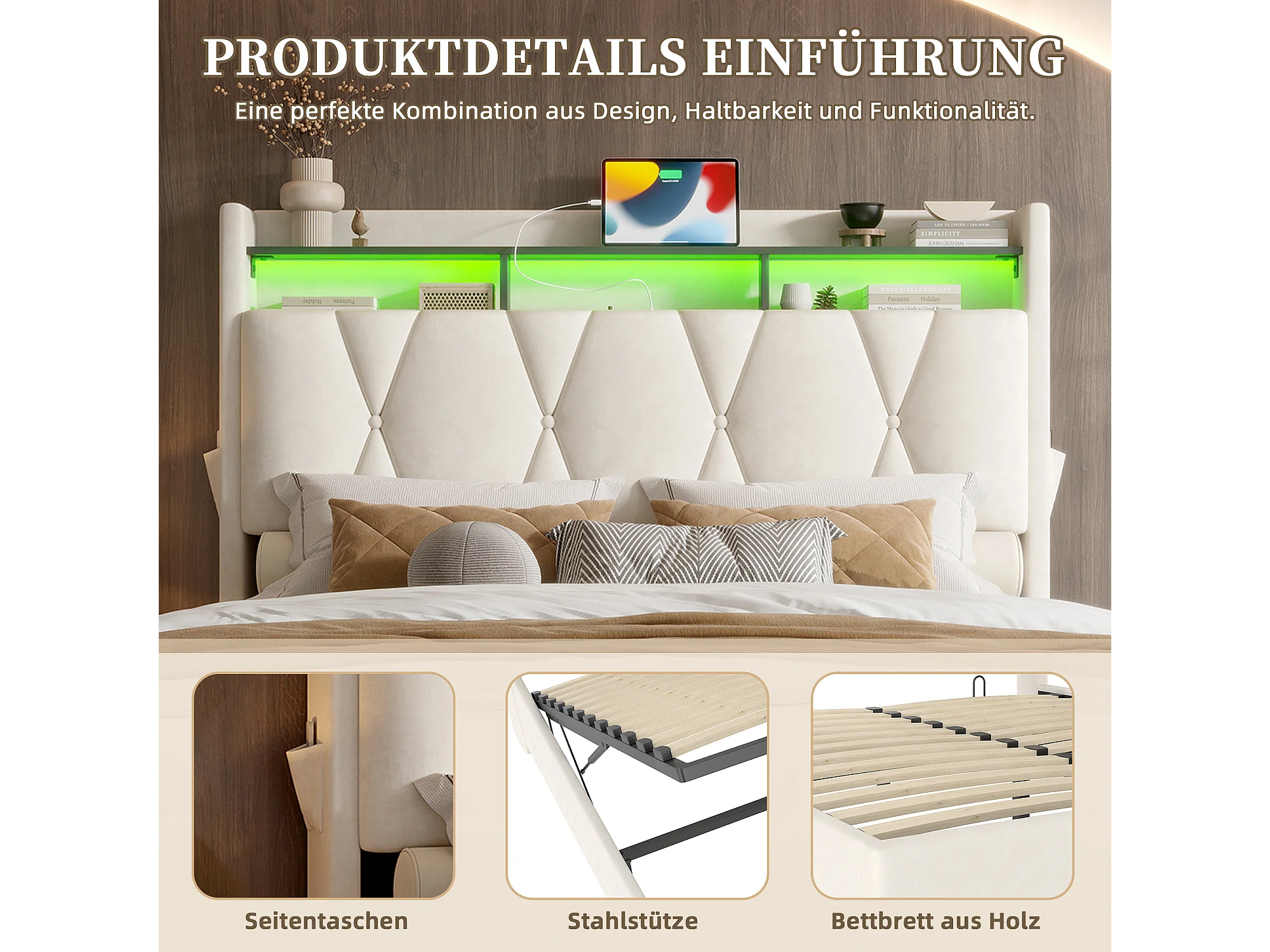 Cama tapizada LED 140x200 terciopelo beige con almacenaje hidráulico y cajones integrados