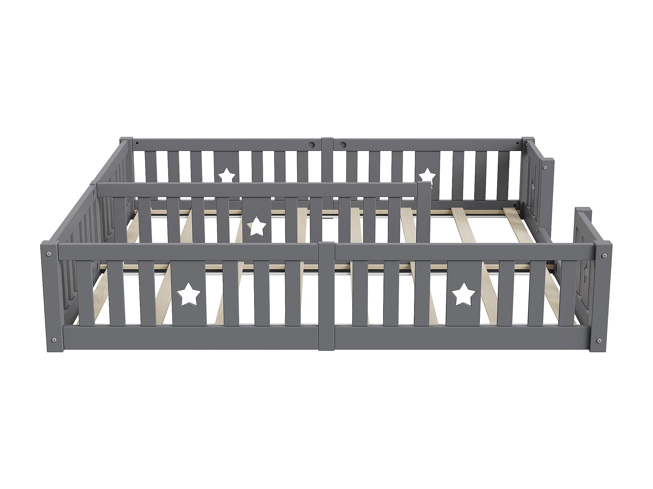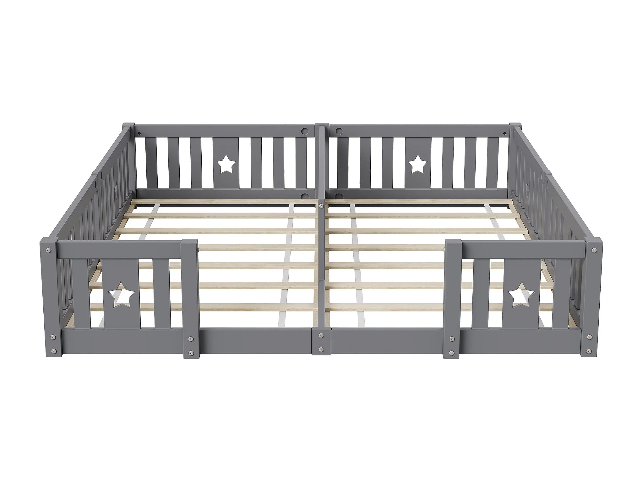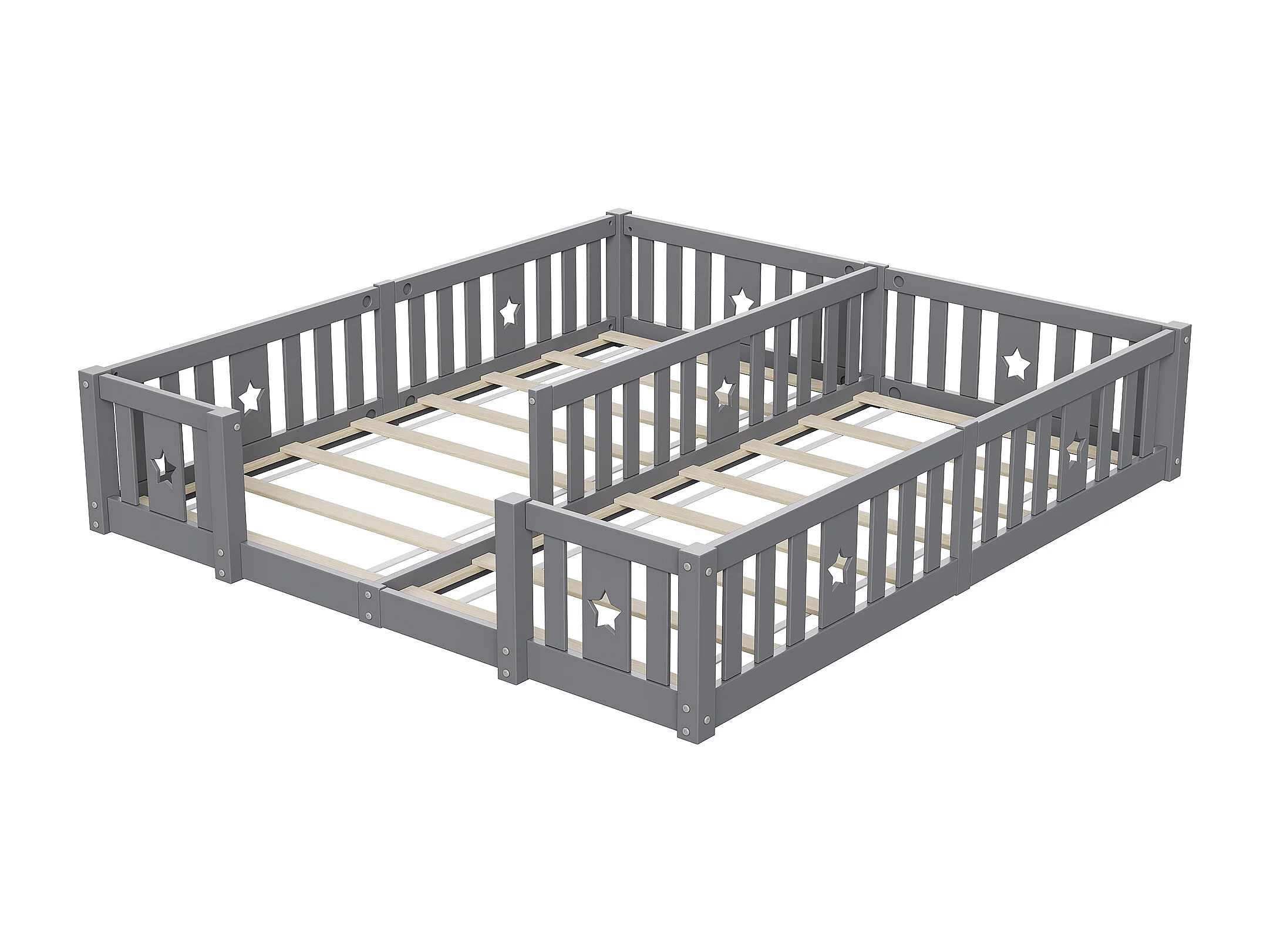 Cama Montessori baja de 180 x 200 cm, cama doble, con protección anticaída y somier de láminas, para 2 niños, madera maciza, gris