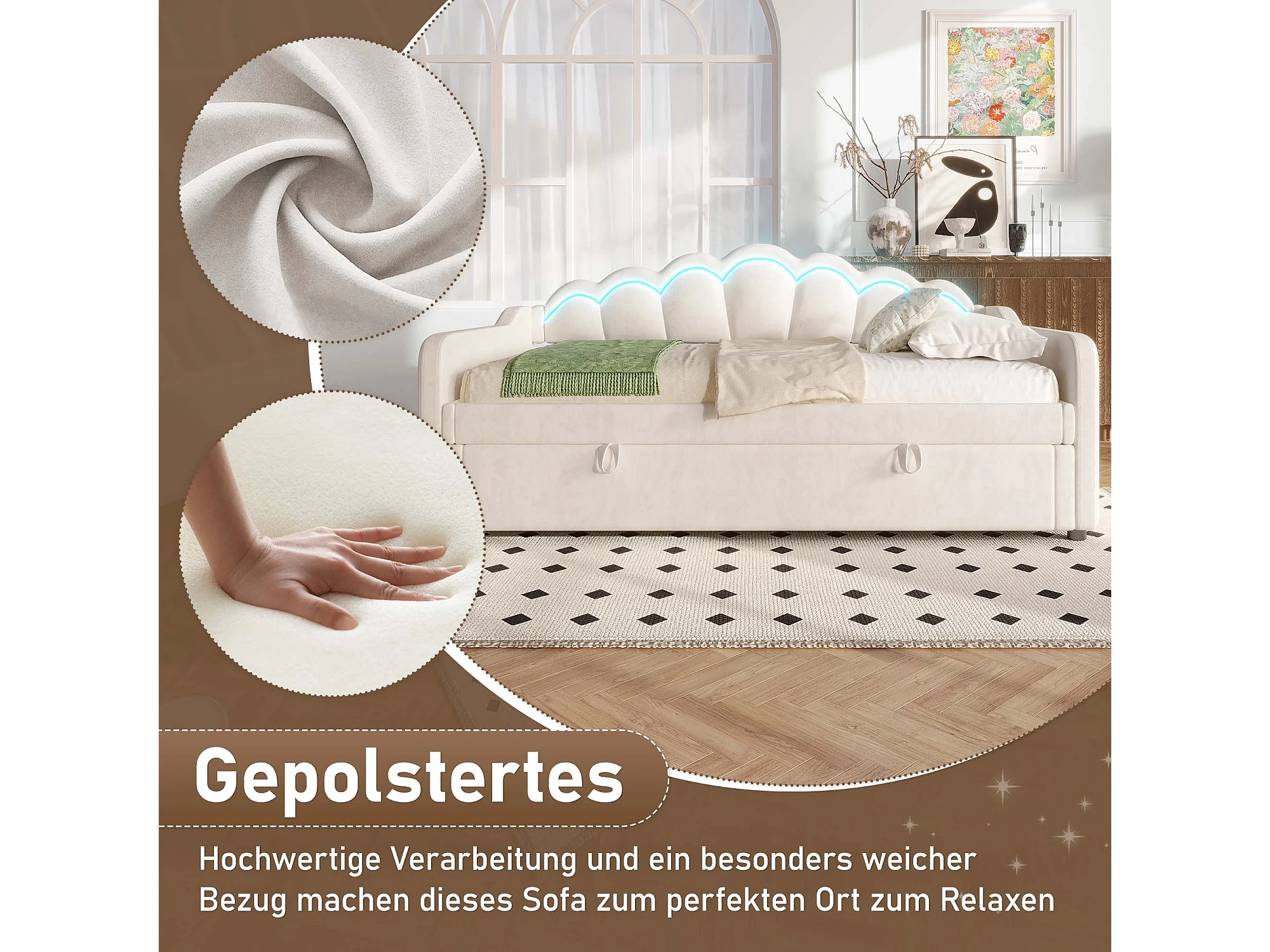 Cama nido de terciopelo beige de 90x200 cm con LED multicolor y almacenaje hidráulico, sofá convertible