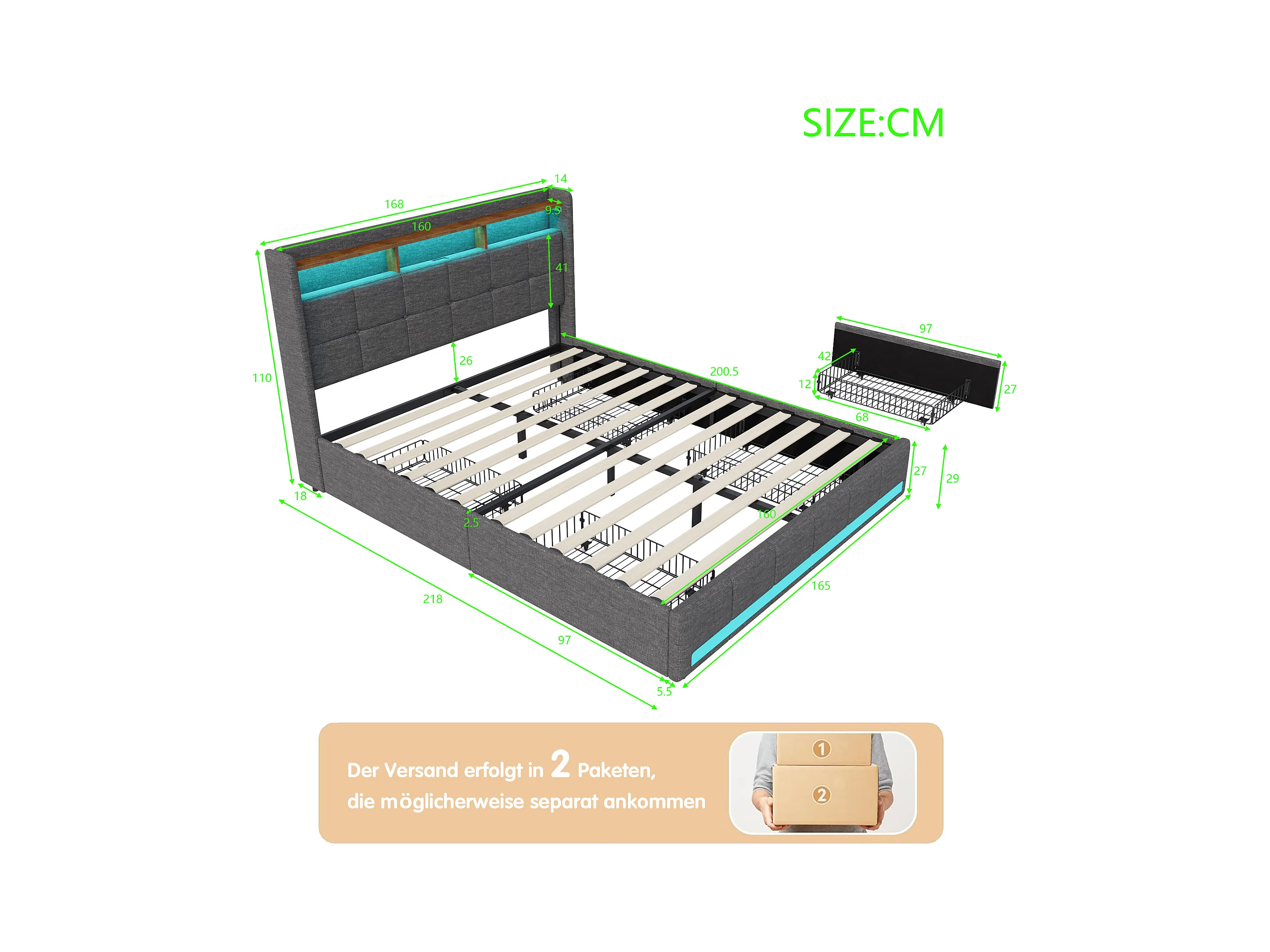 Cama de 160 x 200 cm con espacio de almacenaje, USB y compartimentos, tapizada con somier de láminas, cama doble, gris