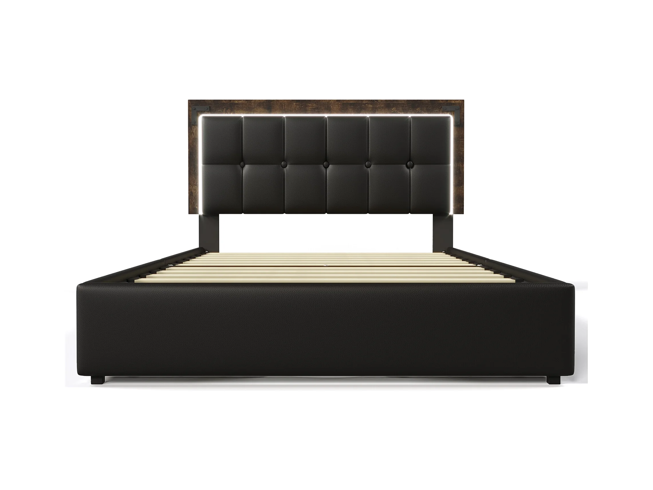 Cama tapizada 140*200 con somier y cabecero, cama LED con 4 cajones de almacenaje, PU, negro