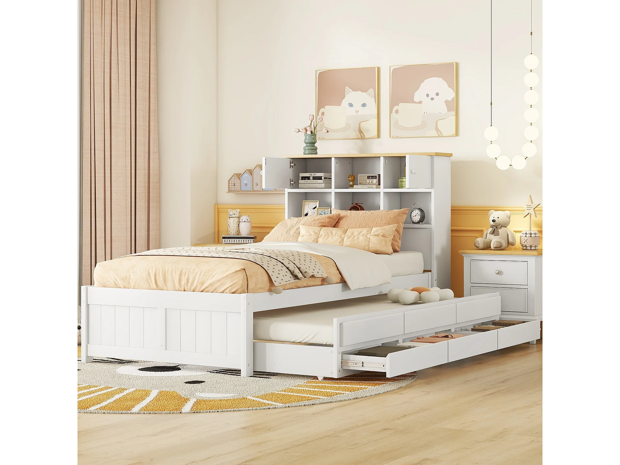 Cama plana 90x200 cm con almacenaje, cama extensible con 3 cajones, diseño sencillo, madera de pino, blanco (222x95x118 cm)