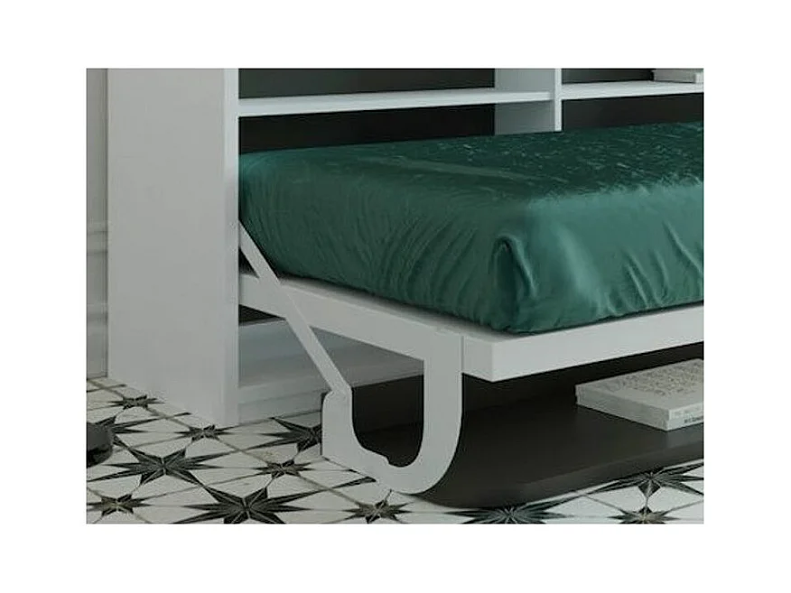 Cama abatible 140x190 cm P 53 cm blanco satinado con estantes y escritorio Miko