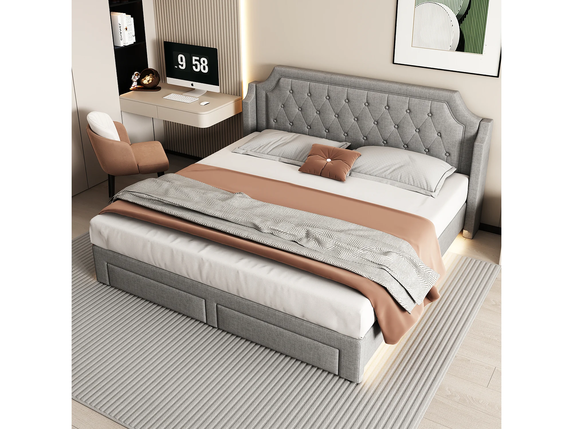 Cama adulta 180x200 cm gris en lino con 4 cajones y luz LED, somier de láminas, sin colchón