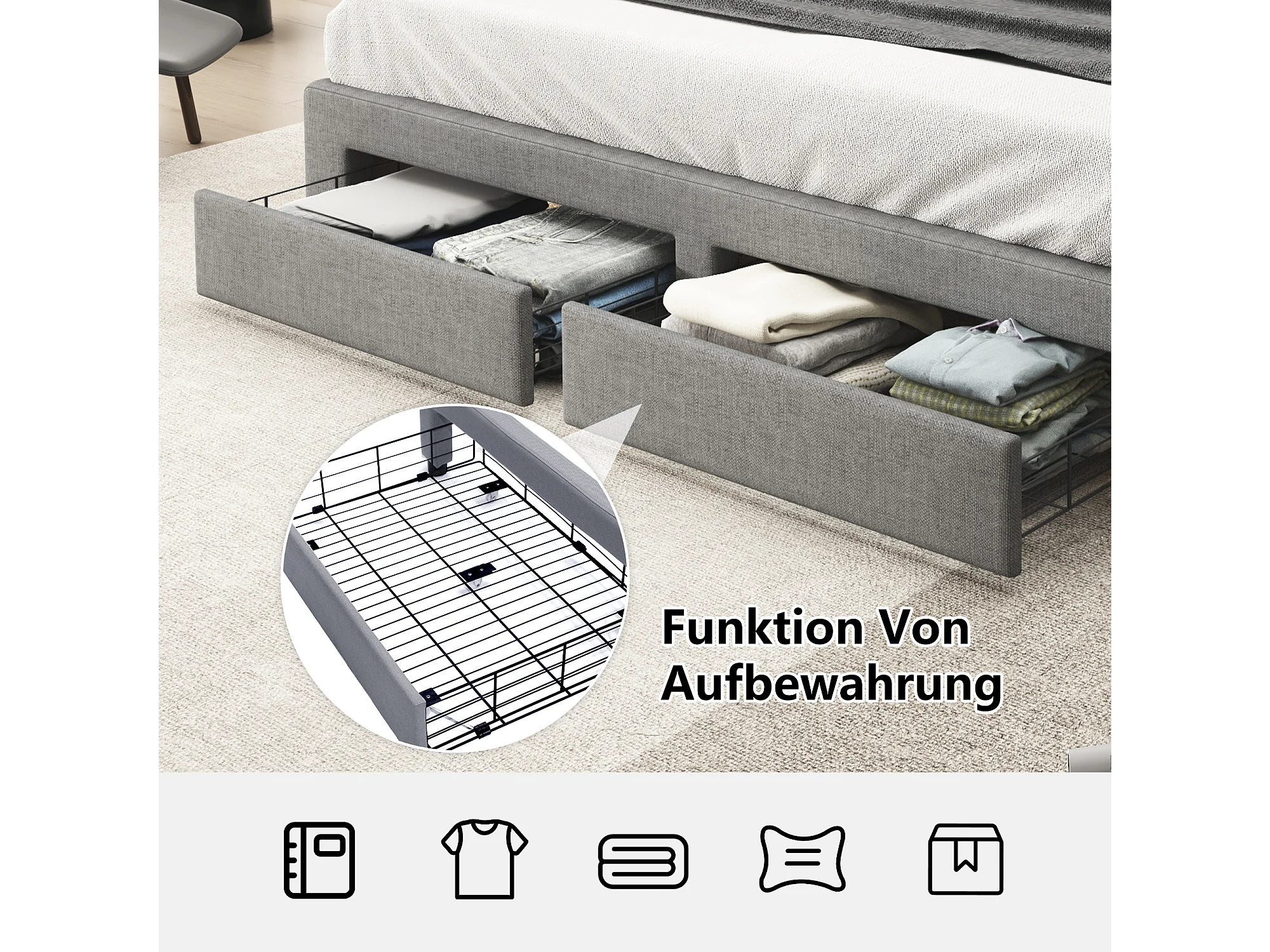 Cama 180x200 cm gris con 4 cajones, cama doble tapizada para adultos, con LED y USB-C, sin colchón, lino de algodón