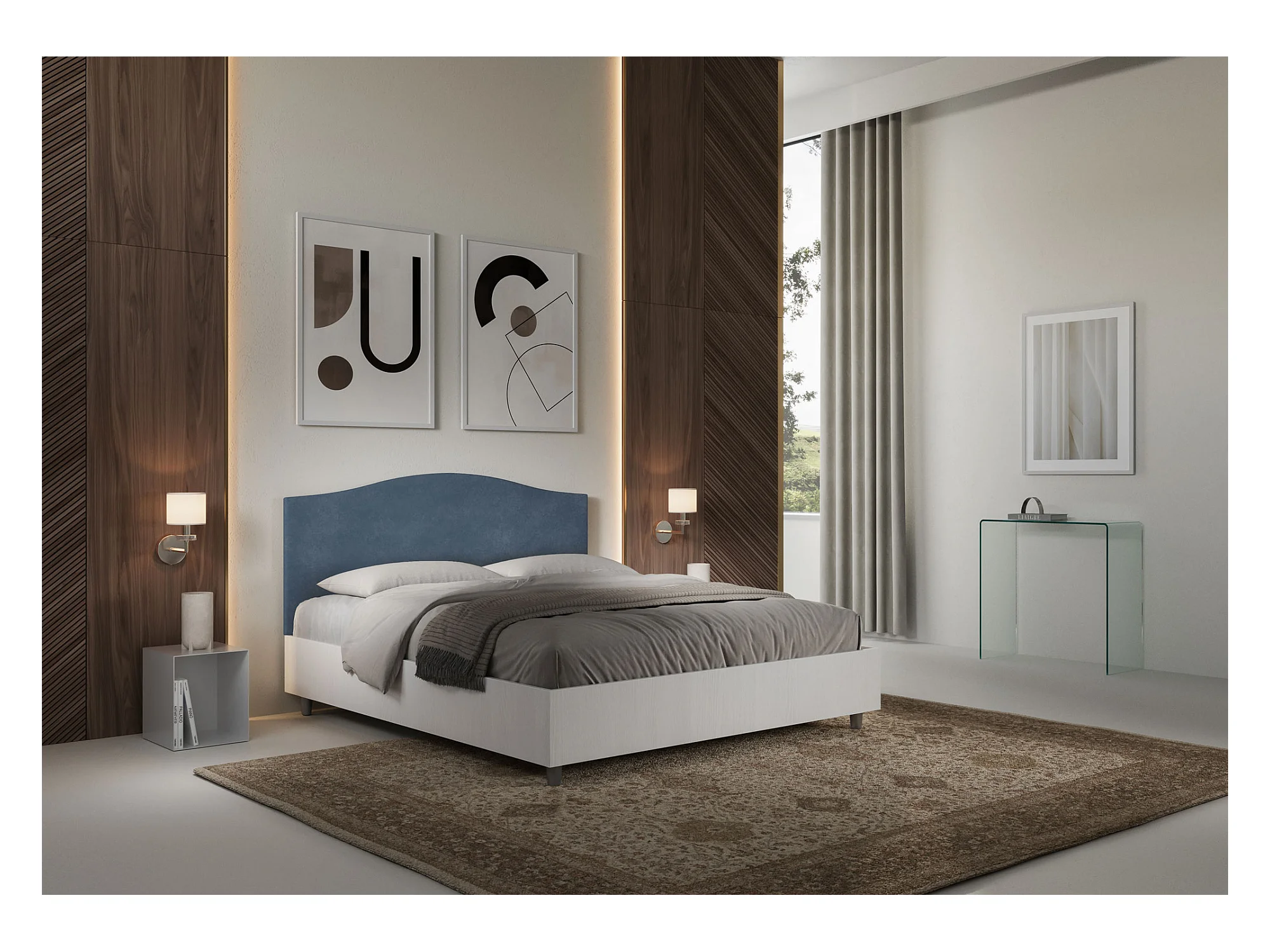 Cama sin somier 160x190 cabecero estructura fresno blanco melamina/microfibra azul Grace