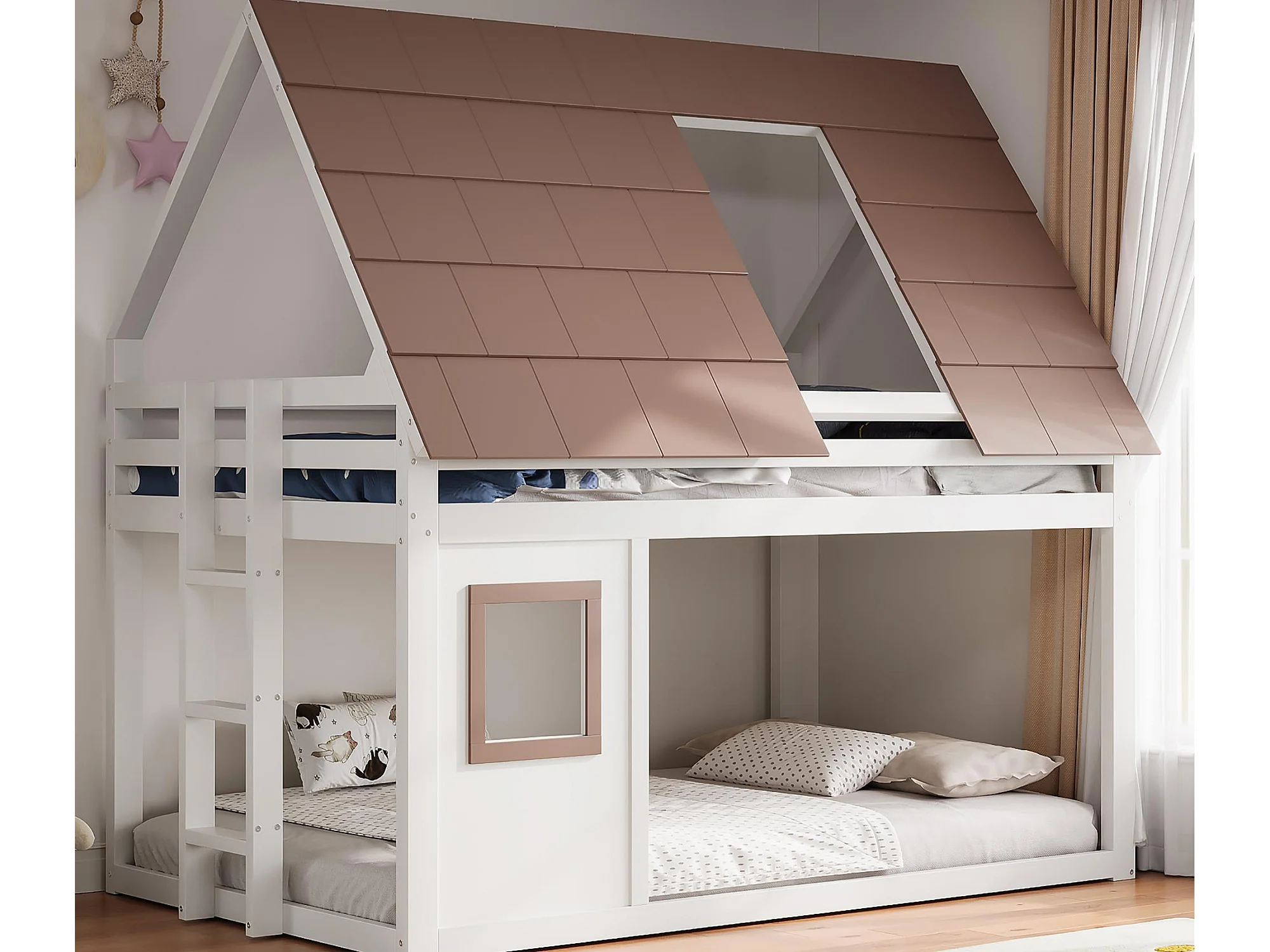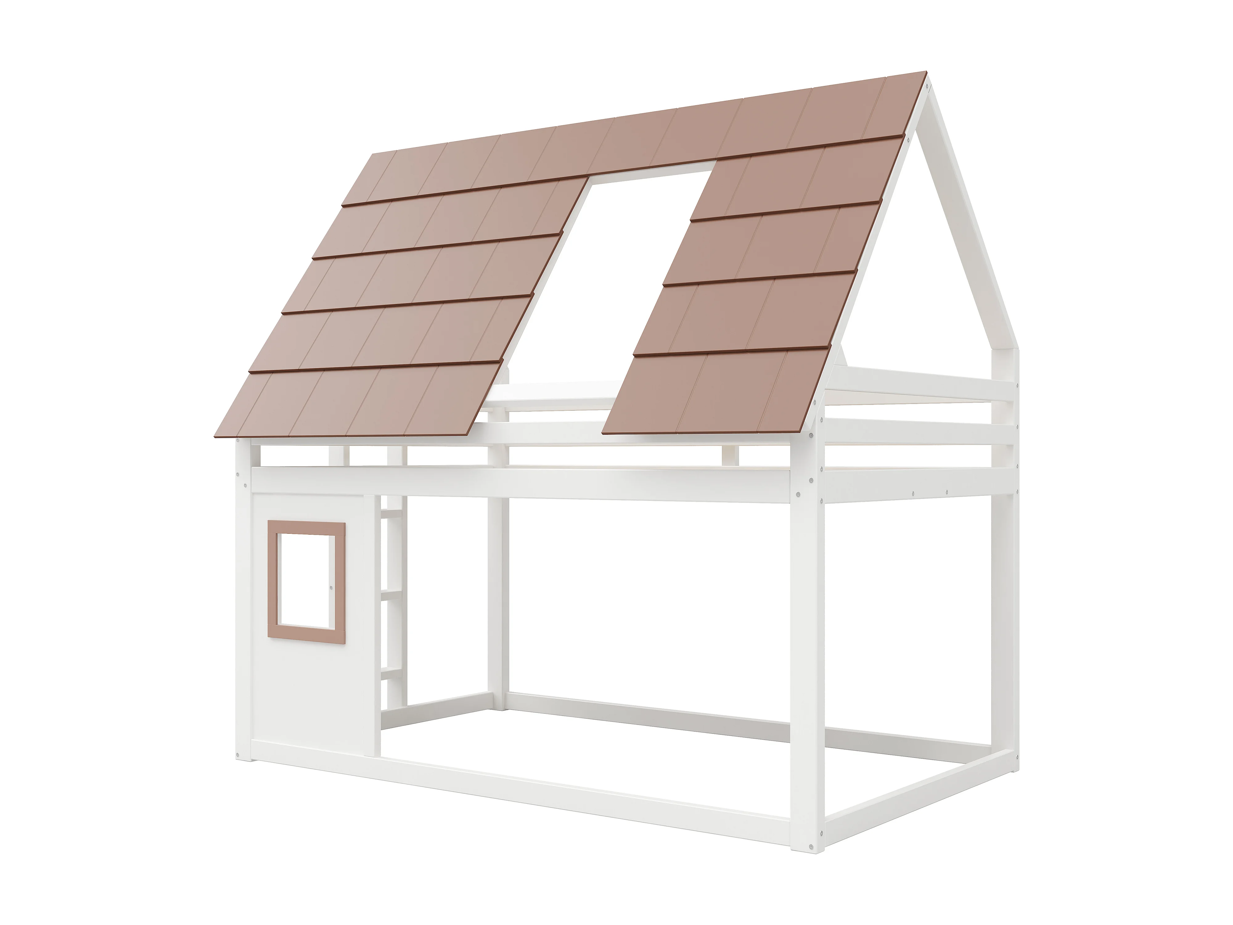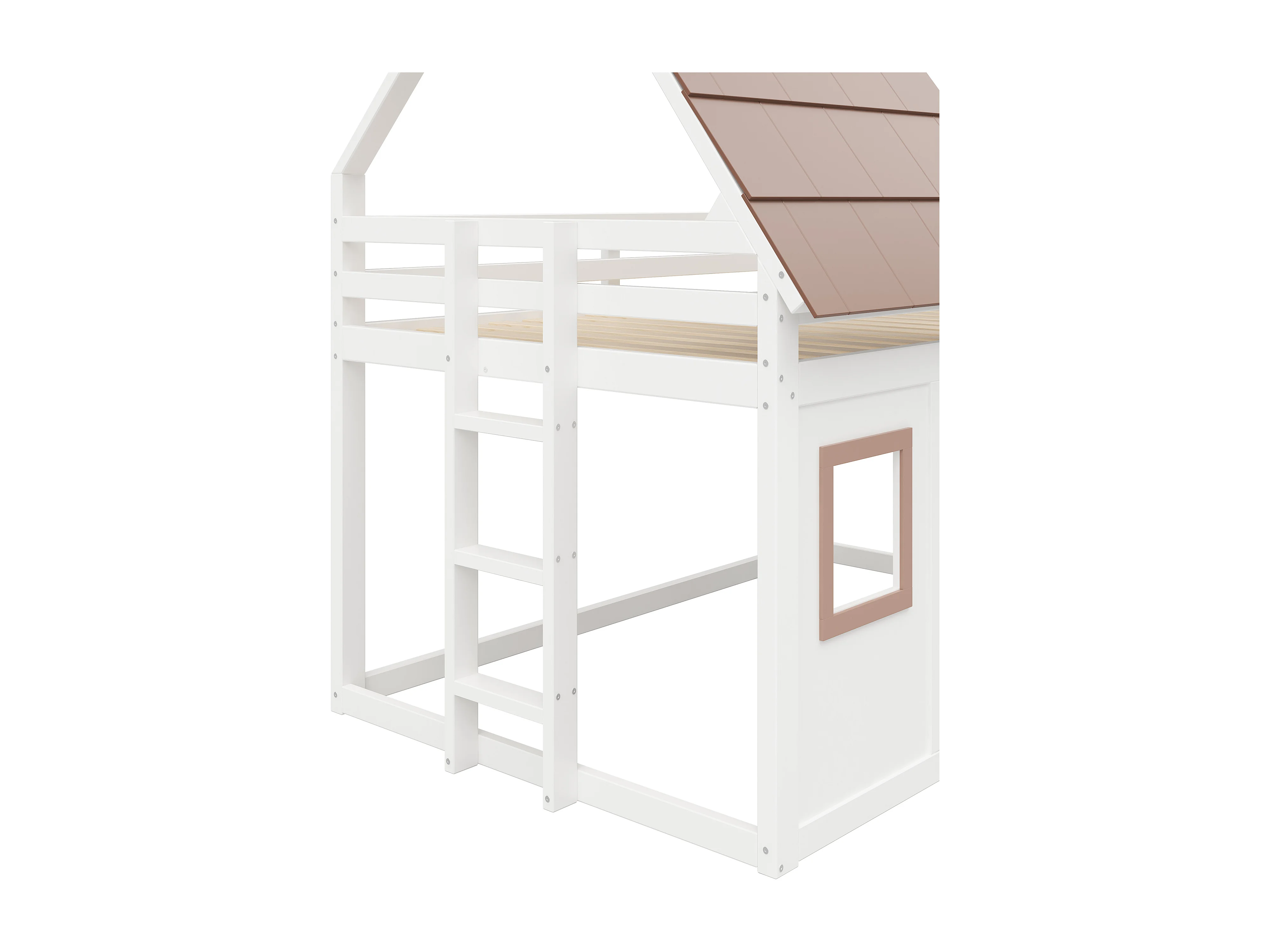 Cama superpuesta 140x200 cm - con techo y ventana - con escalera y barrera de seguridad - MDF+Pino - Blanco + Marrón​ (sin colchón)