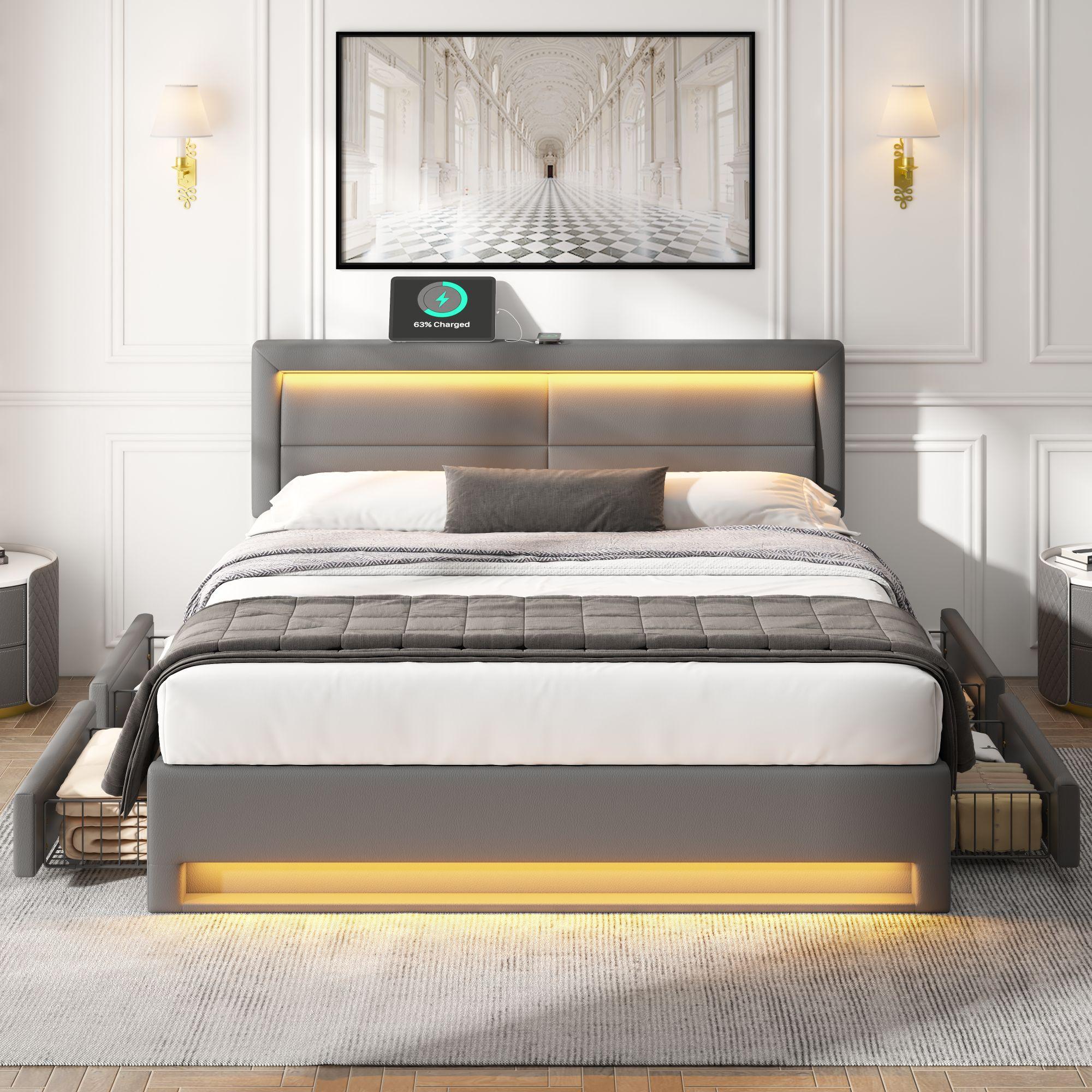 Cama tapizada 140x200 cm PU con LED, puertos USB, 4 cajones, almacenaje dormitorio gris