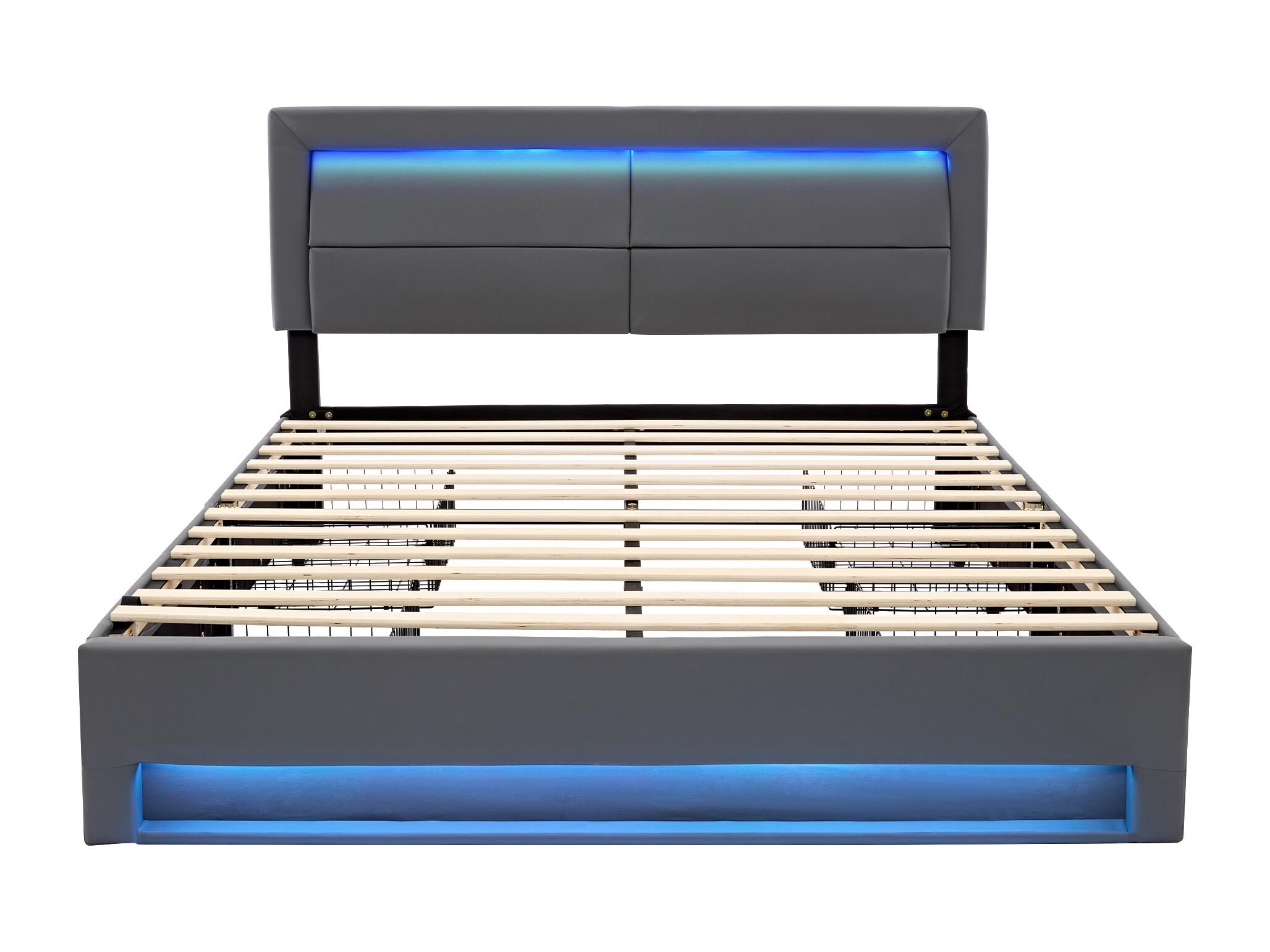 Cama tapizada LED 140x200 cm, con 2 cajones y somier de láminas, cabecero regulable, PU, Gris