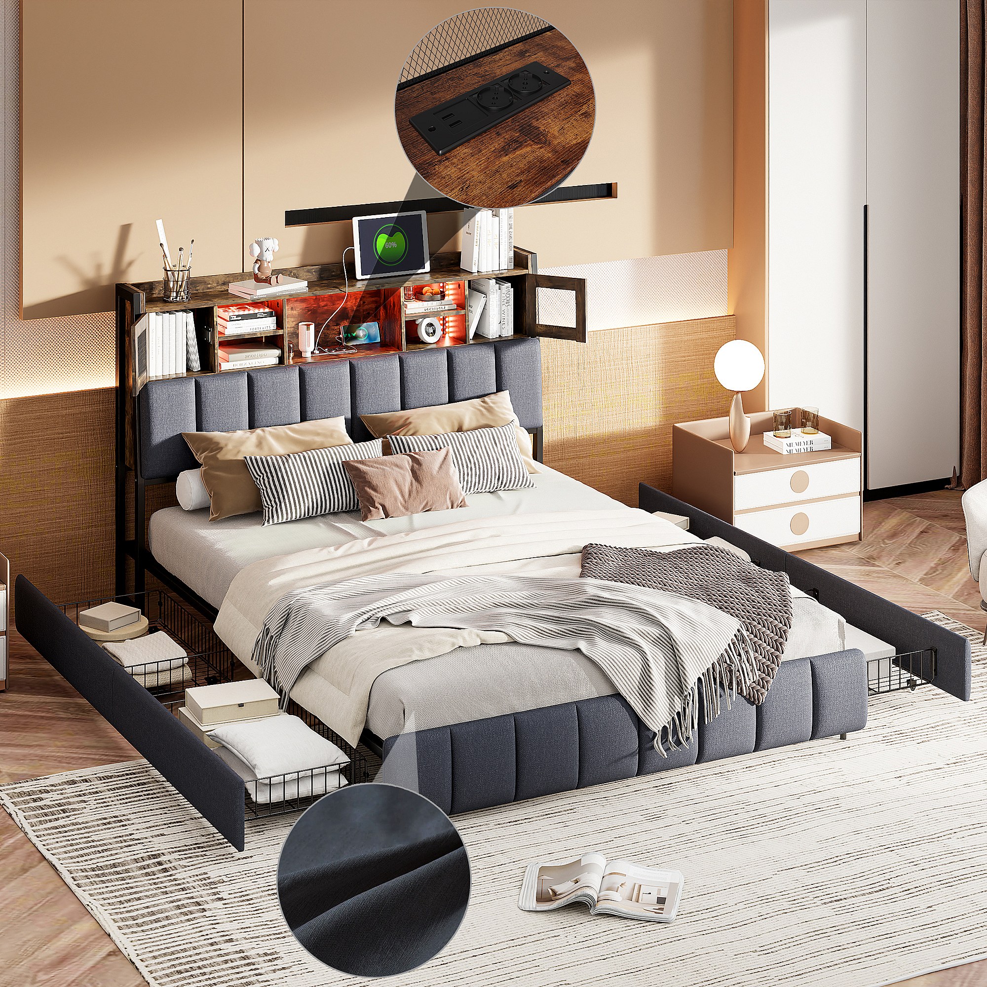 Cama tapizada 160x200 cm, cabecero LED con compartimento de almacenaje y USB, cama doble, color negro