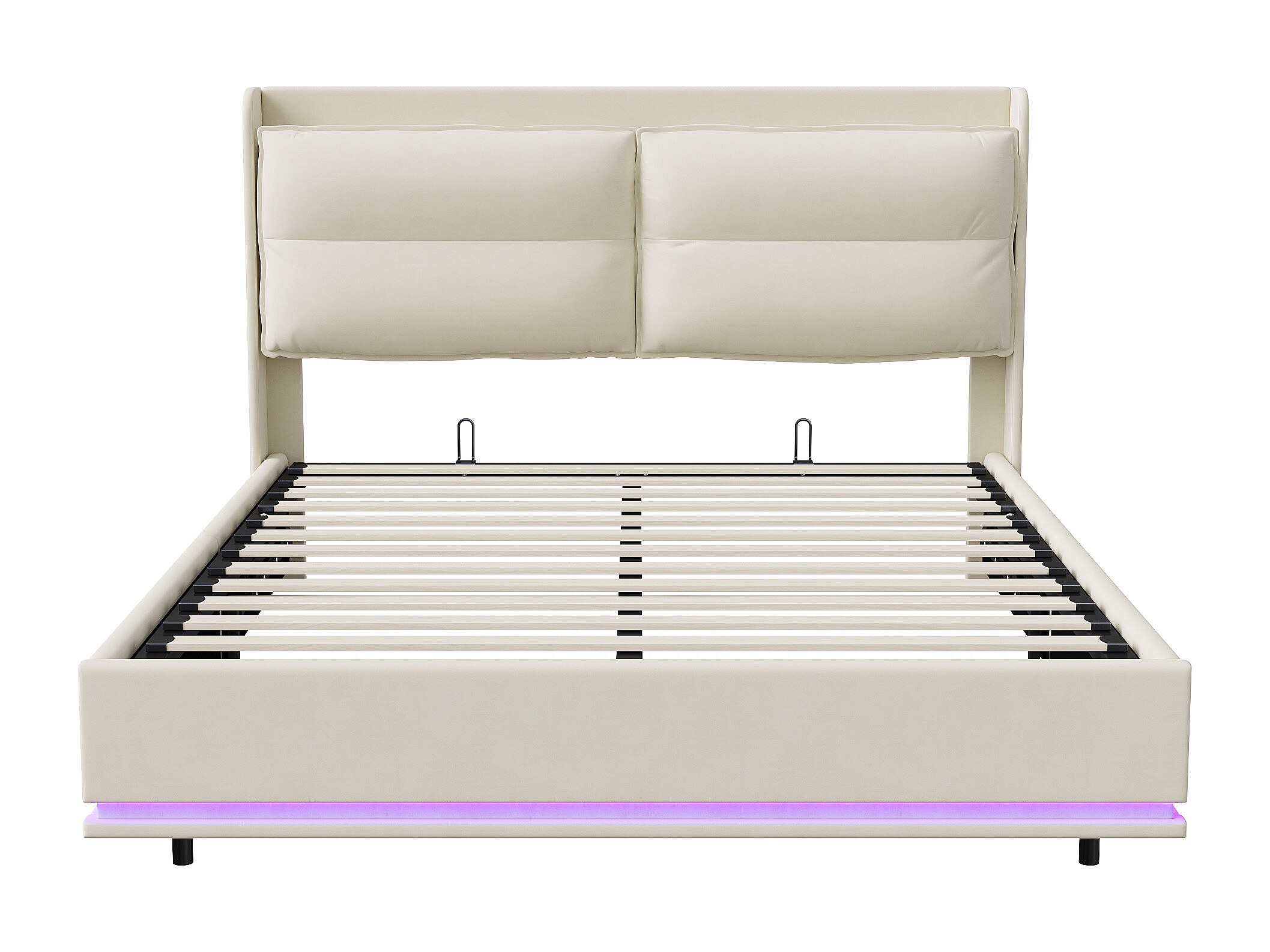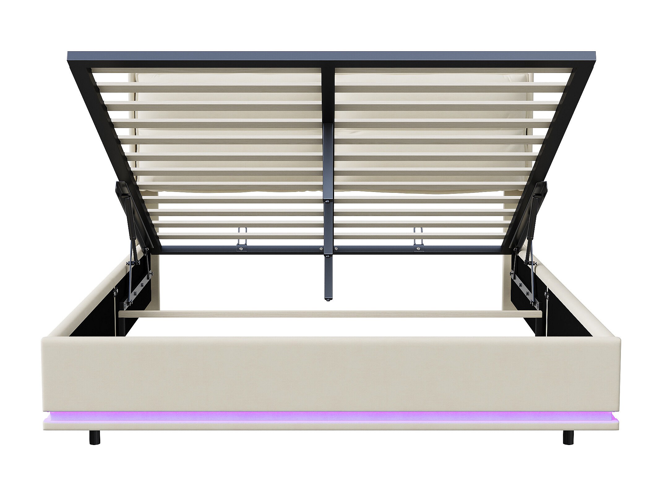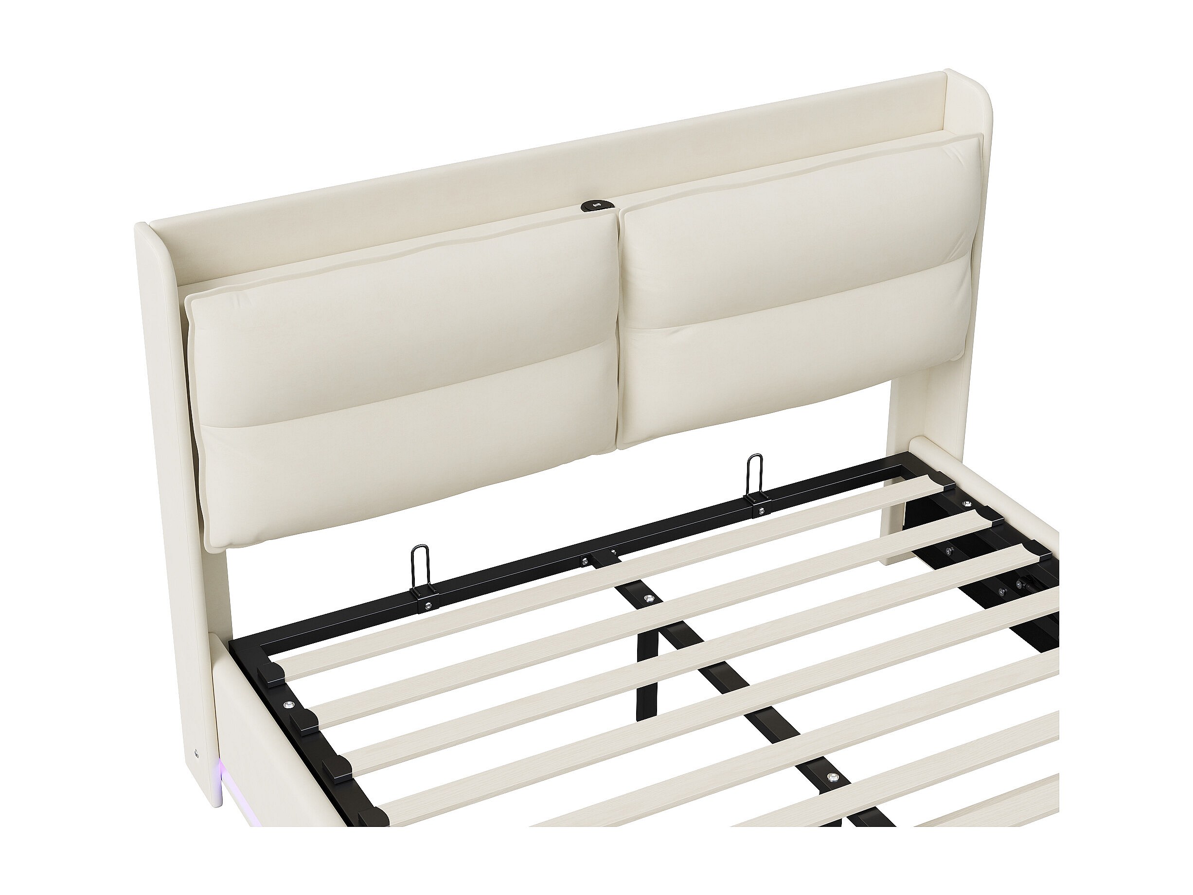Cama tapizada 160x200 cm con somier de láminas y LED, con puerto USB y almacenaje, Beige