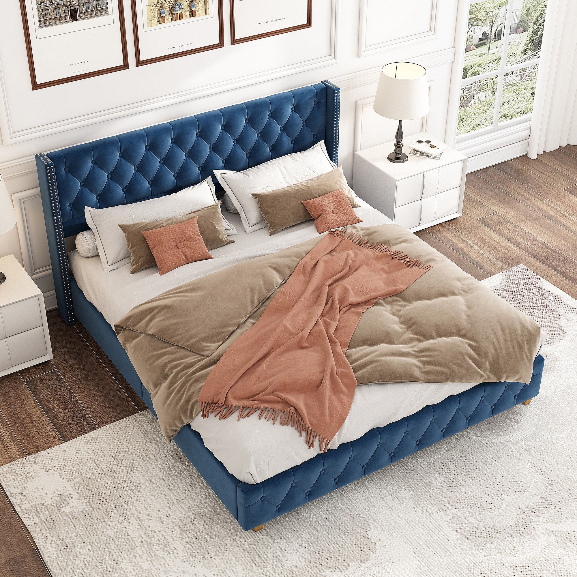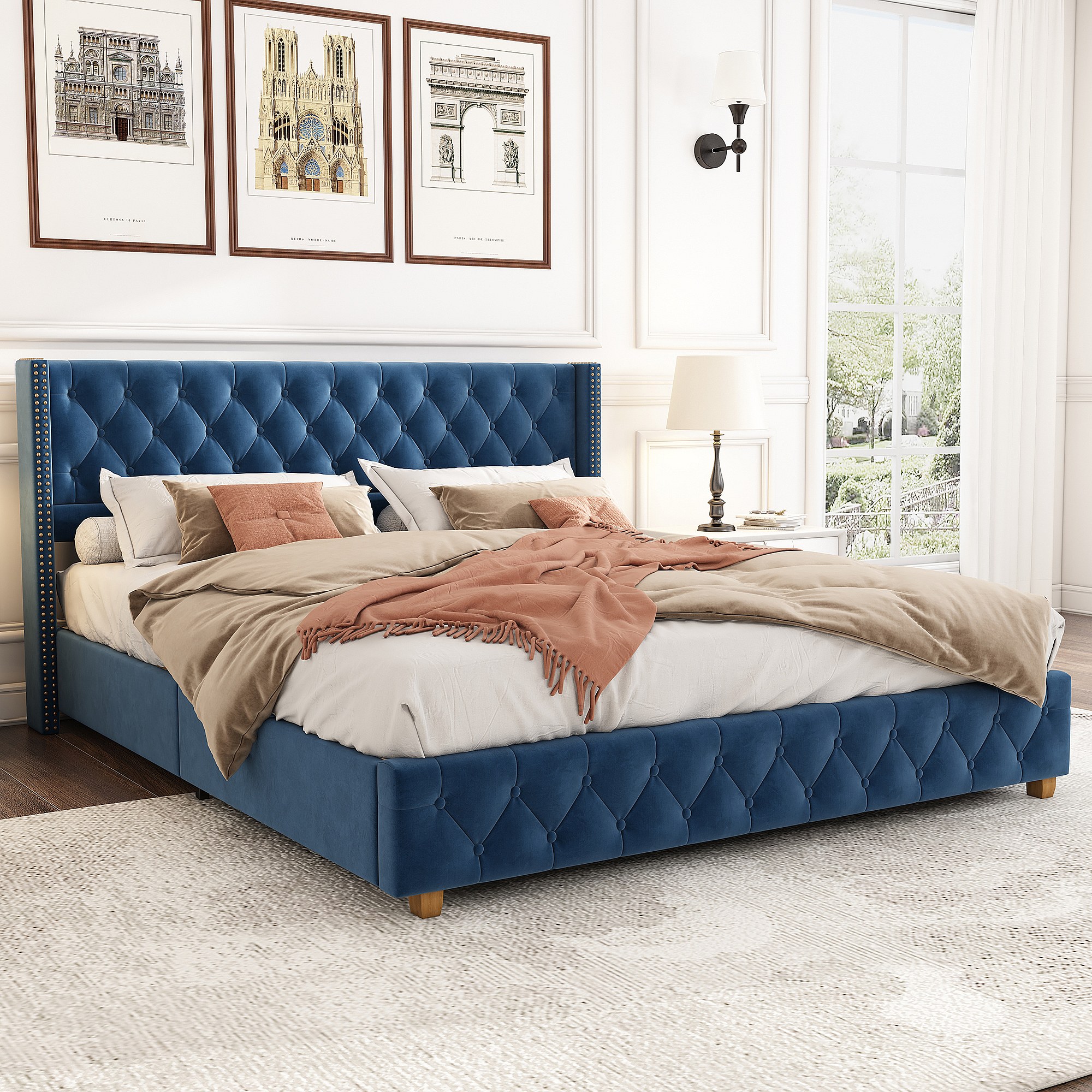 Cama tapizada 160x200 cm en terciopelo azul con cabecero capitoné y patas de madera
