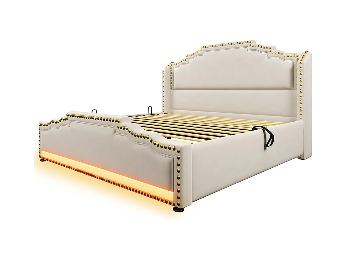 Cama tapizada 160x200, doble con almacenamiento hidráulico, iluminación LED y puerto de carga USB-C, con somier de láminas, terciopelo, beige.