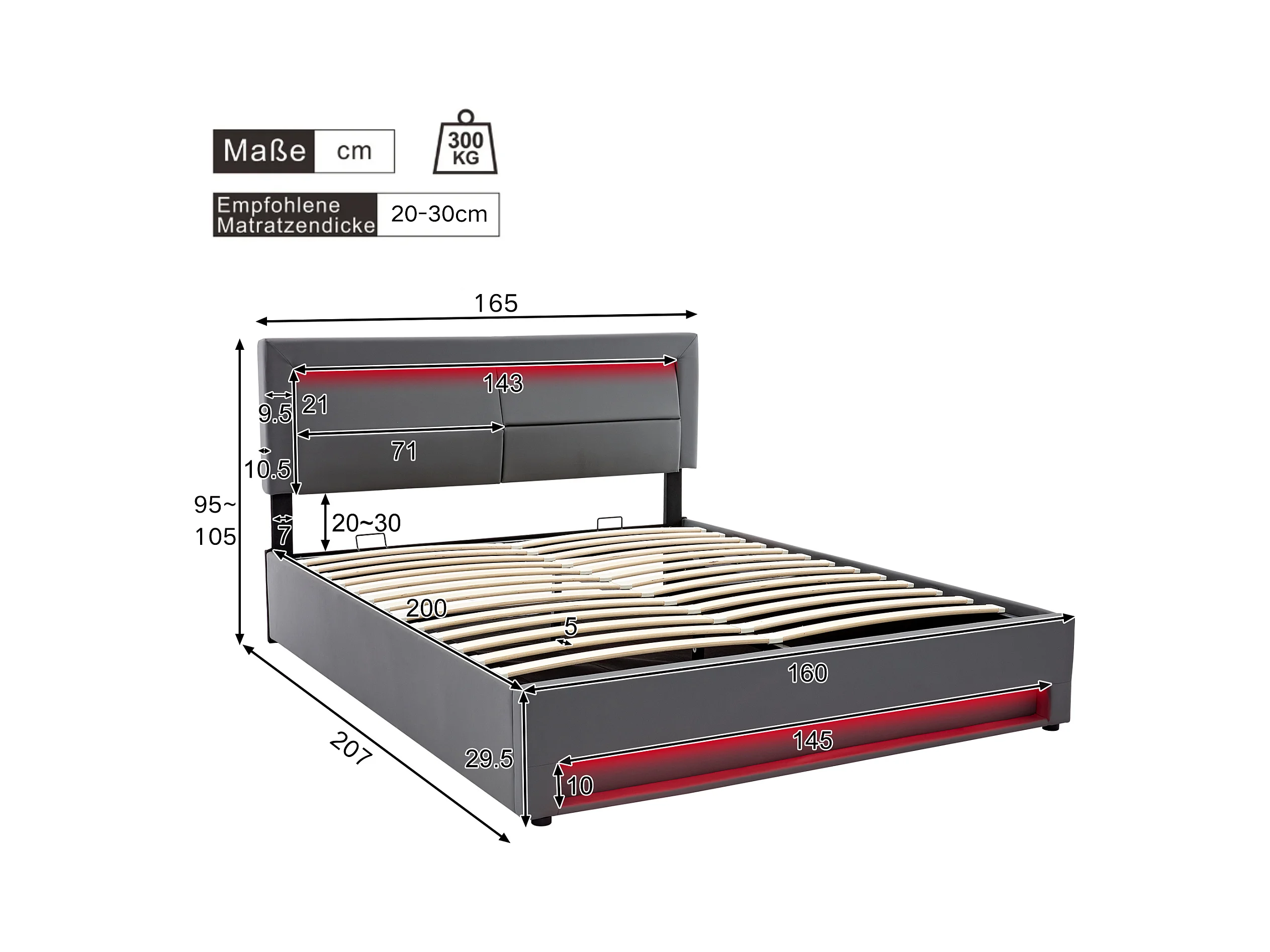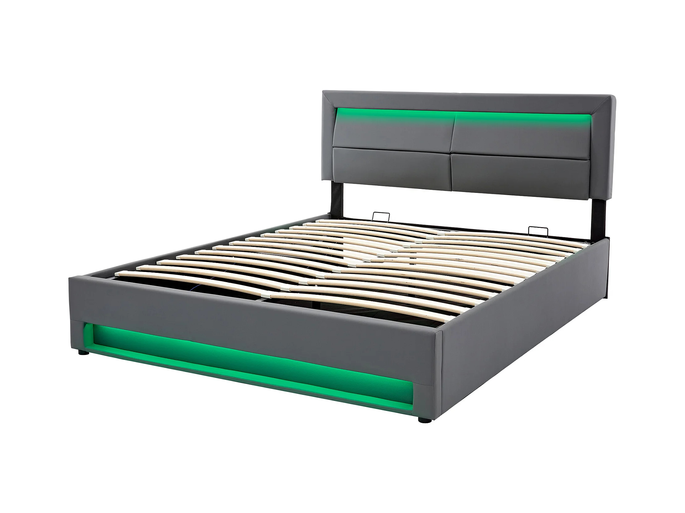 Cama de matrimonio 160x200 PU gris con LED, canapé hidráulico, cabecero regulable y USB