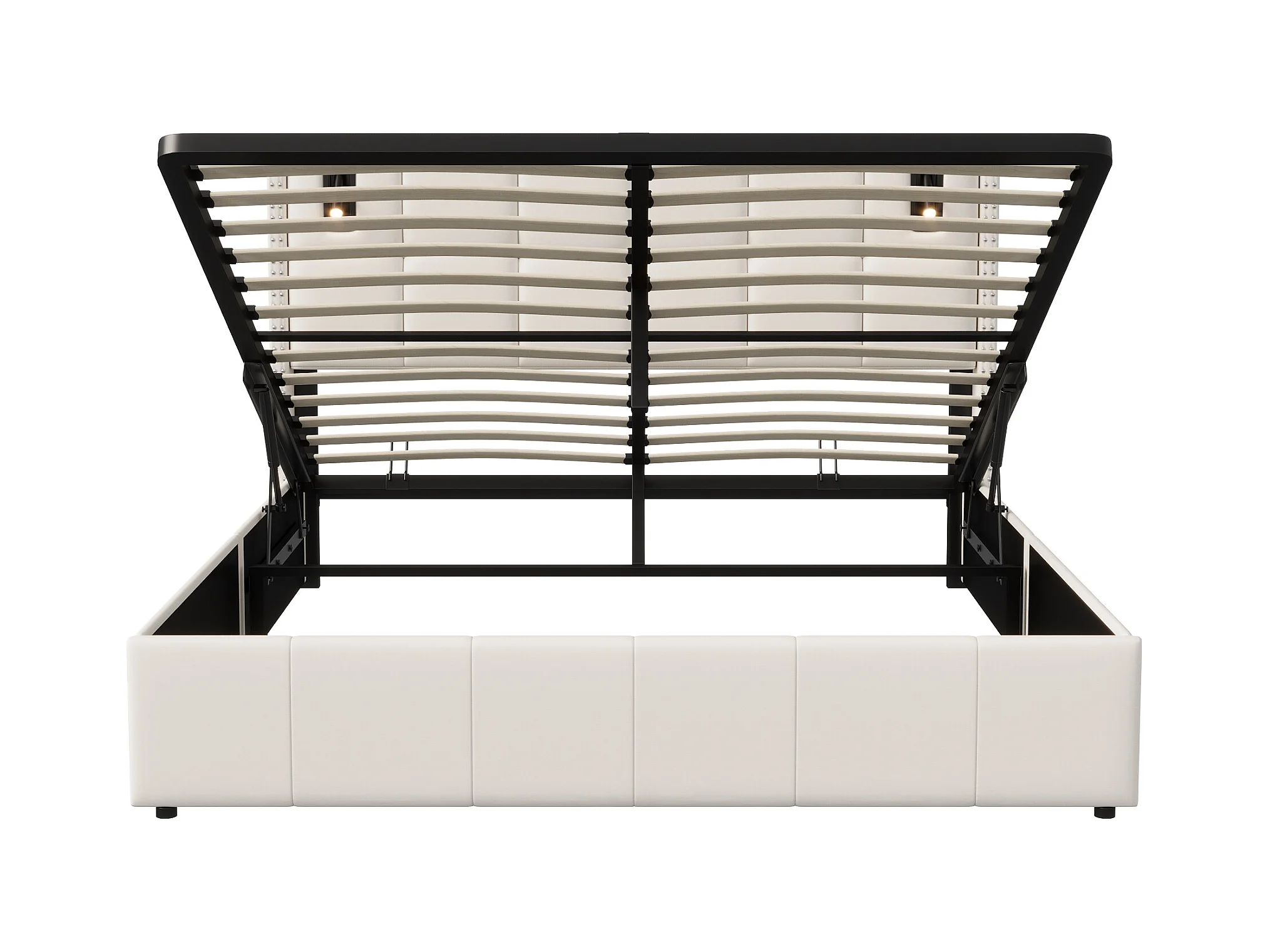 Cama de 160 x 200 cm con almacenaje, USB y tipo C, tapizada con somier de láminas, color beige