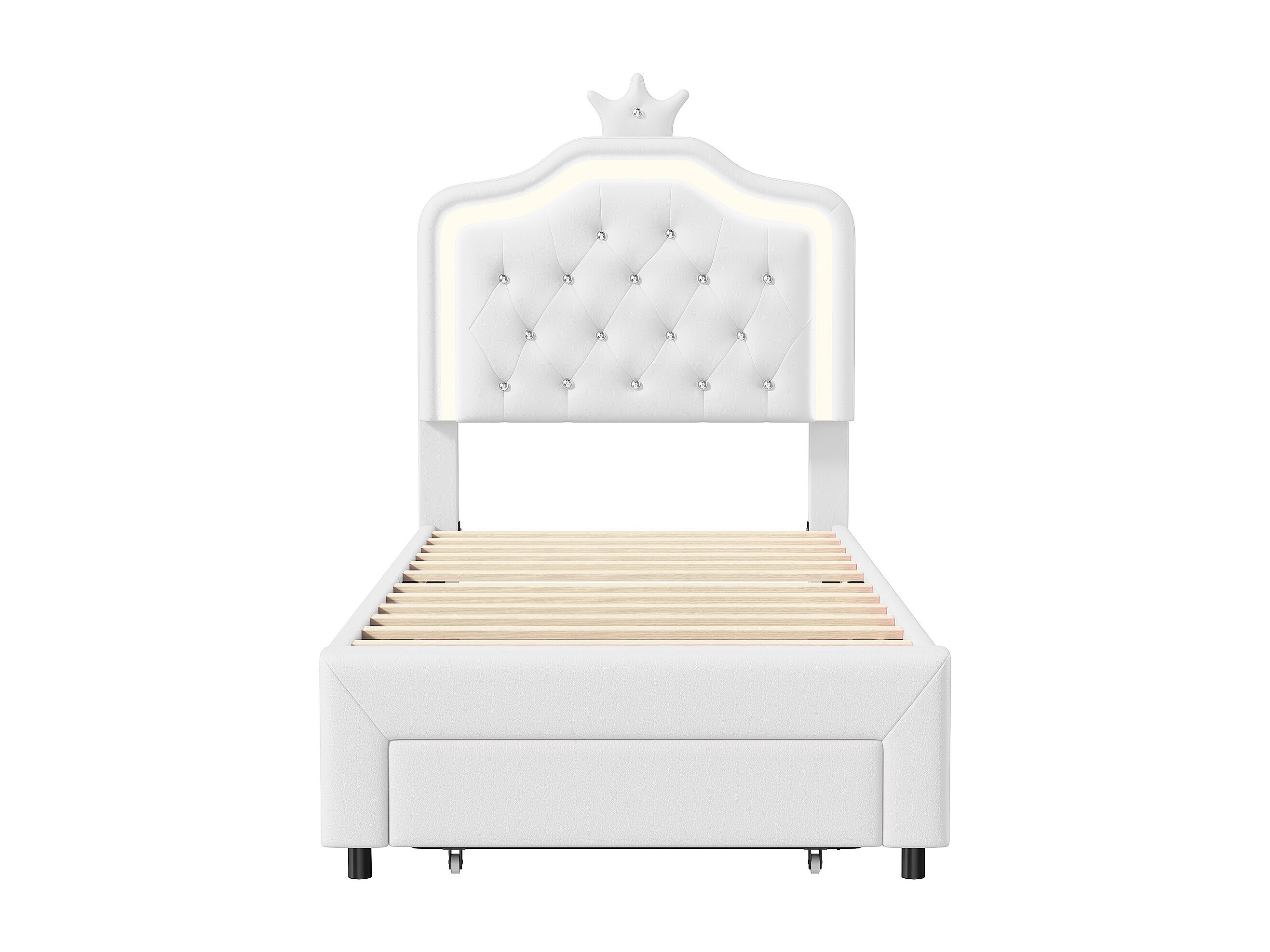 Cama tapizada 90x200 cm, con cajones, LED, con somier y respaldo, color blanco