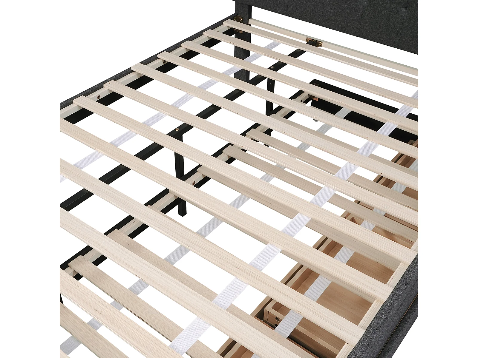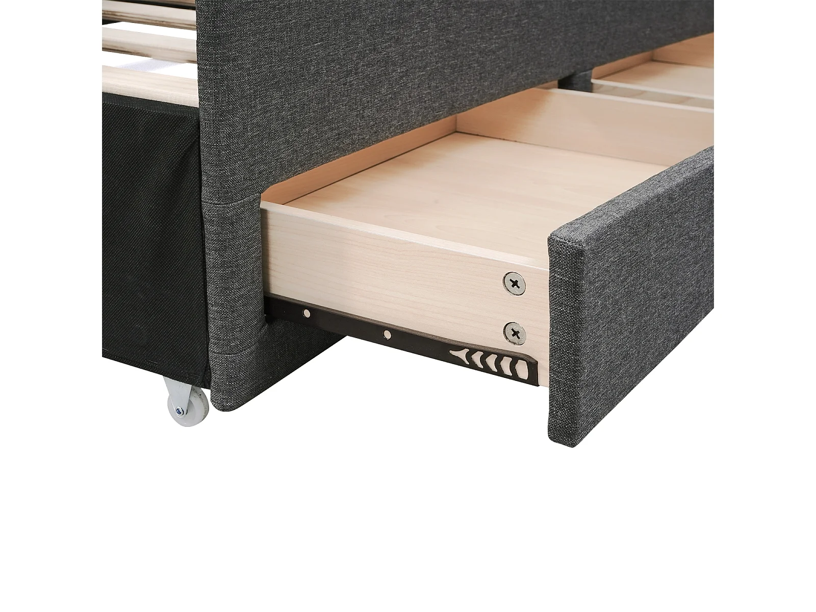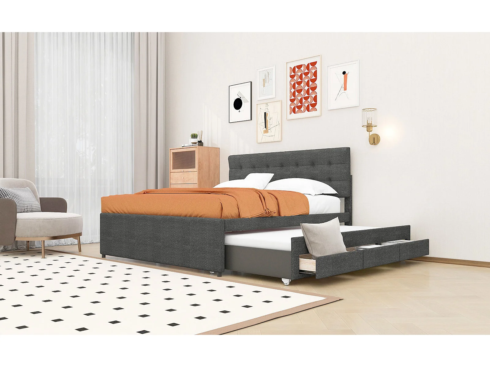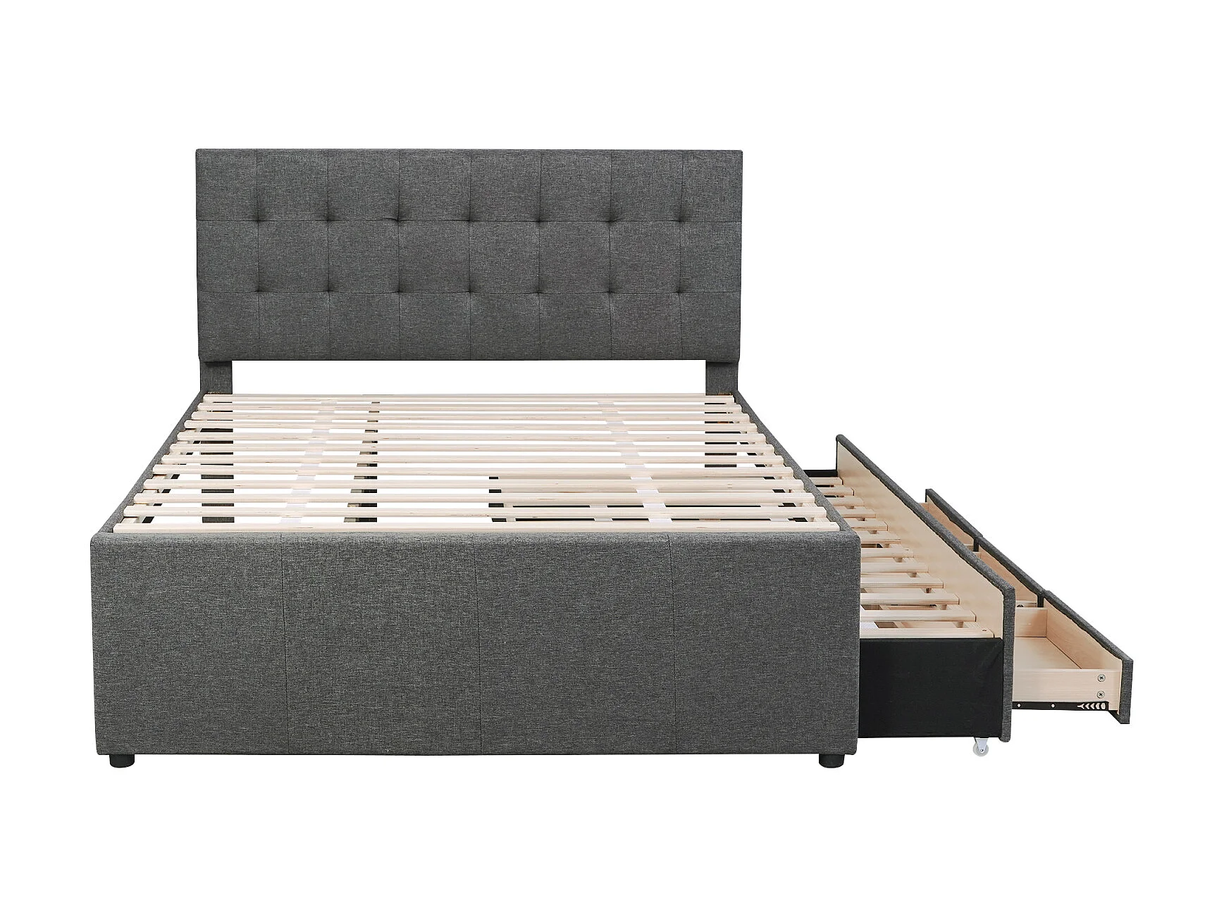 Cama tapizada, cama doble, cama familiar, cama de matrimonio con tres cajones, cama nido, cabecero regulable, gris, 140x200cm