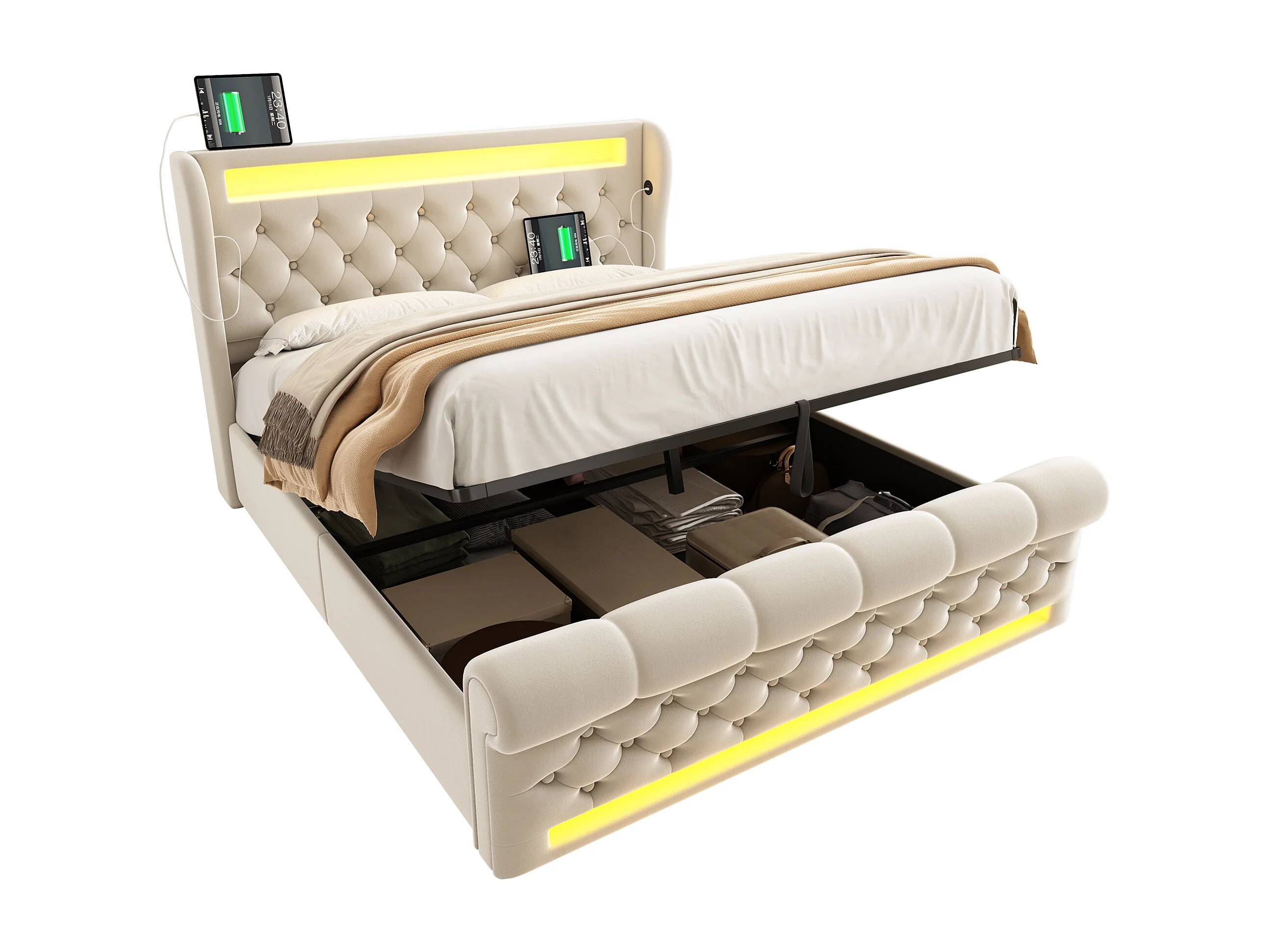 Cama tapizada con almacenaje 140x190cm - con LED - con puertos USB y Type-C - Terciopelo - Beige