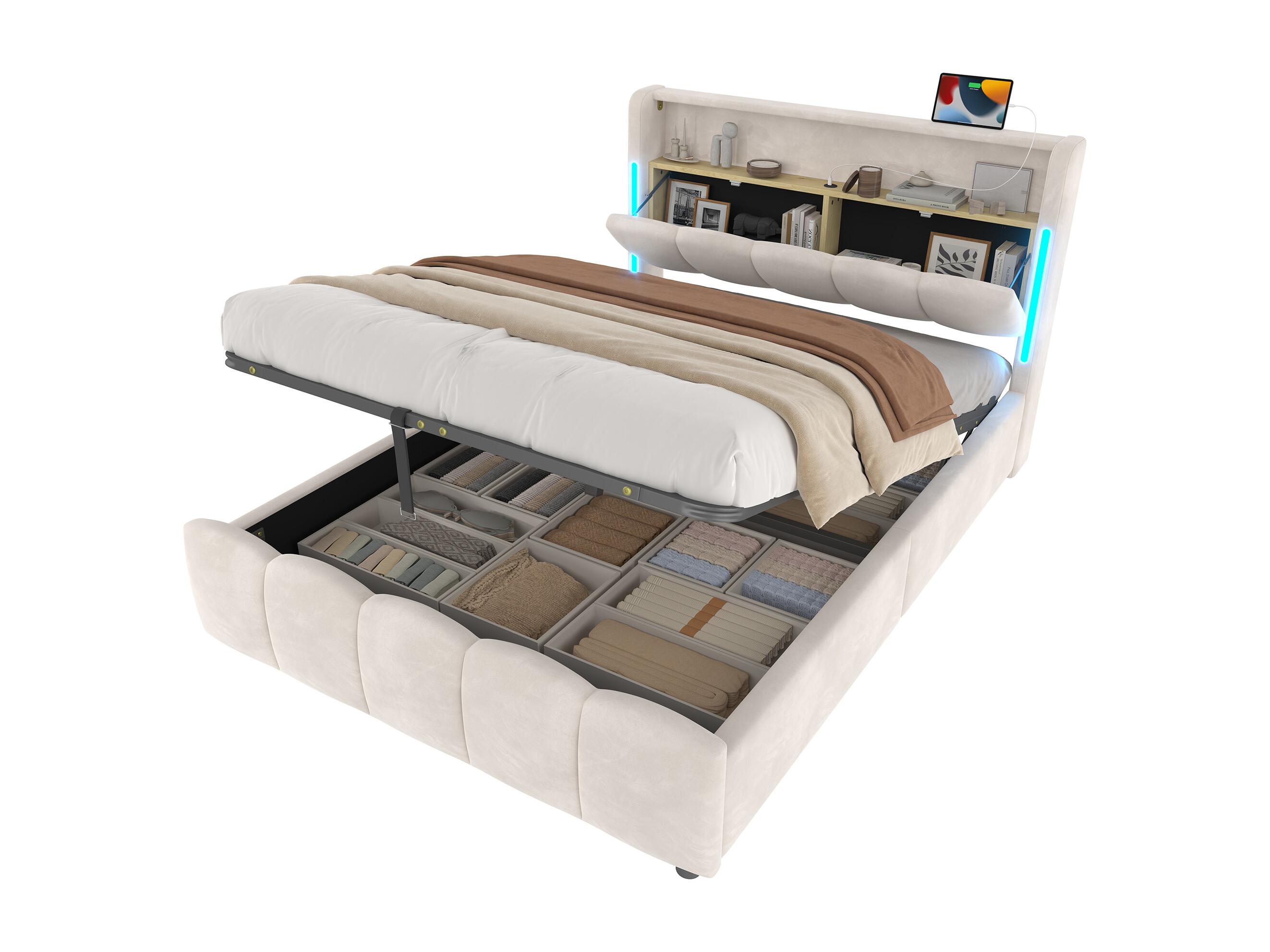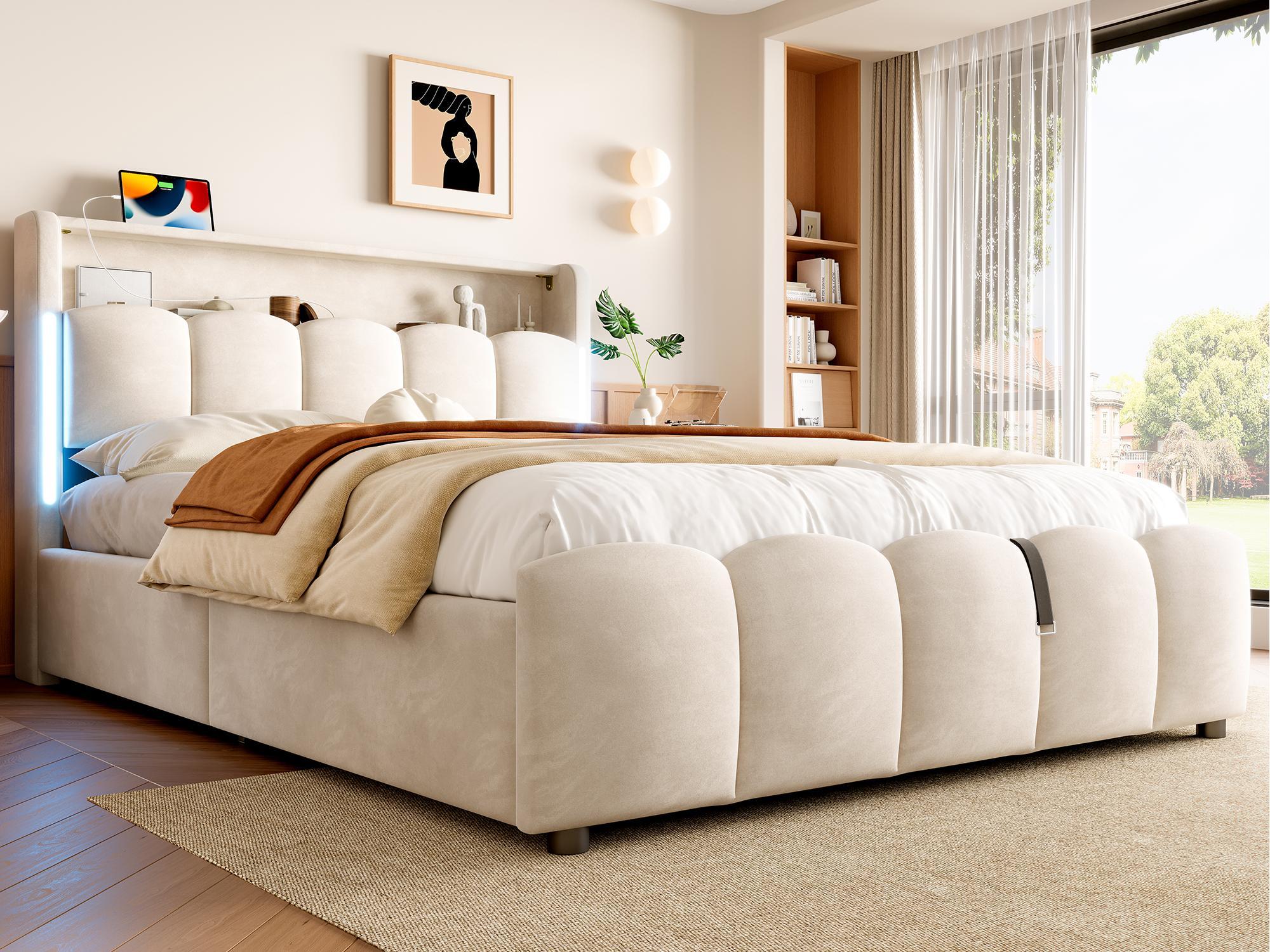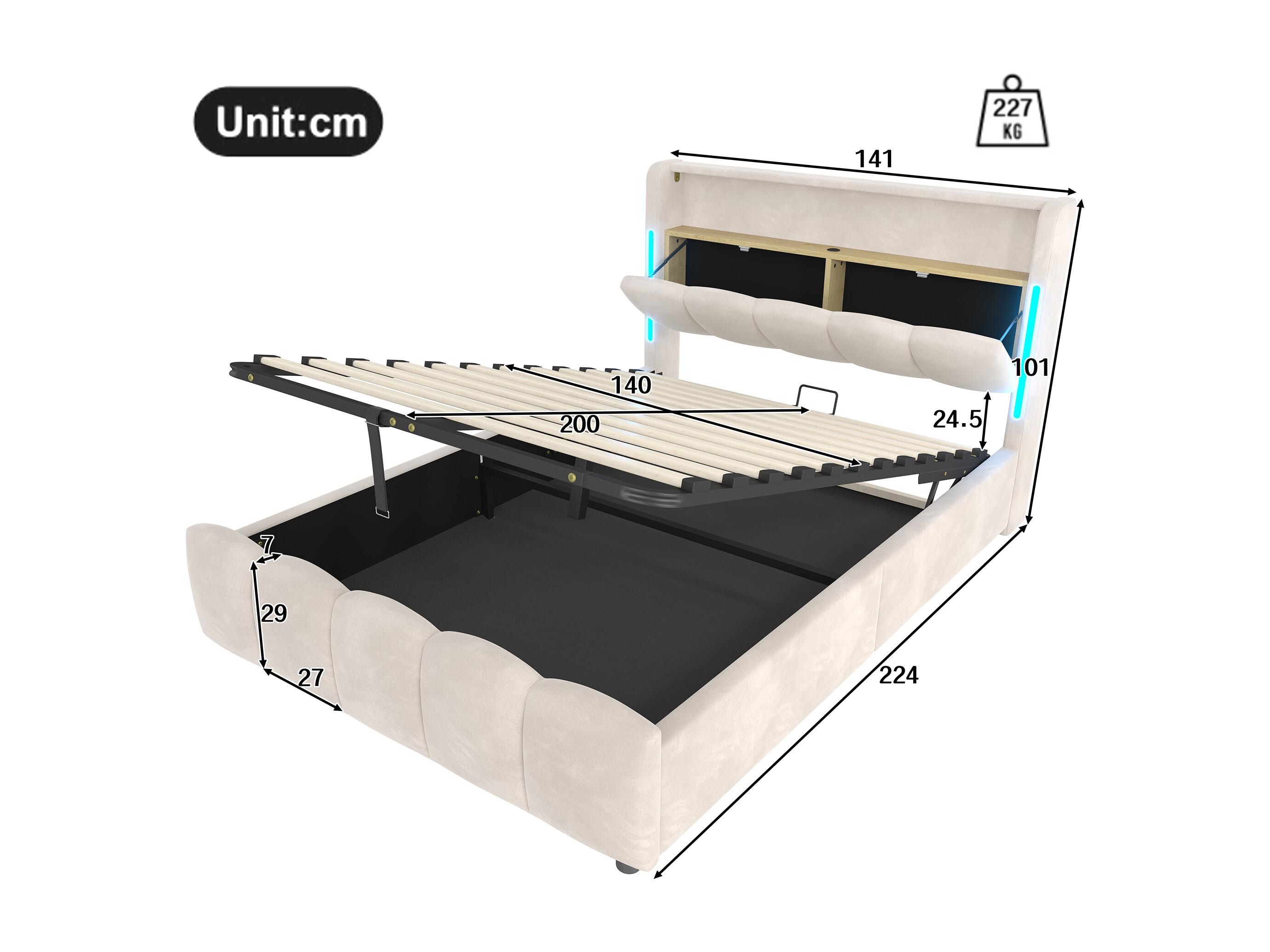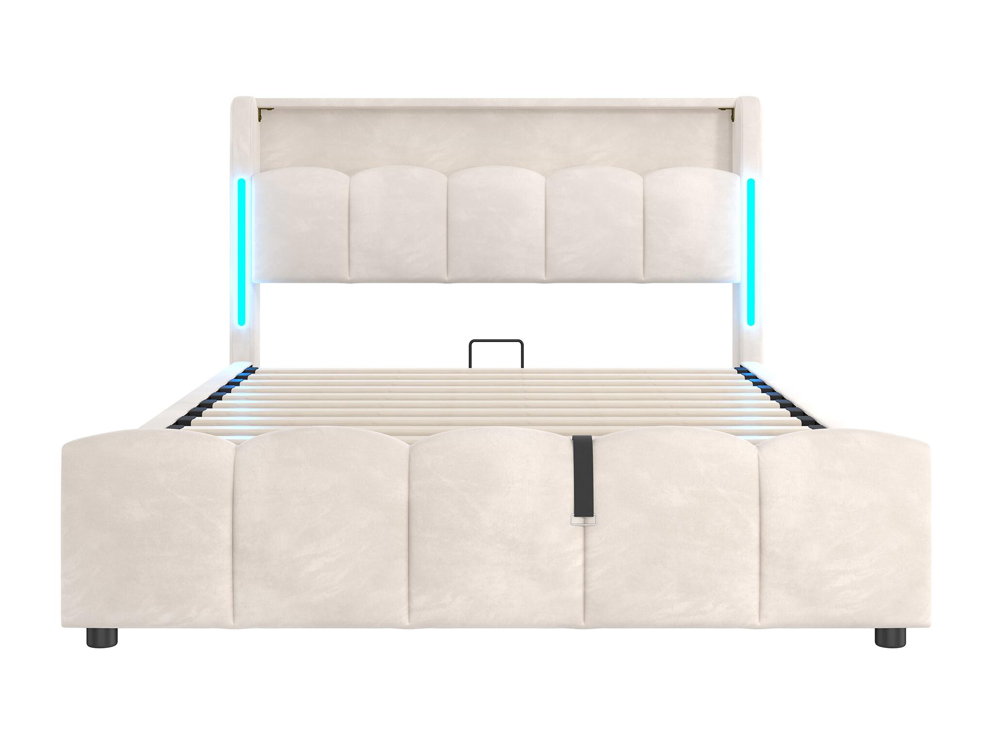 Cama tapizada con almacenaje 140x200 cm - con iluminación LED - con puertos USB + Type-C - terciopelo - beige (colchón no incluido)