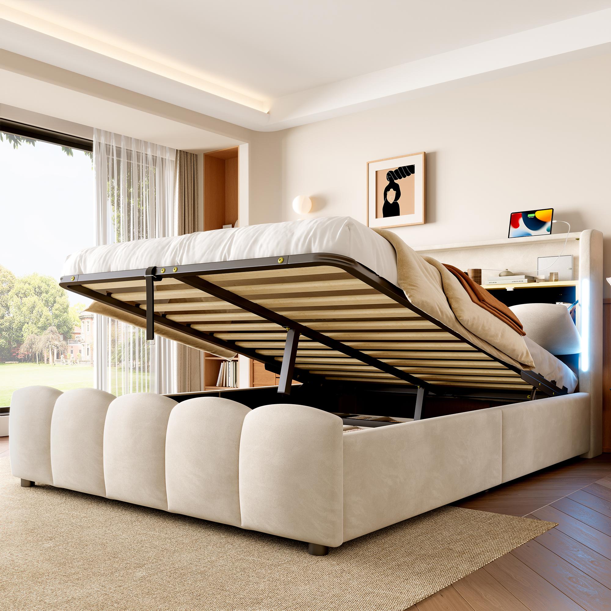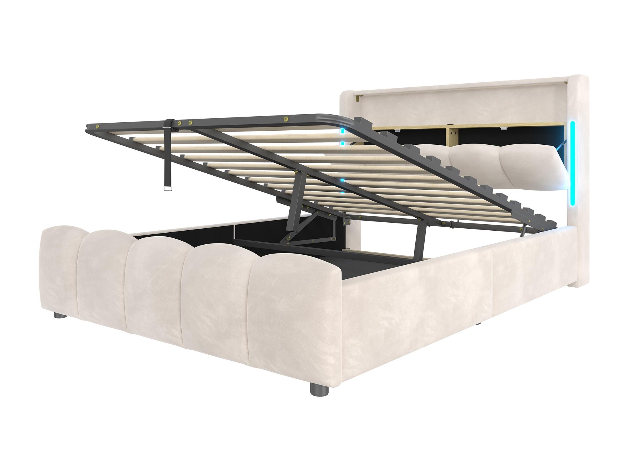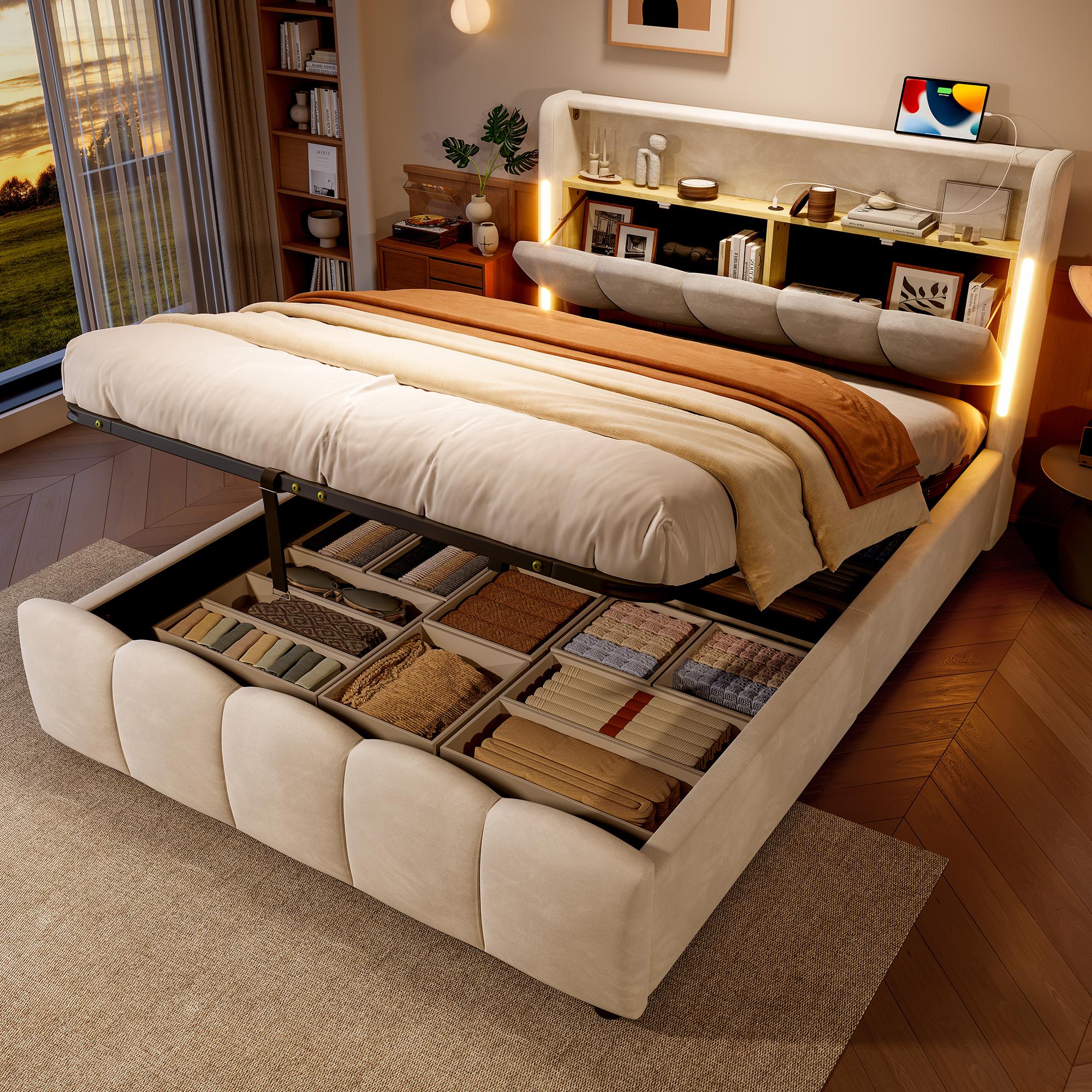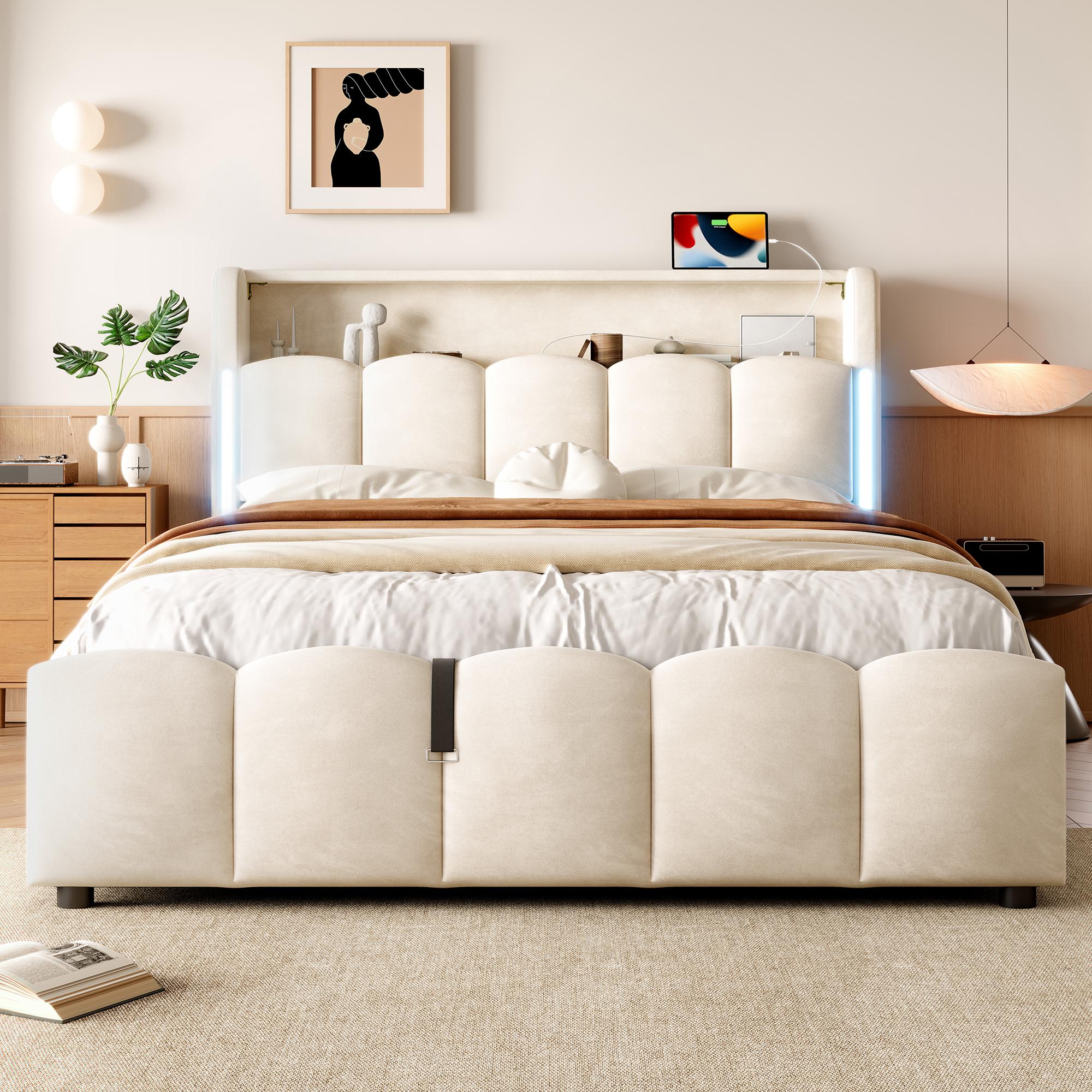 Cama tapizada con almacenaje 140x200 cm - con iluminación LED - con puertos USB + Type-C - terciopelo - beige (colchón no incluido)