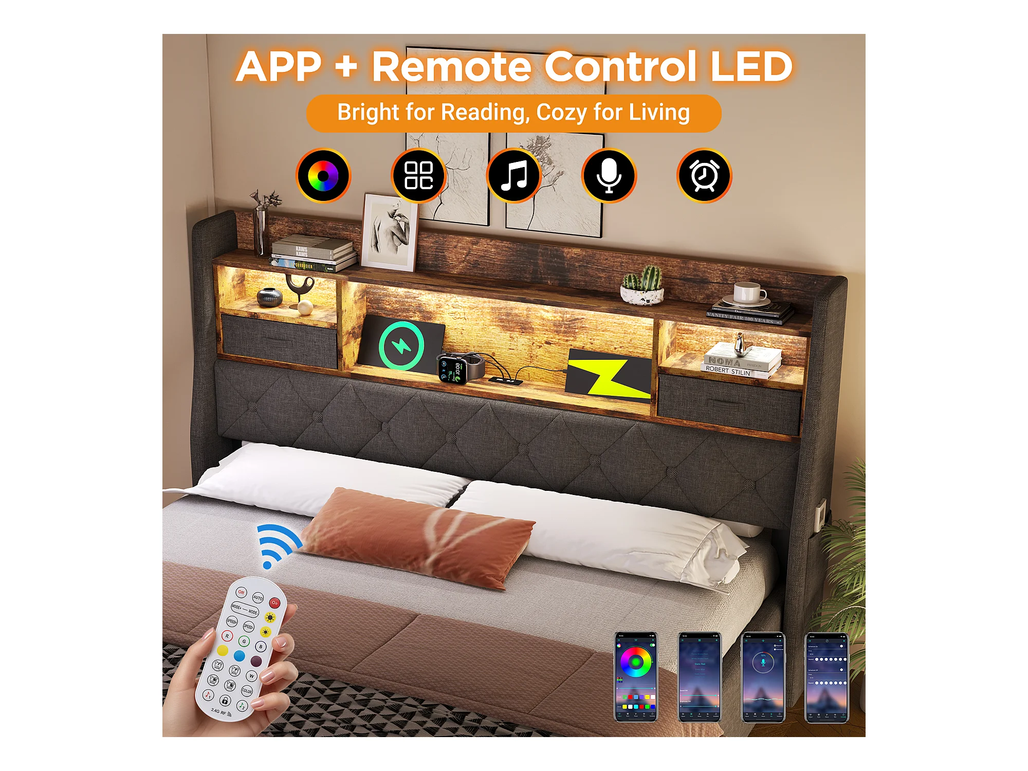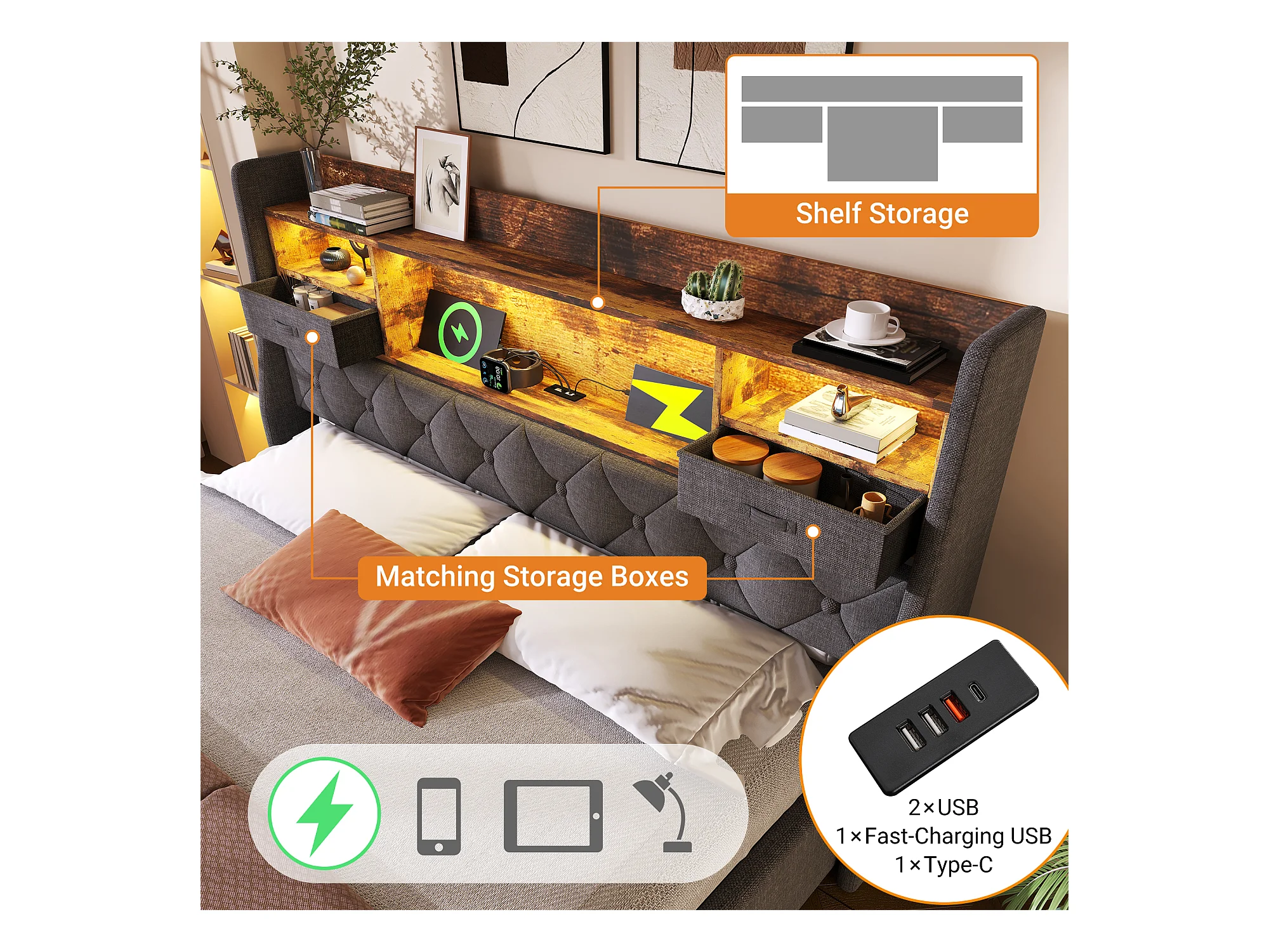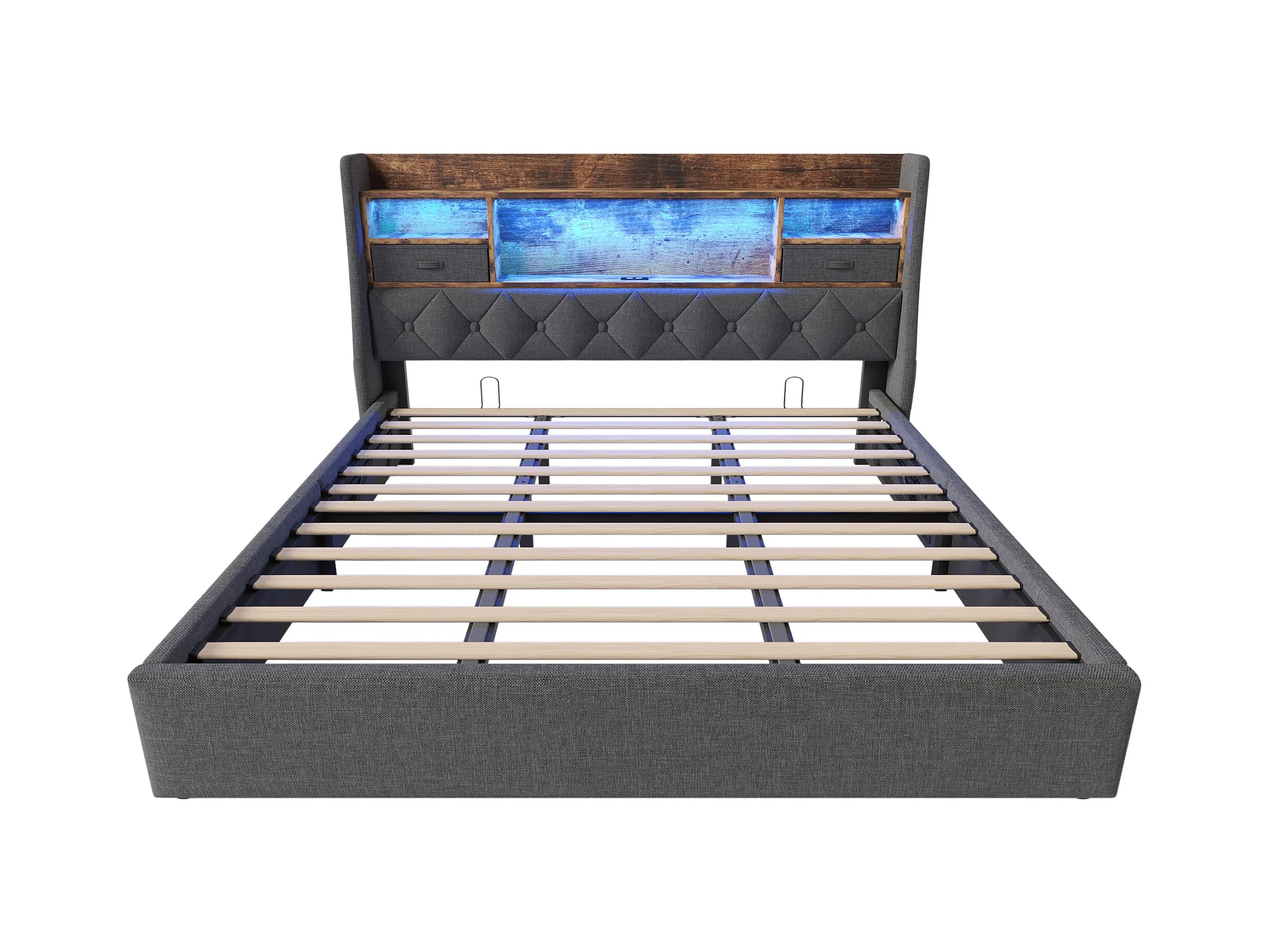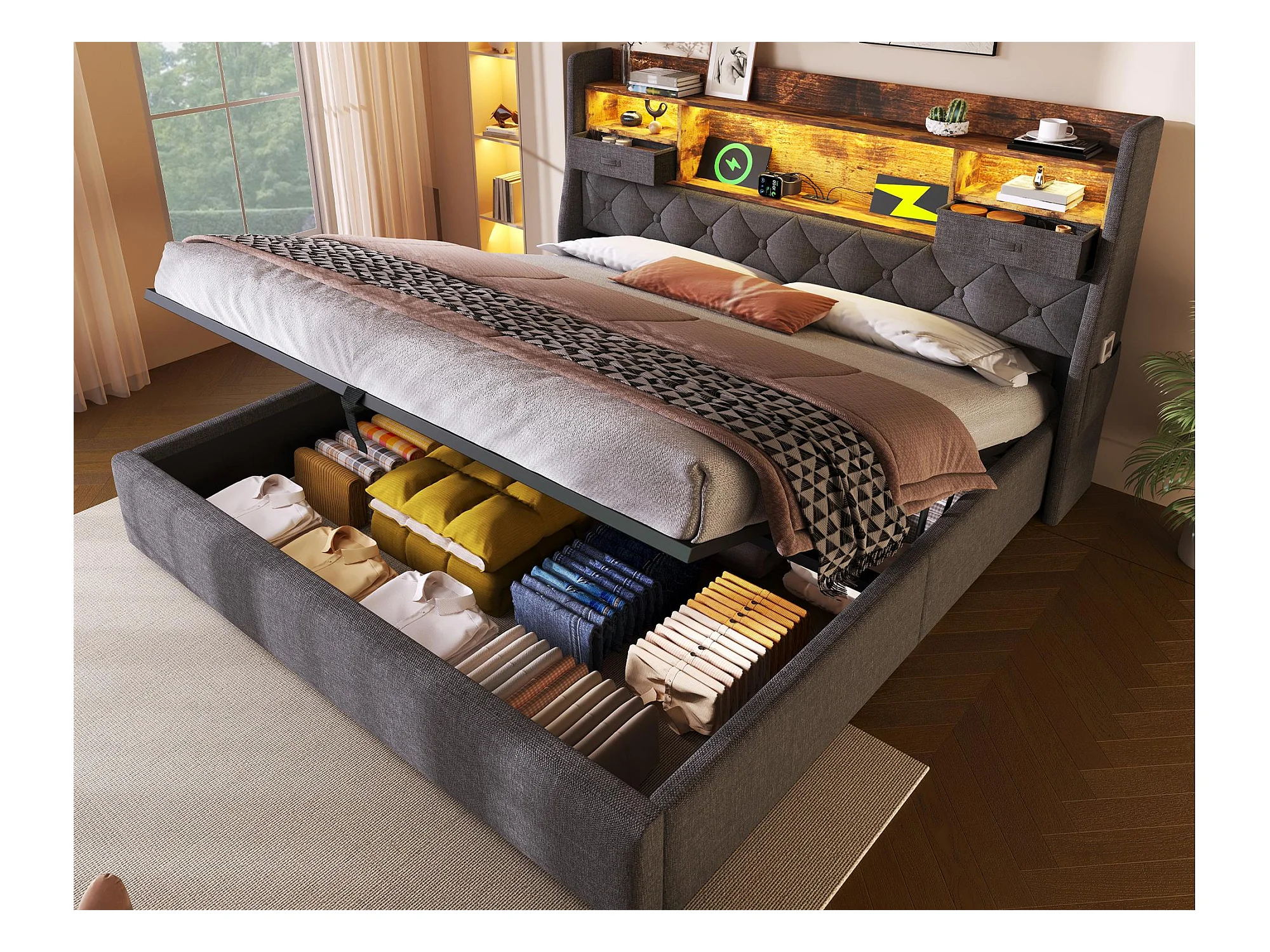 Cama tapizada con almacenaje 180x200cm - con LED - con 4 puertos de carga (USB/Type-C) - cabecero con almacenamiento - lino - Gris (sin colchón)