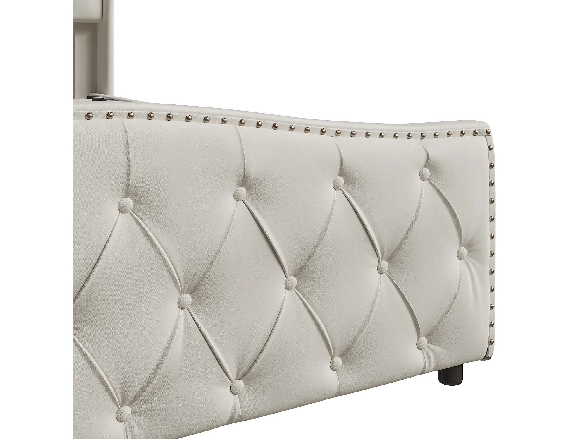 Cama tapizada 140x200 cm con somier de láminas y LED, con puerto USB y almacenaje, Beige