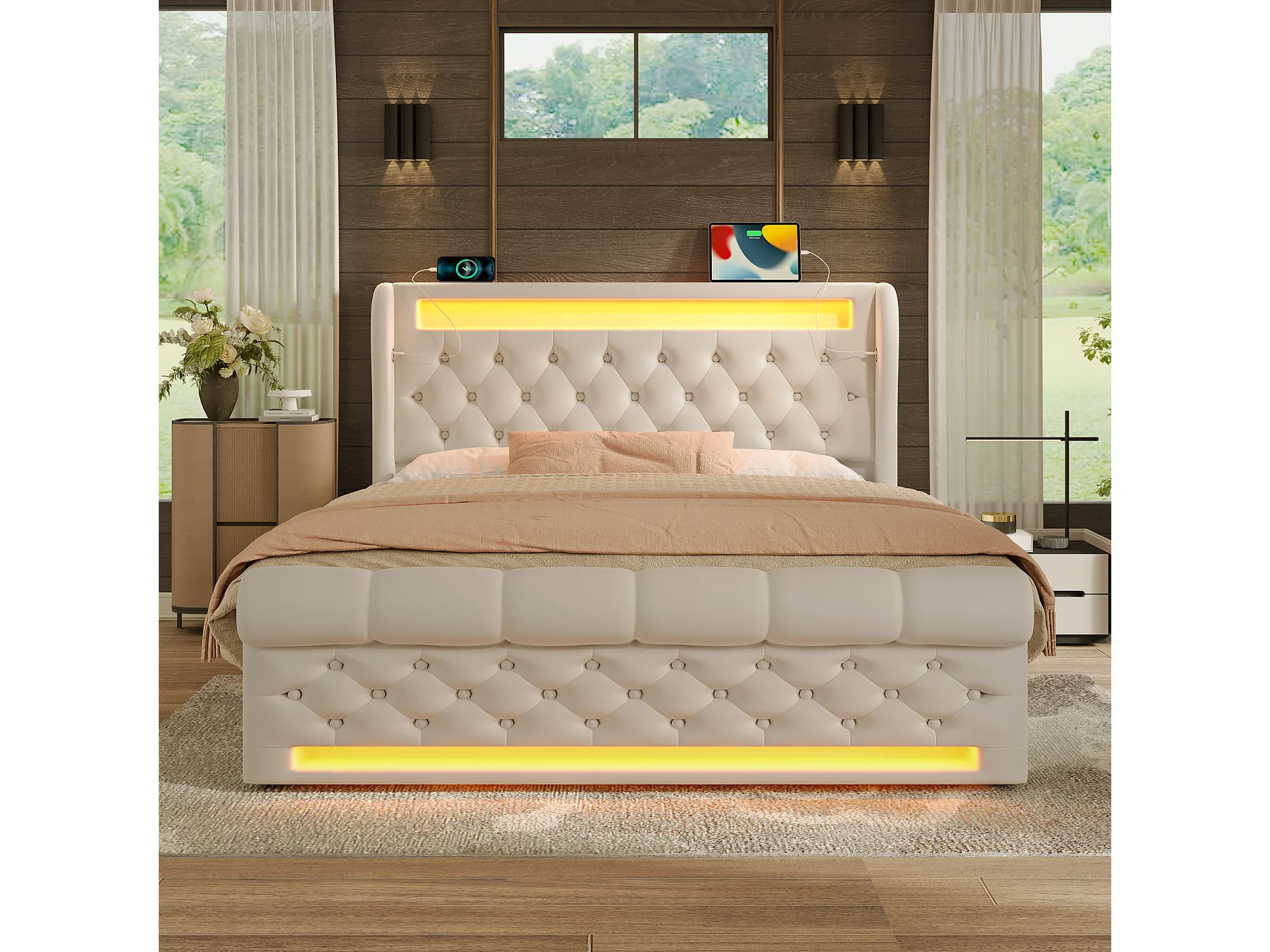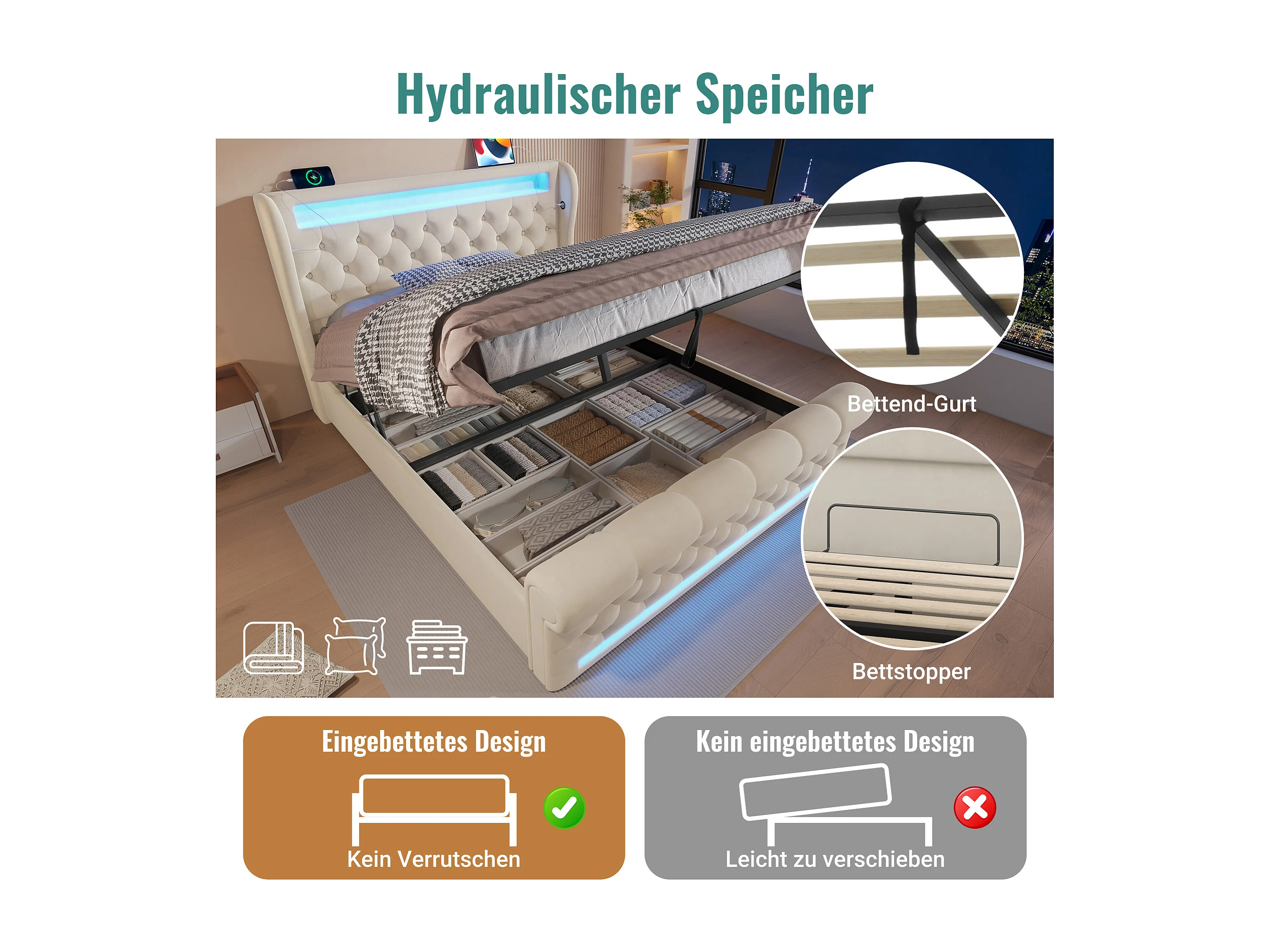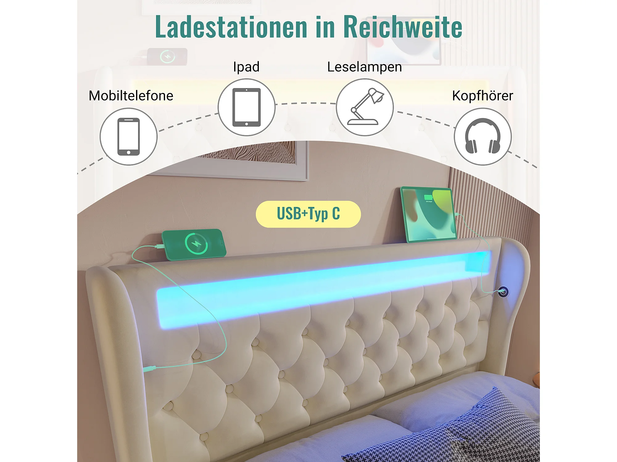 Cama tapizada de 160 x 200 cm con iluminación LED, cabecero con puertos USB y tipo C, canapé hidráulico, terciopelo beige (220 x 166 x 110 cm)