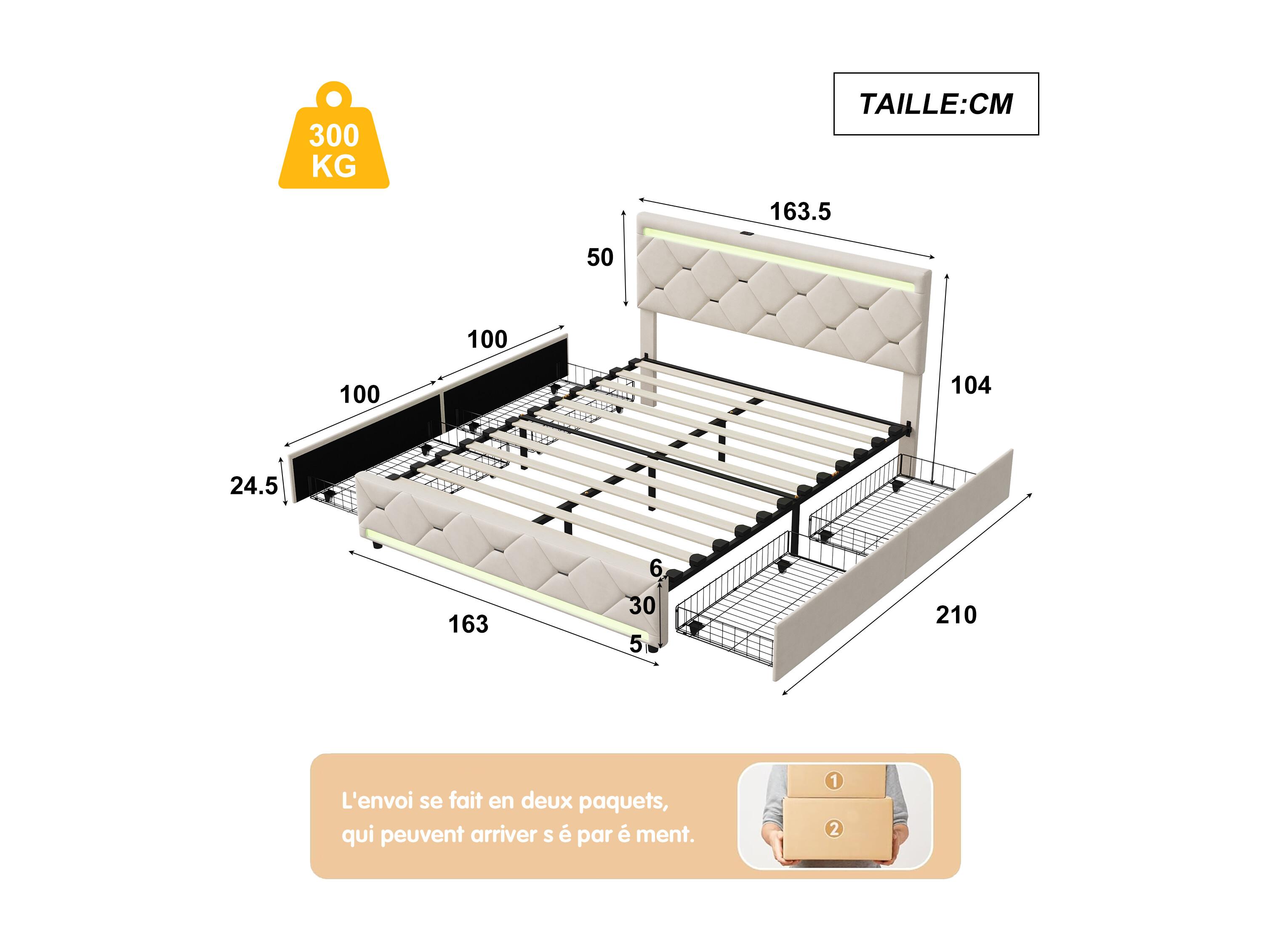 Cama tapizada de 160 x 200 cm con LED, estructura de cama con cajones para adultos, terciopelo, color blanco