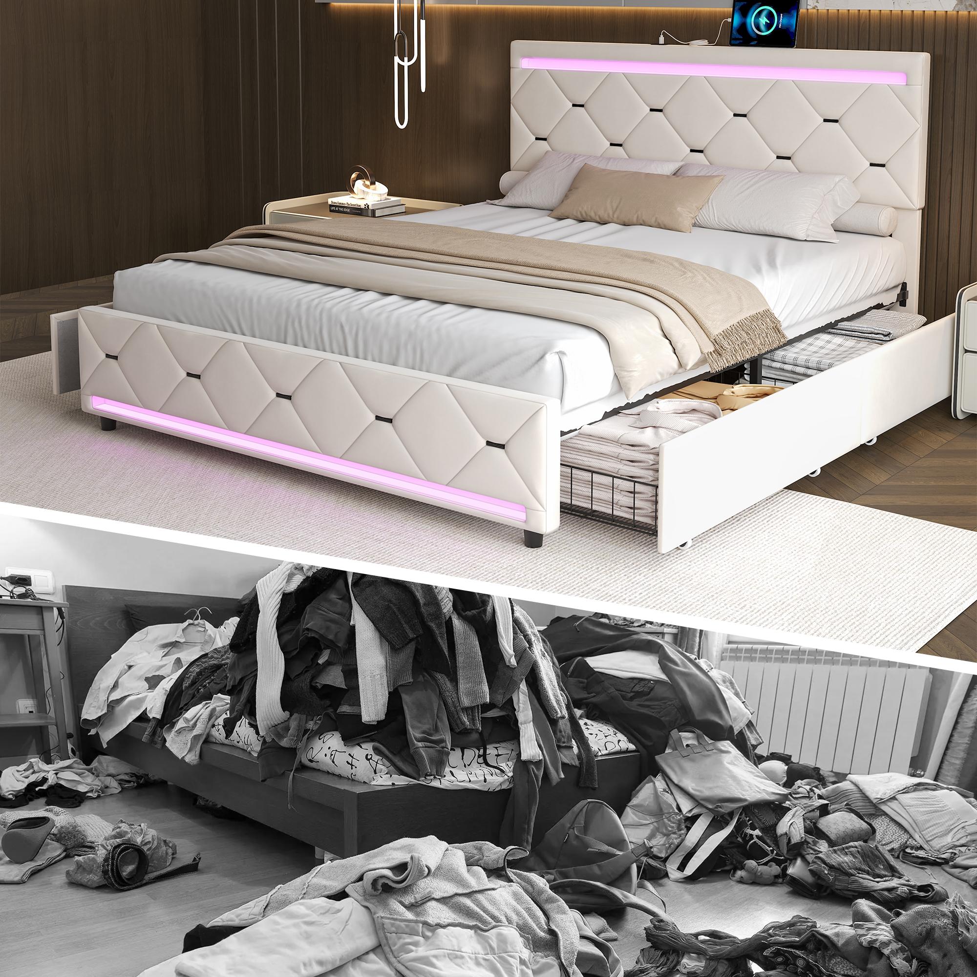 Cama doble de 160x200cm, con 4 cajones, somier y cabecero con varios espacios de almacenamiento, blanco