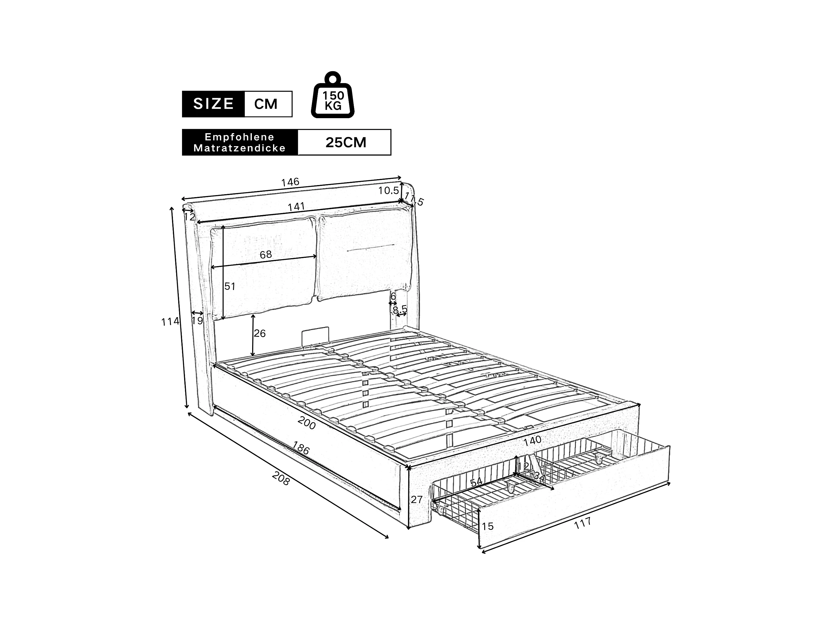 Cama tapizada LED 140x200 terciopelo gris oscuro con almacenaje hidráulico y cajones integrados