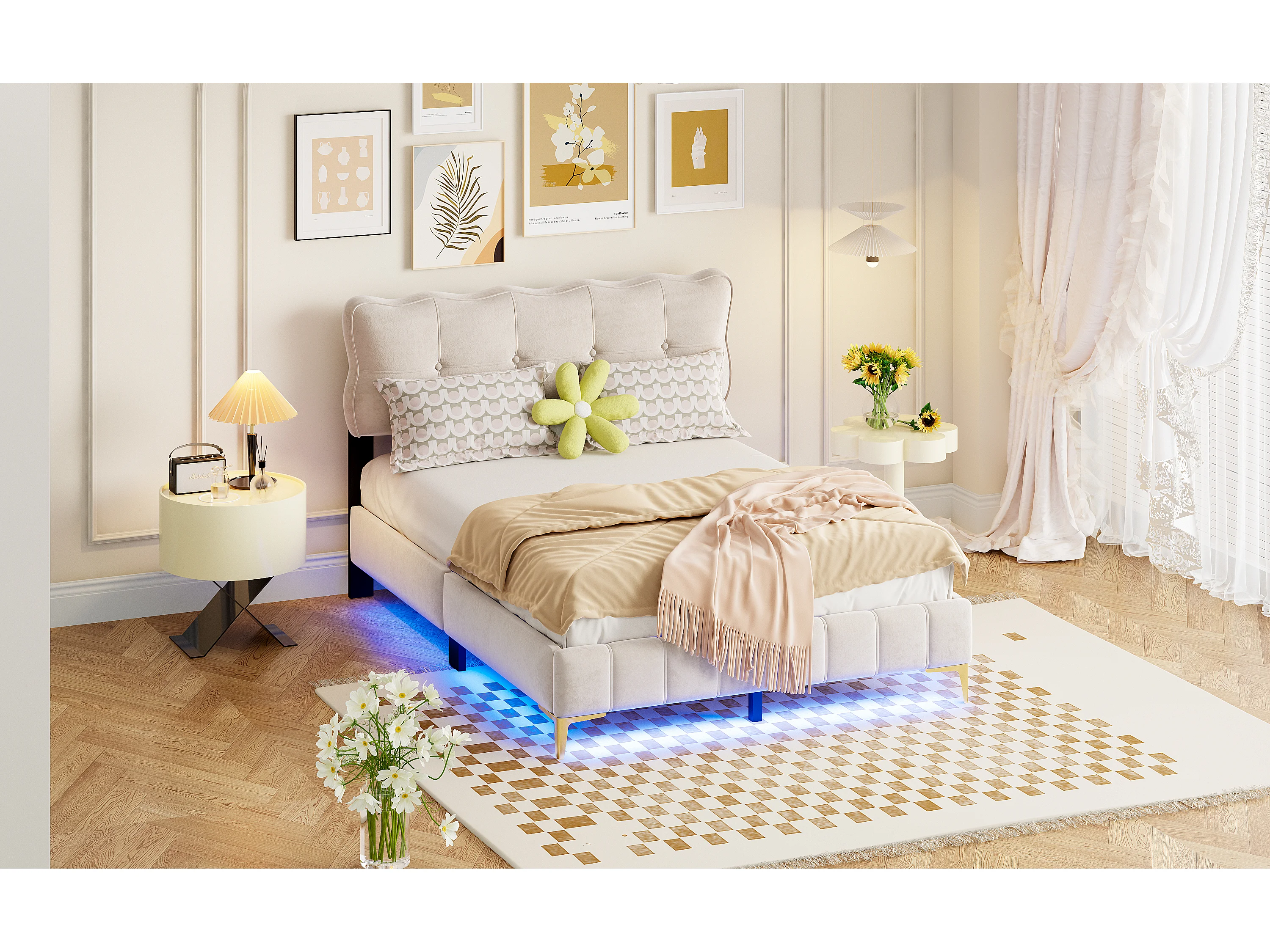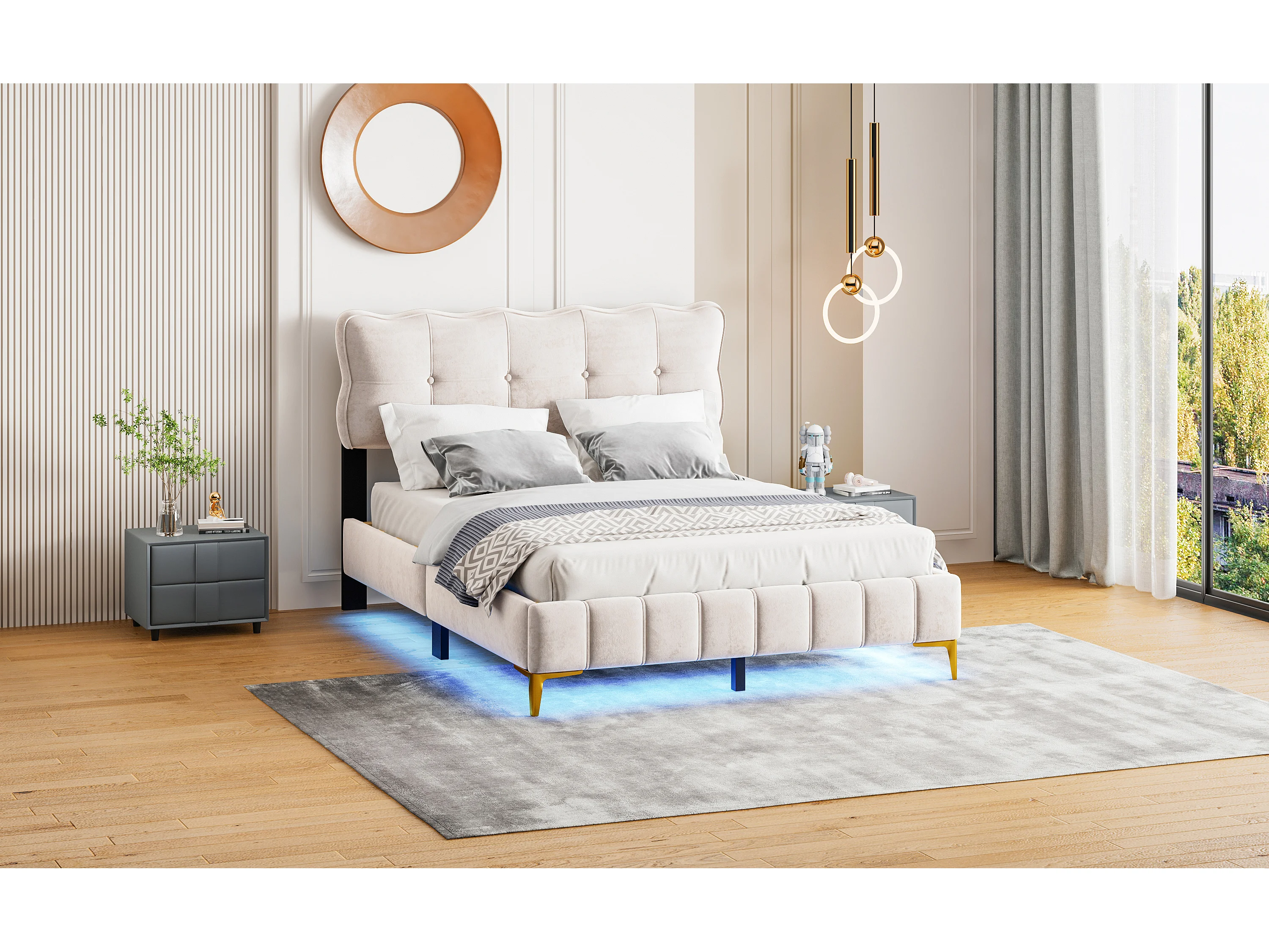 Cama tapizada LED, cabecero cómodo, terciopelo beige, patas altas de metal (214x158x106,5cm)