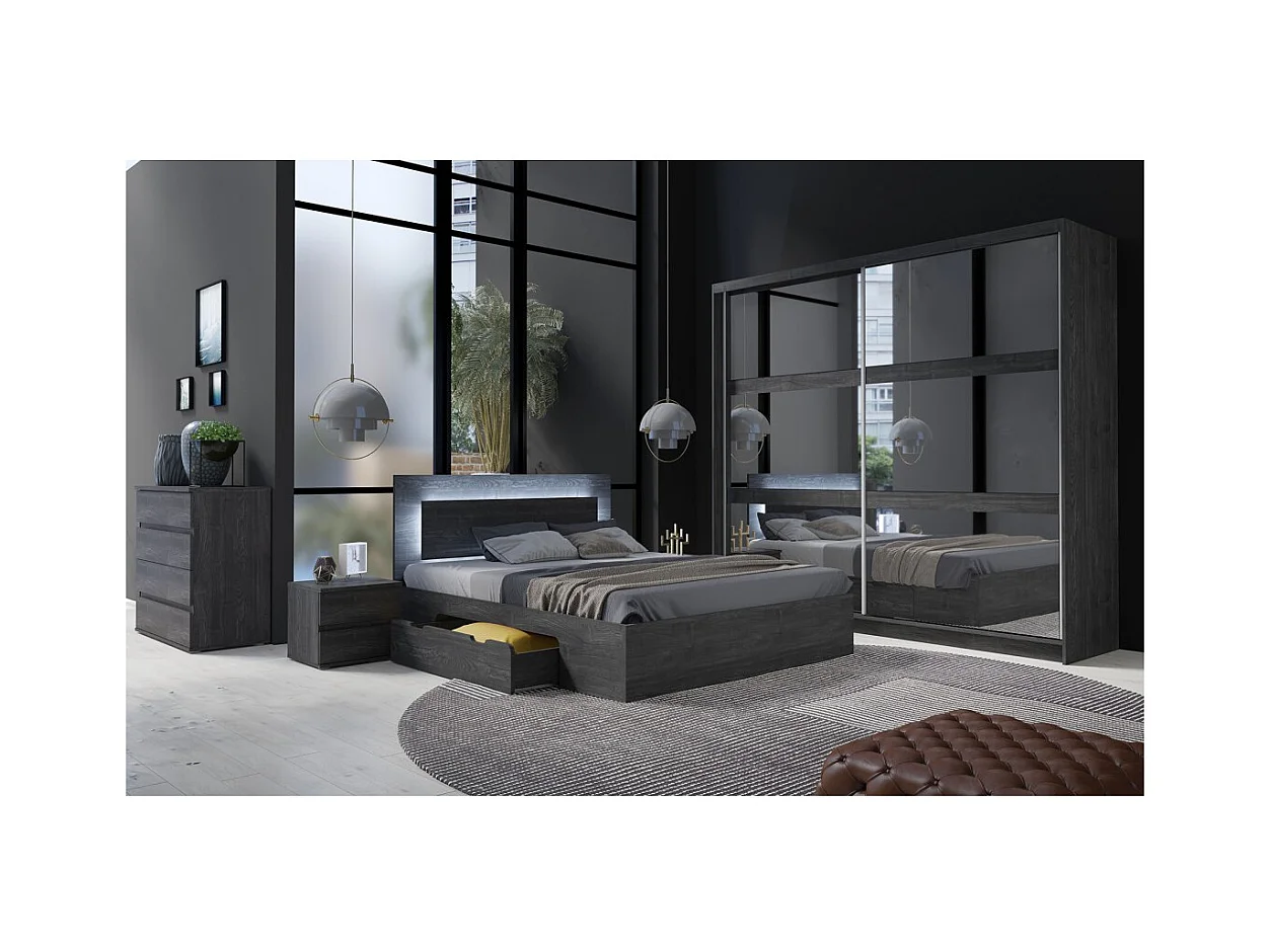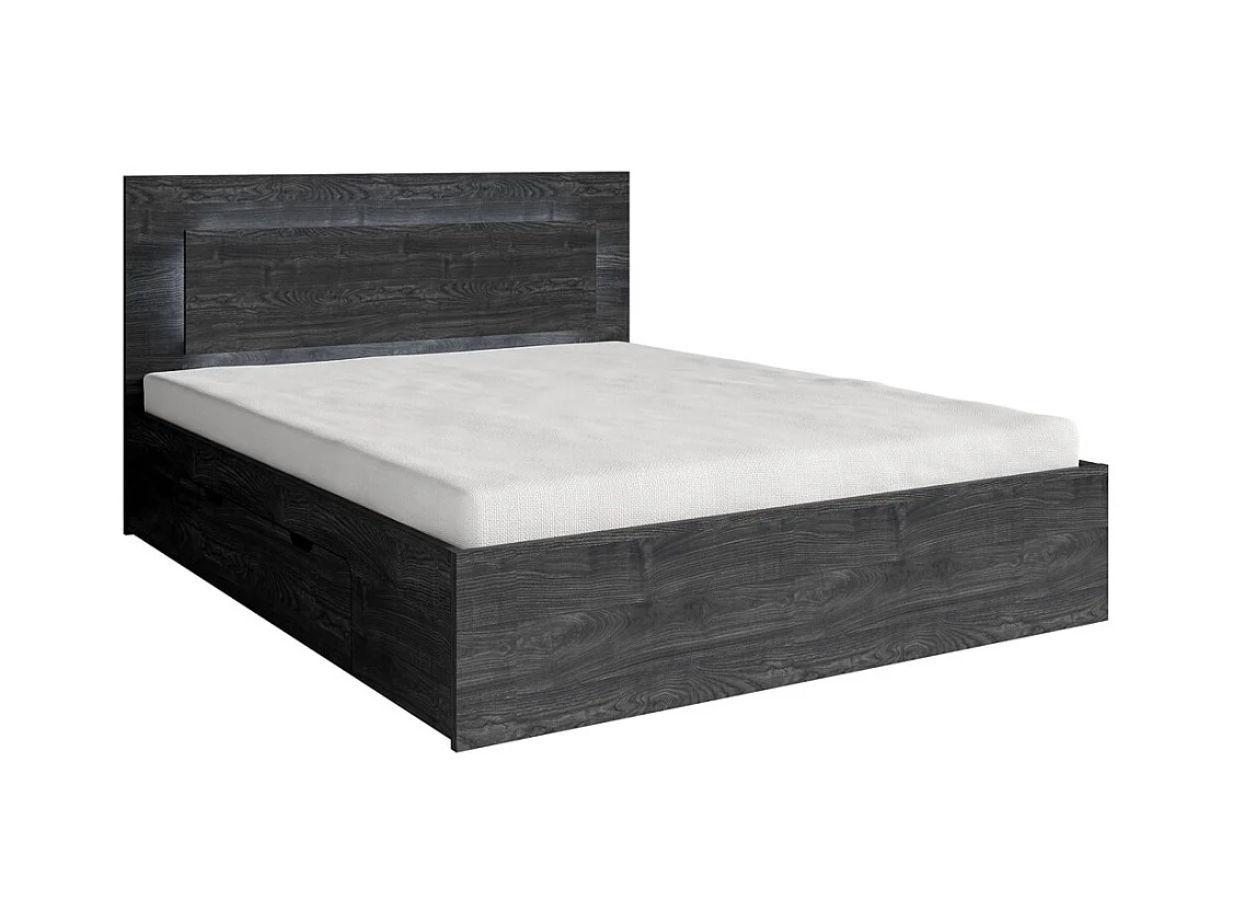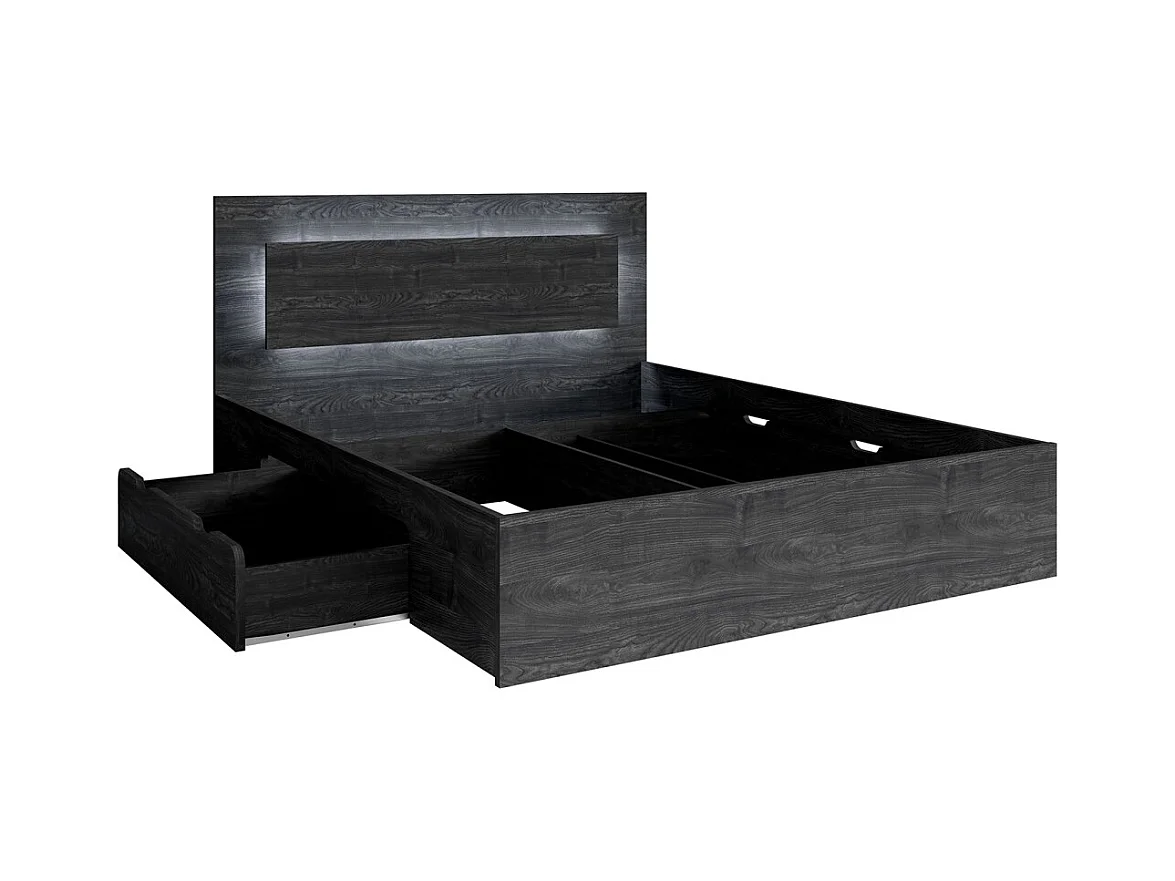 Cama VELTIS 180x200 cm con cabecero LED - Color fresno negro - Somier y colchón no incluidos
