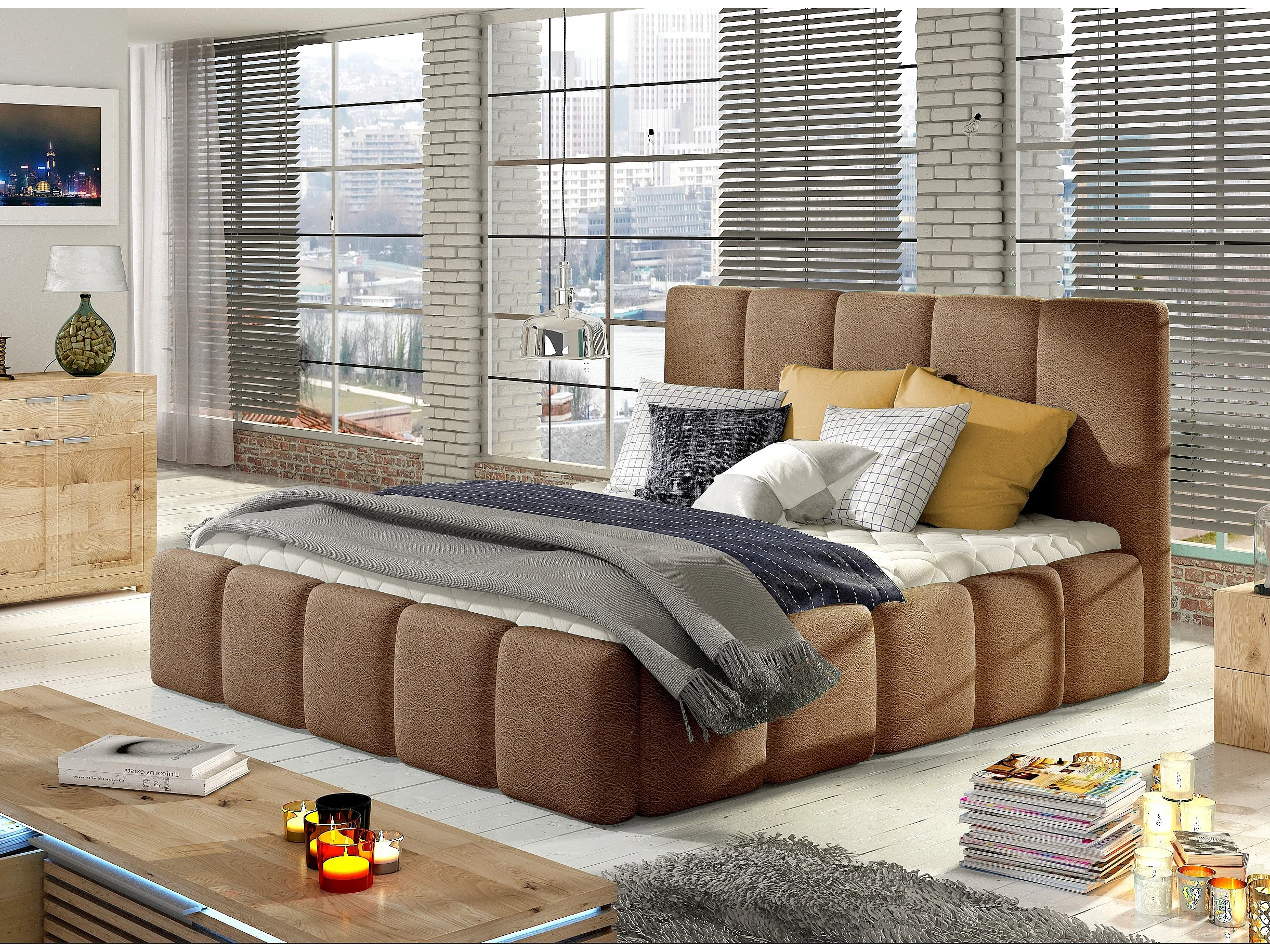 Cama Vika moderna tapizada en terciopelo.-Marrón claro-160x200 cm-Versión Con base