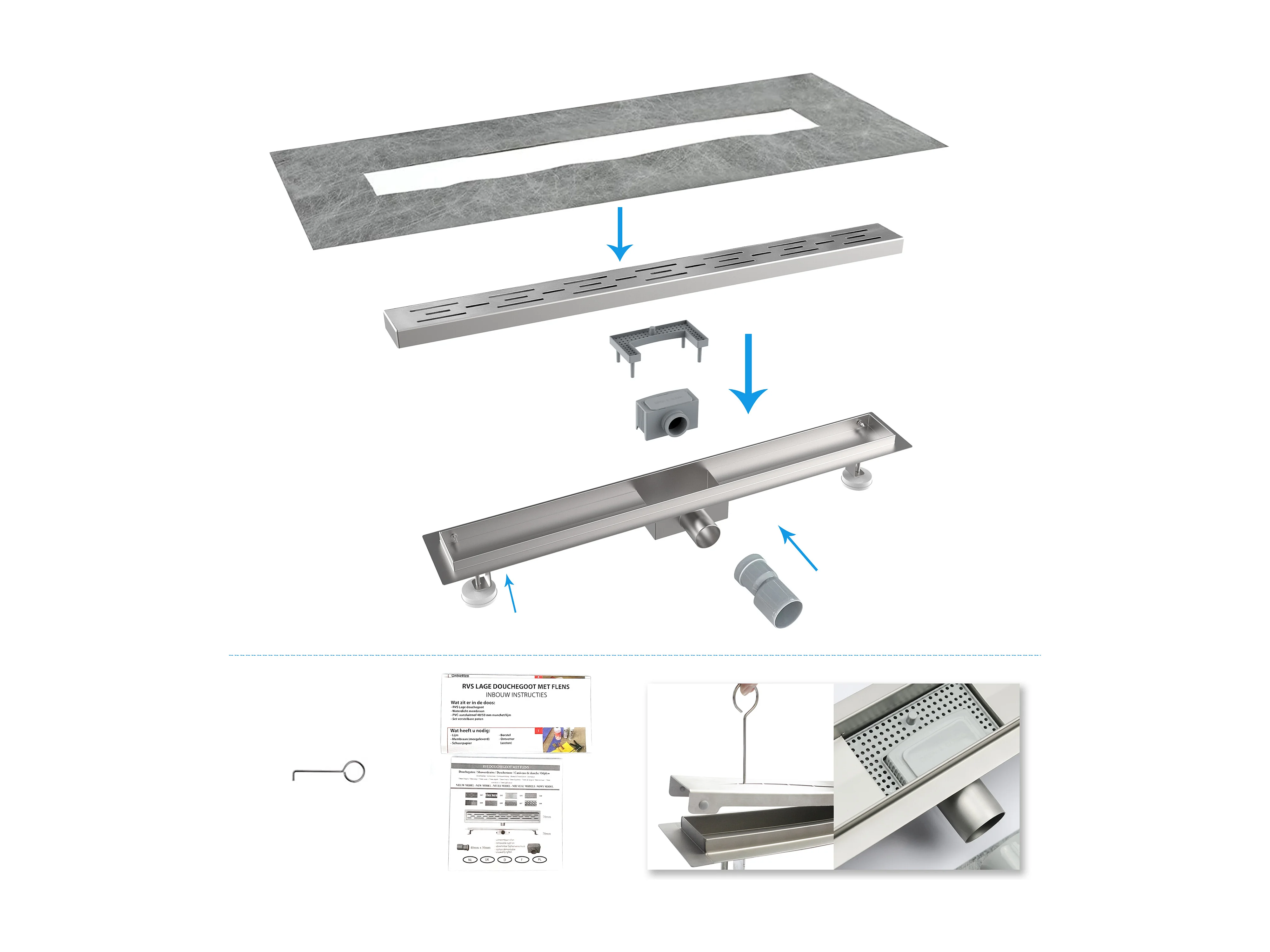 Canaleta de Desagüe 100cm Canaleta Plata ducha con rejilla antiolor y filtro de pelo