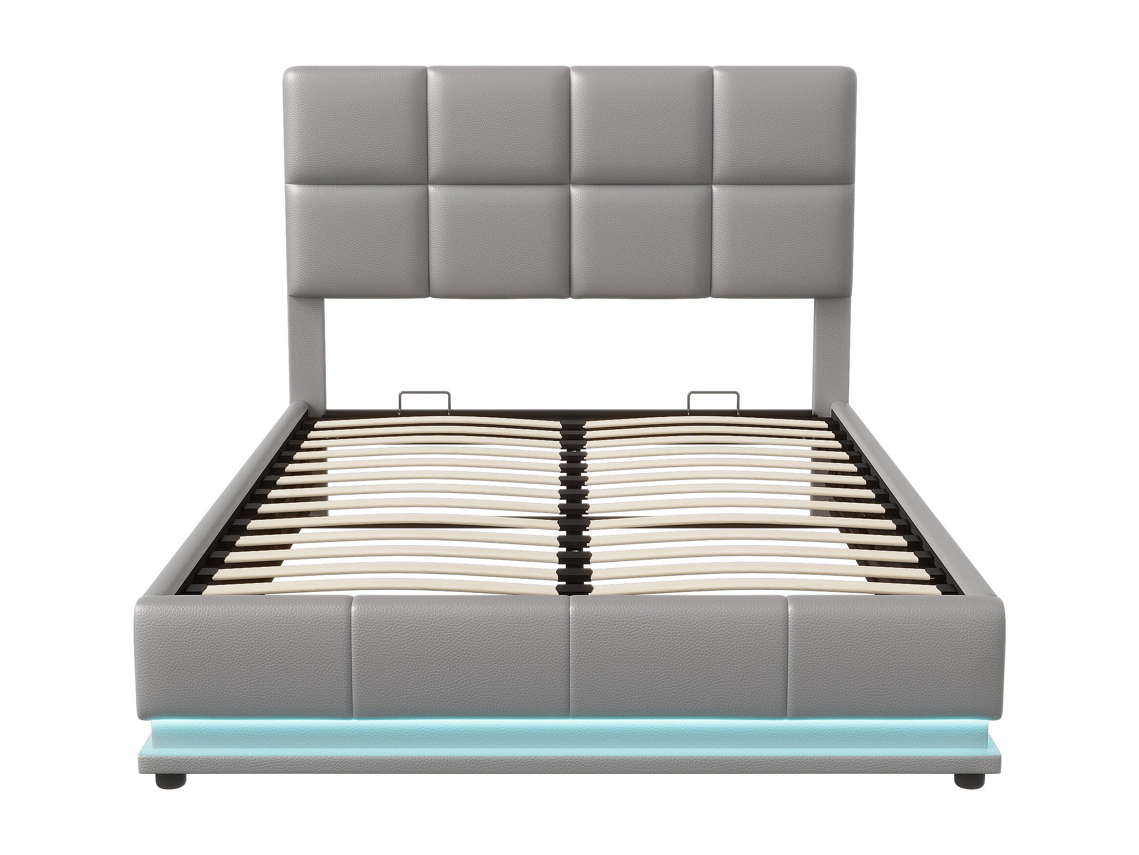 Canapé hidráulico LED 140x200 cm en polipiel gris con mando a distancia - Cama moderna con canapé, estructura metálica robusta, fácil de montar